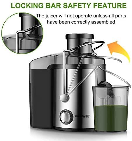 🍹HUMANIZED DESIGN: The locking arm can prevent the juicer from operating without the cover locked into place. Equipped with Non-slip Rubber Feet at the bottom of the juicer, more stable than other juicers.