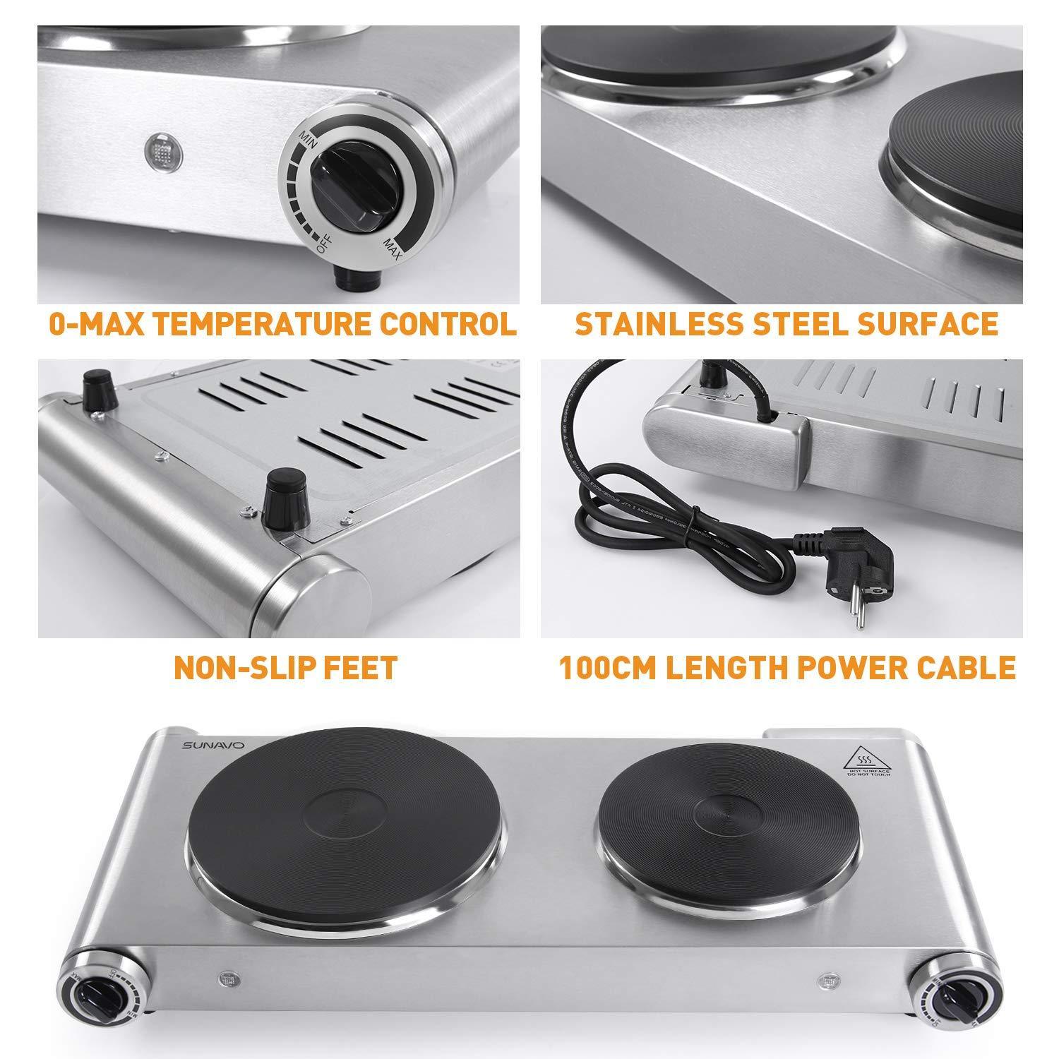 Hot Plate Double Burner for Cooking Electric 1800W, SUNAVO Portable Countertop Burners Cooktop Hotplate hob Burner Variable Temperature Controllers, Stainless Steel Silver by sunavo
