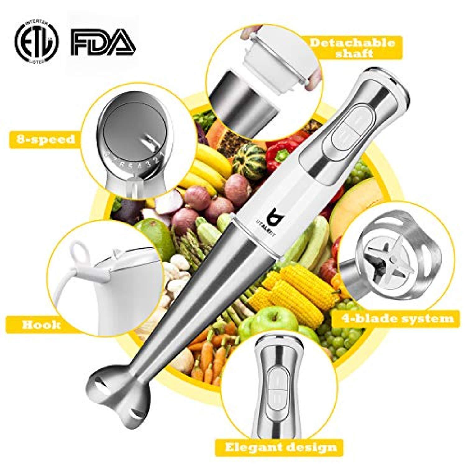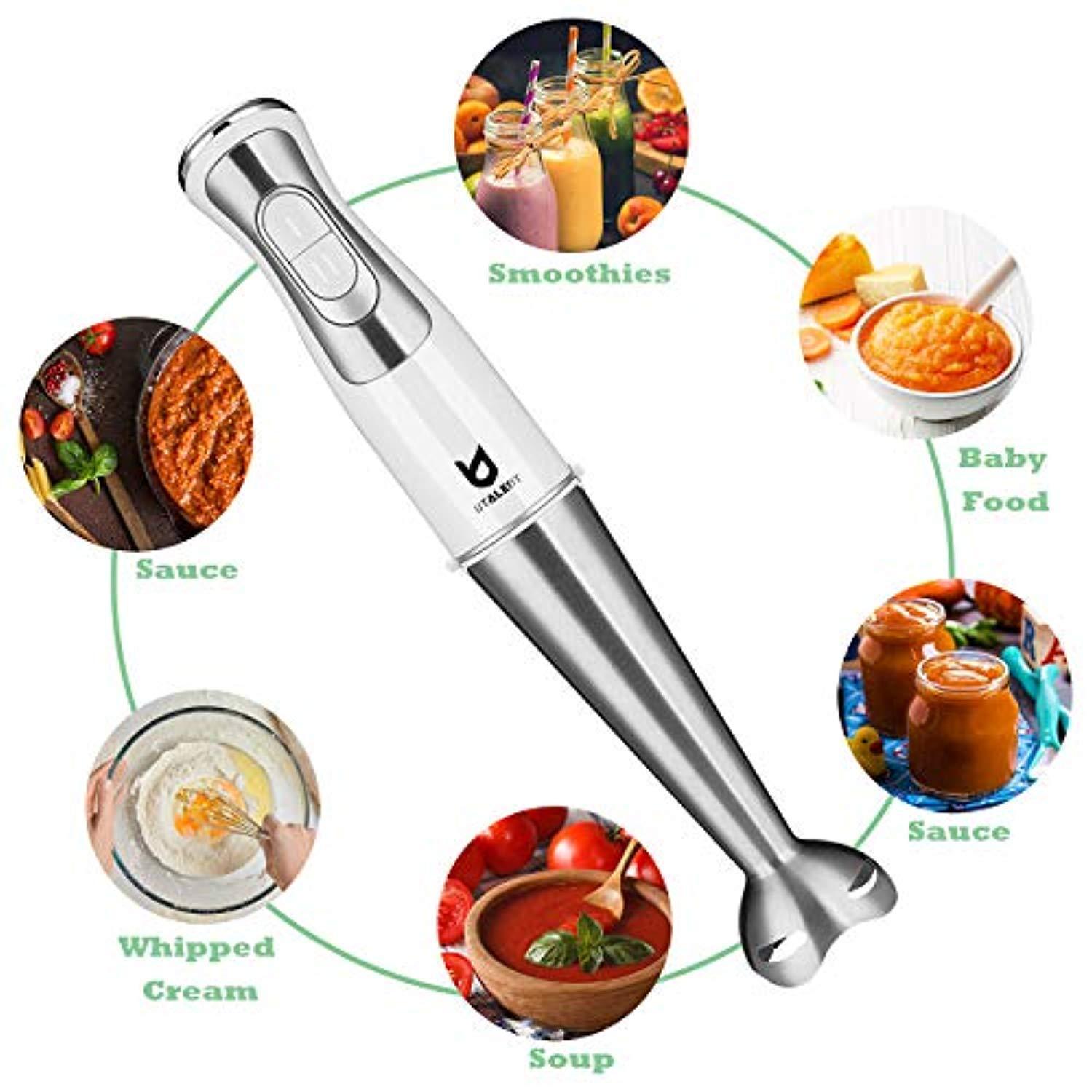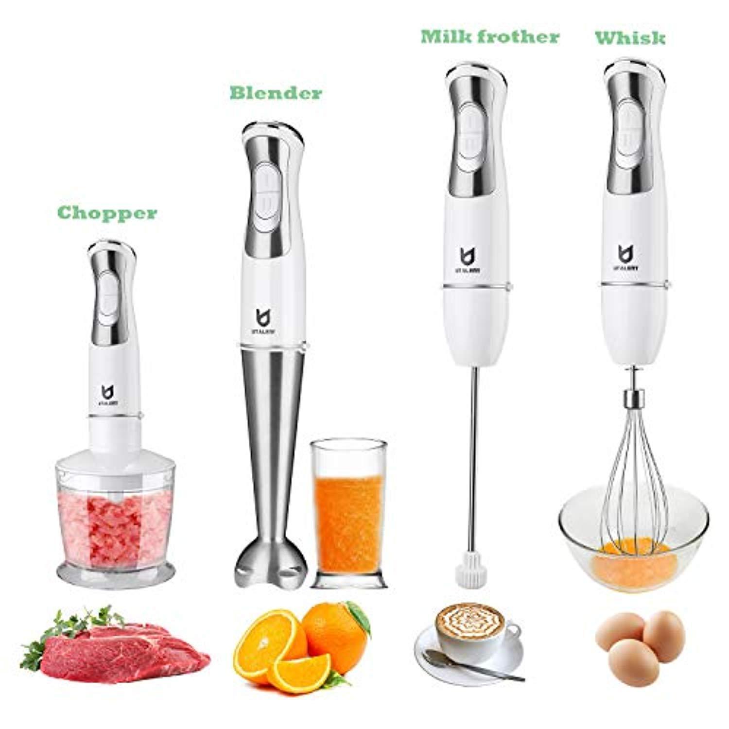 MILK FROTHER ATTACHMENT: Portable hand-held milk frother makes milk foam for your coffee. MORE POWERFUL. 250 Watt powerful hand blender with 8 - speed + turbo for milk shakes, soups or baby food. Low noise and shake. HIGH-EFFICIENCY BLENDER. Thick stainless steel mixing wand with 4 - blade system. Make food mixing more efficient, evenly and smoothly.