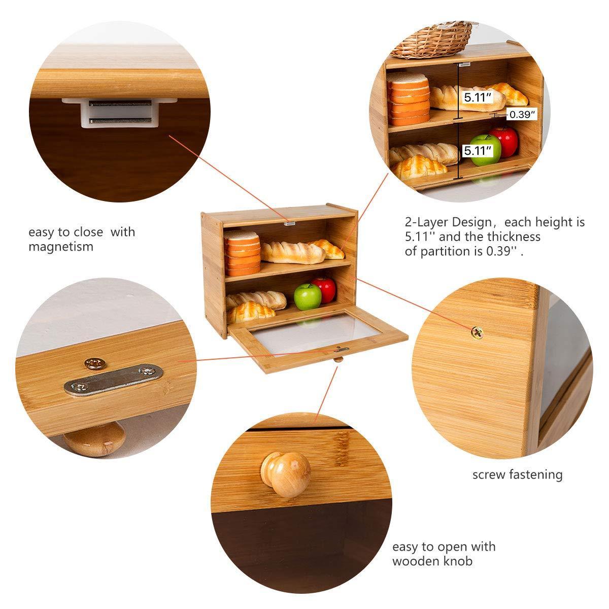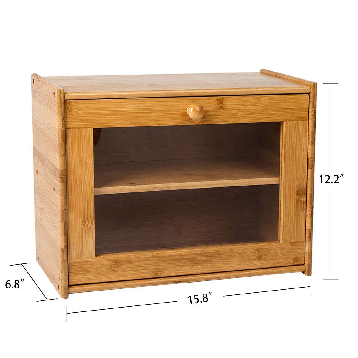 INDRESSME 2-Layer Bamboo Bread Box - Countertop Bread Storage Bin - Large Bread Box for Kitchen Counter with Transparent Window, 15.8"x 12"x 6.7" (SELF ASSEMBLY)