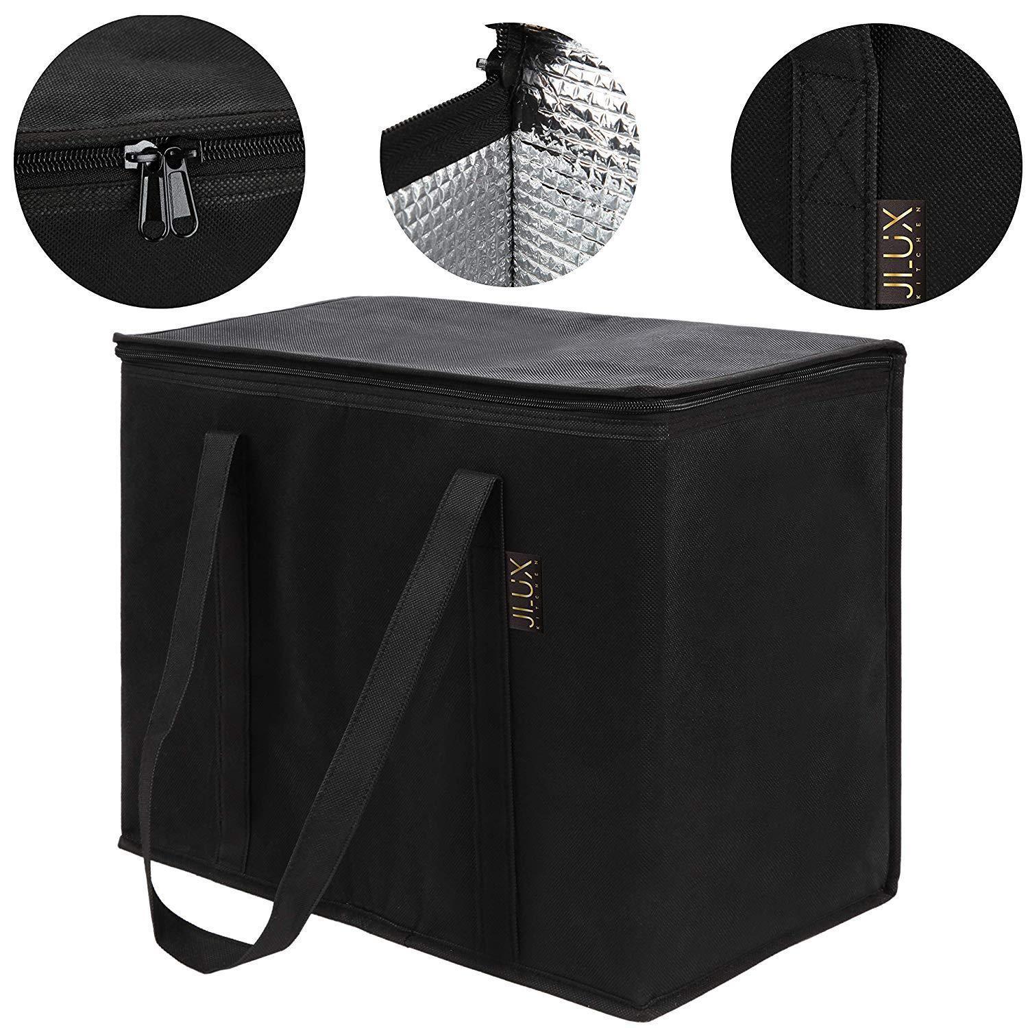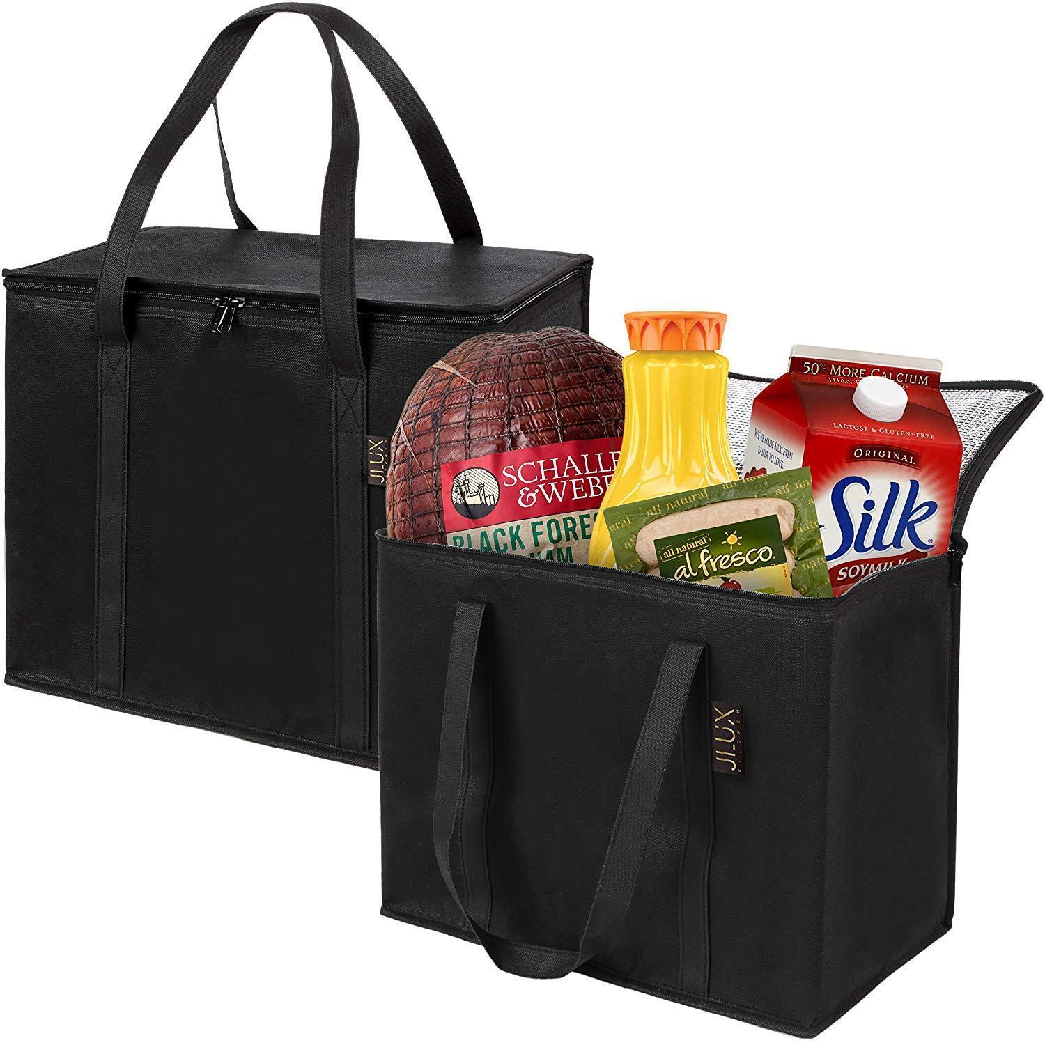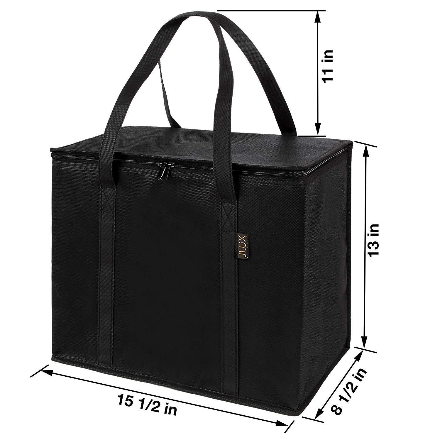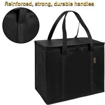 NO MORE RIPPED GROCERY BAGS; Our reusable grocery bag is built with the highest quality material to the highest quality standards you should expect and it is made using top quality non woven fabric material so you never have to worry about your grocery bag tearing apart EXTRA LARGE CAPACITY; 16" x 13" x 9" Perfect insulated grocery bags for large grocery shopping or food delivery and many other utilities; Space will never be a problem with these durable shopping bags REINFORCED HANDLES; Durable and sturdy long handles are sewn down the length of the grocery bag to minimize the chance of the handles tearing; insulated material keeps your food at its desired temperature NO MORE BROKEN ZIPPER; Space saving design allows these bags to be folded flat for easy storage; Sturdy zipper keeps your items from falling out and makes opening or closing your bag much easier; Easy to wipe and clean as needed 100% SATISFACTION GUARANTEE; Our insulated grocery bag is backed by our manufacturer 30 day money back guarantee with 1 year free replacement warranty