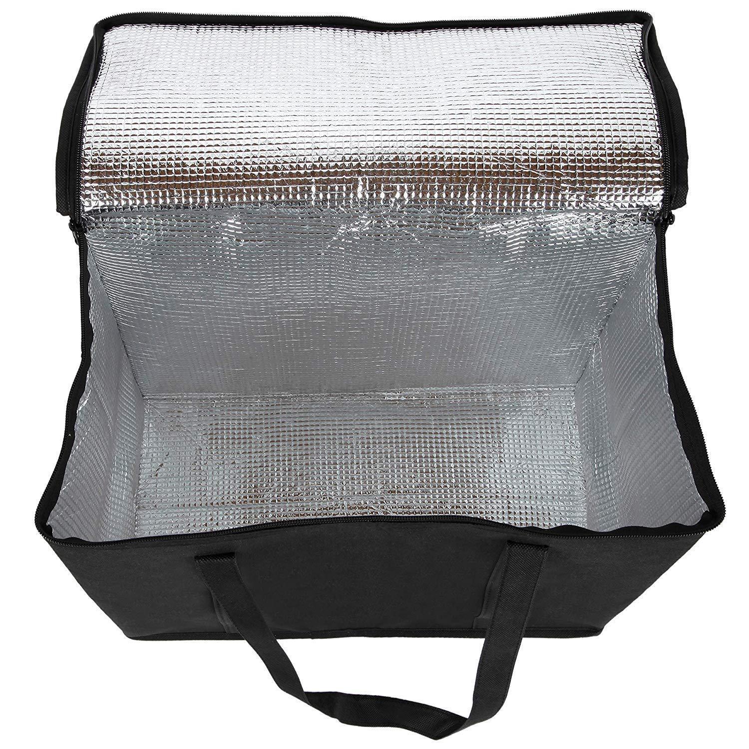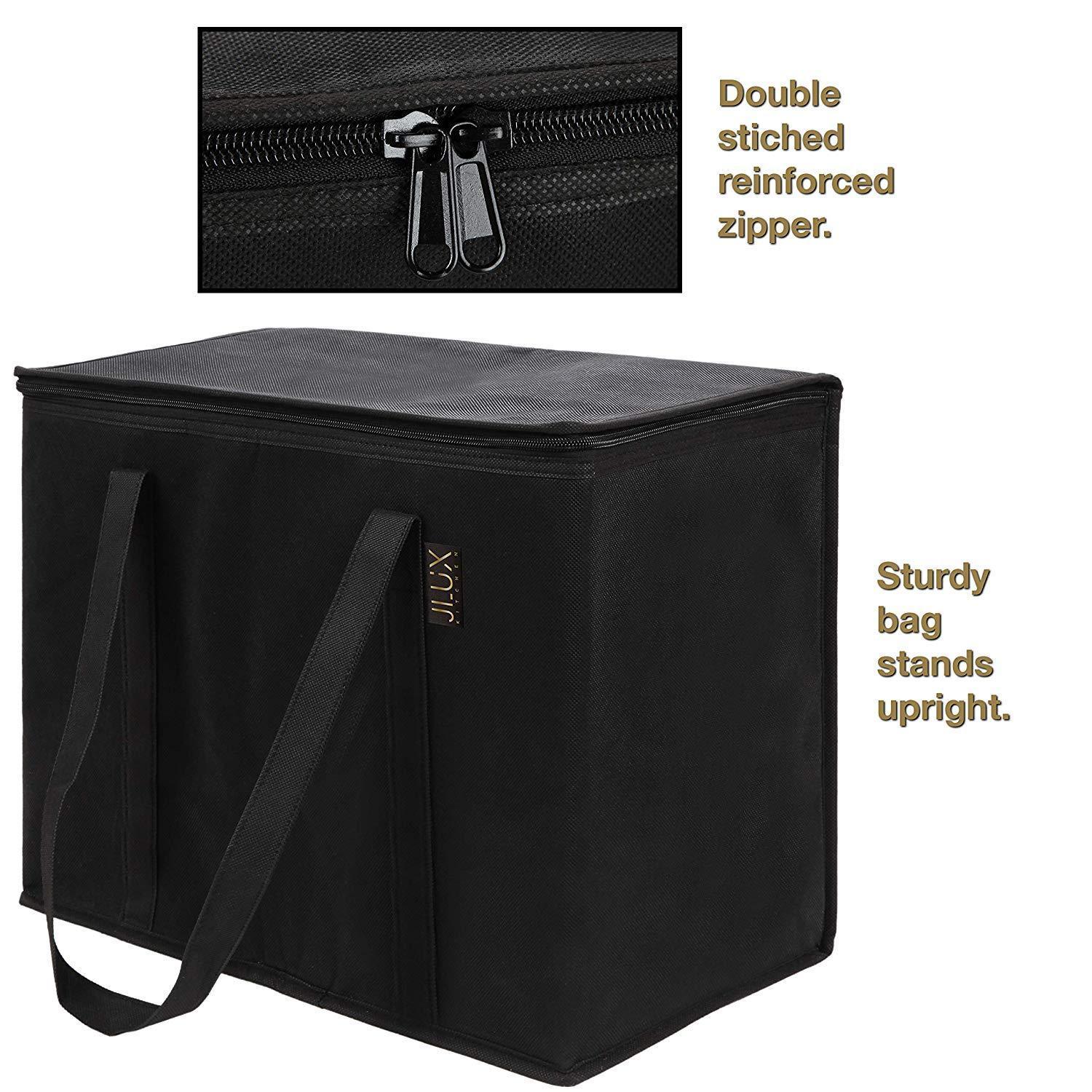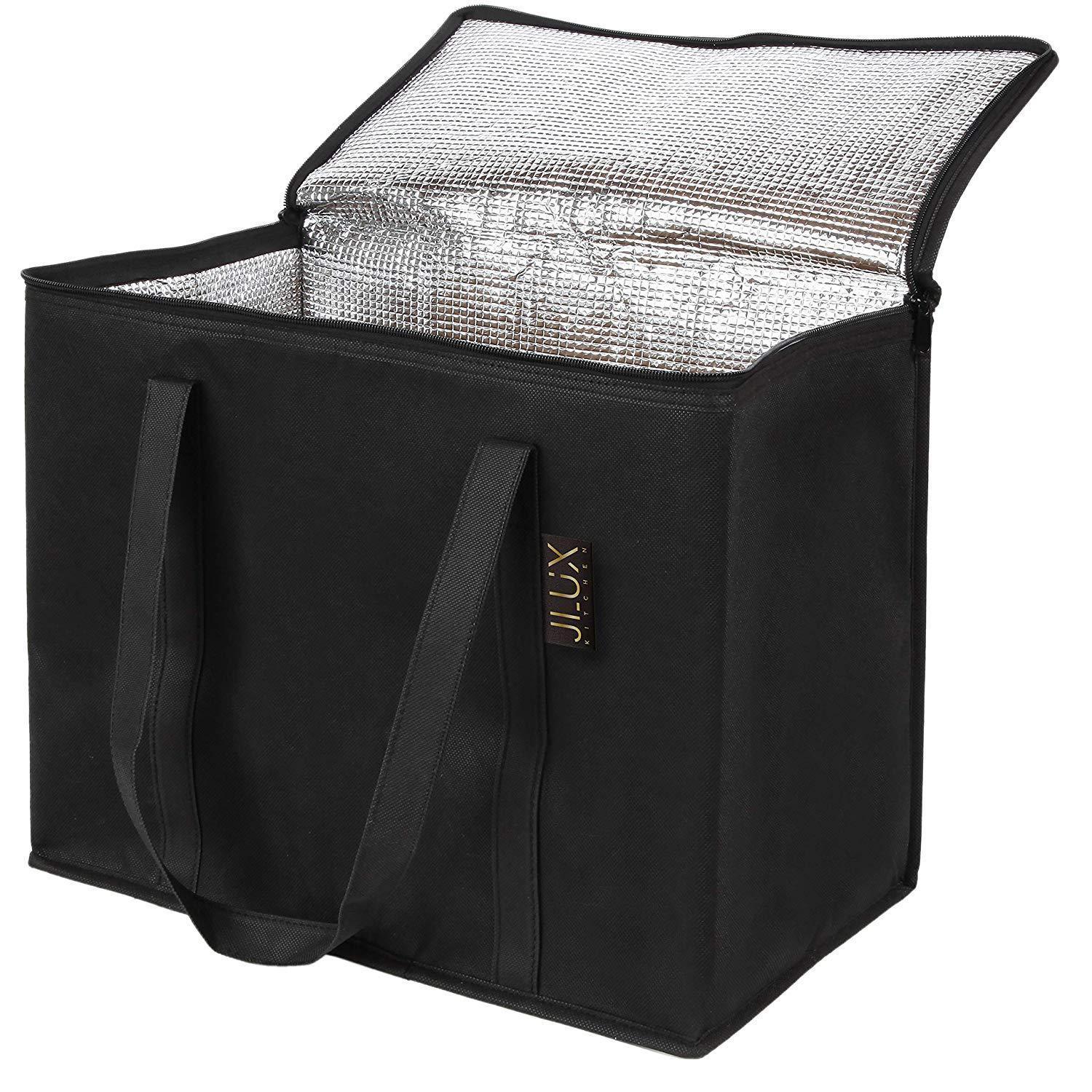 NO MORE RIPPED GROCERY BAGS; Our reusable grocery bag is built with the highest quality material to the highest quality standards you should expect and it is made using top quality non woven fabric material so you never have to worry about your grocery bag tearing apart EXTRA LARGE CAPACITY; 16" x 13" x 9" Perfect insulated grocery bags for large grocery shopping or food delivery and many other utilities; Space will never be a problem with these durable shopping bags REINFORCED HANDLES; Durable and sturdy long handles are sewn down the length of the grocery bag to minimize the chance of the handles tearing; insulated material keeps your food at its desired temperature NO MORE BROKEN ZIPPER; Space saving design allows these bags to be folded flat for easy storage; Sturdy zipper keeps your items from falling out and makes opening or closing your bag much easier; Easy to wipe and clean as needed 100% SATISFACTION GUARANTEE; Our insulated grocery bag is backed by our manufacturer 30 day money back guarantee with 1 year free replacement warranty