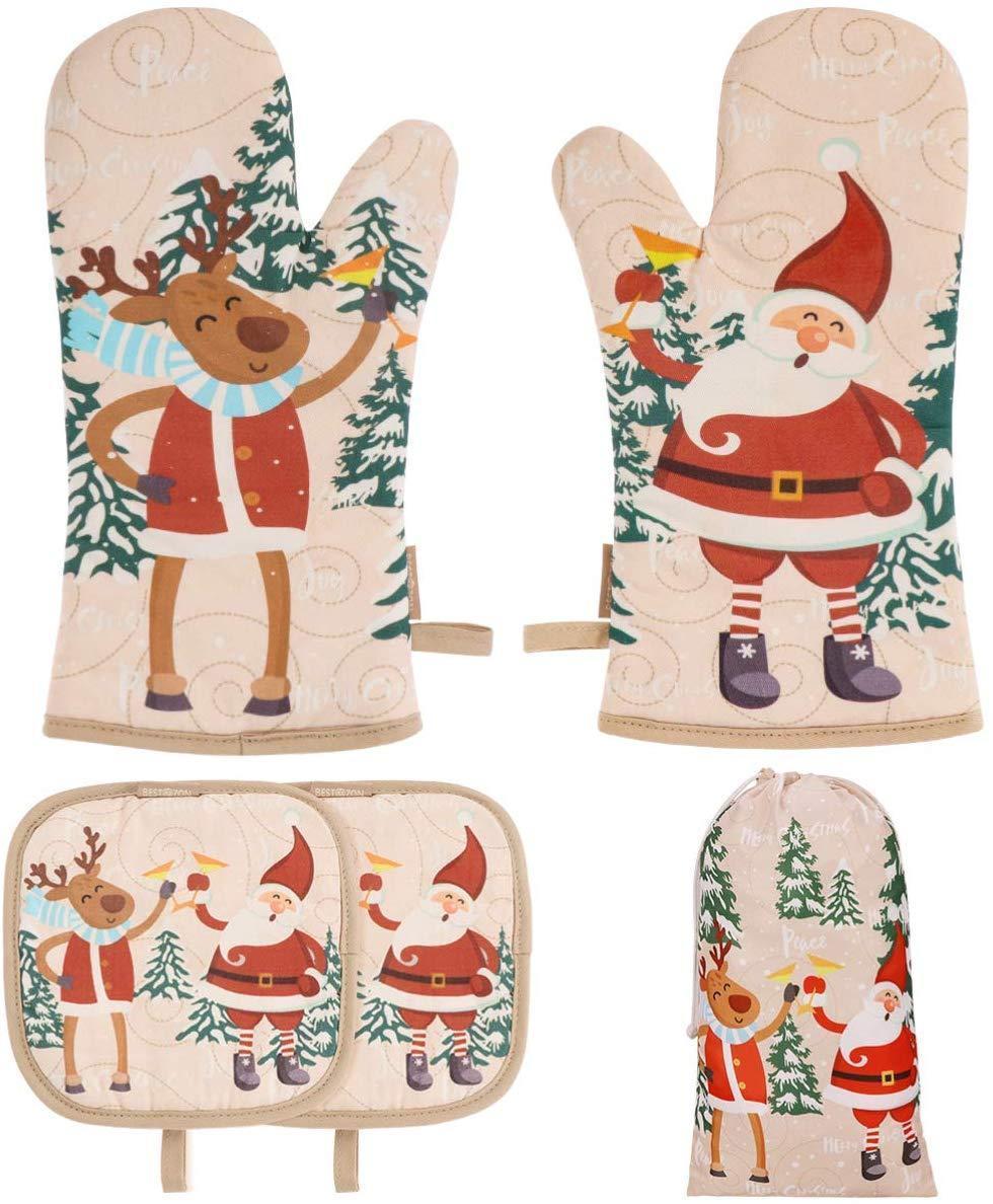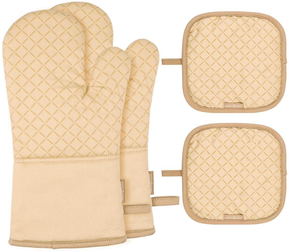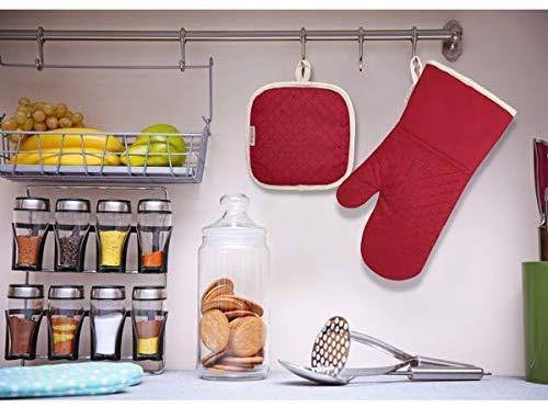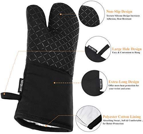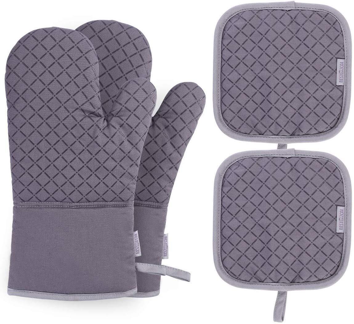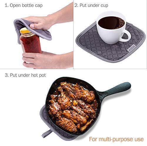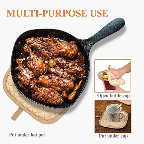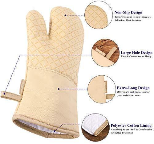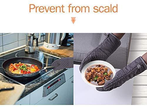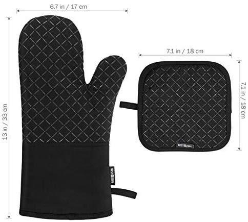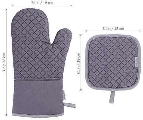 HEAT RESISTANT - Thicker oven gloves and pot holders, heat resistant up to 482 F/ 250C. Well protect your hands and wrists from burns. MATERIAL - Soft quilted cotton lining making it flexible and comfortable for use, non-slip silicone treatment on both sides for right or left handed user. NON-SLIP GRIP -With silicone texture on the surface, not only for better heat resistant, but also with stable and Non-slip grip of all cooking tools. SIZE - Oven mitt is 18X33 cm for male and female hands.33cm extra long length protects wrists and forearms. Pot holder is 18X18 cm, perfect for hot pan holder, jar opener, trivet, large coaster, spoon rest. DURABLE AND WASHABLE - Easy to clean, machine washable cold water dryer safe, tumble dry low. Interior cotton will not come out after wash due to the well sewing.