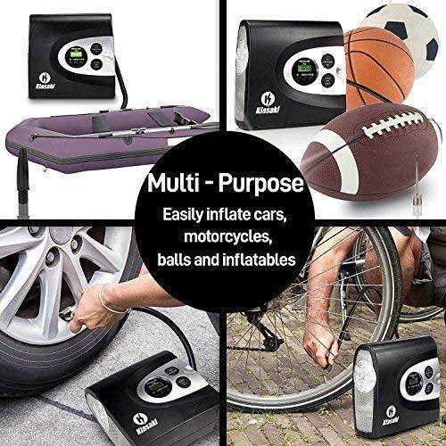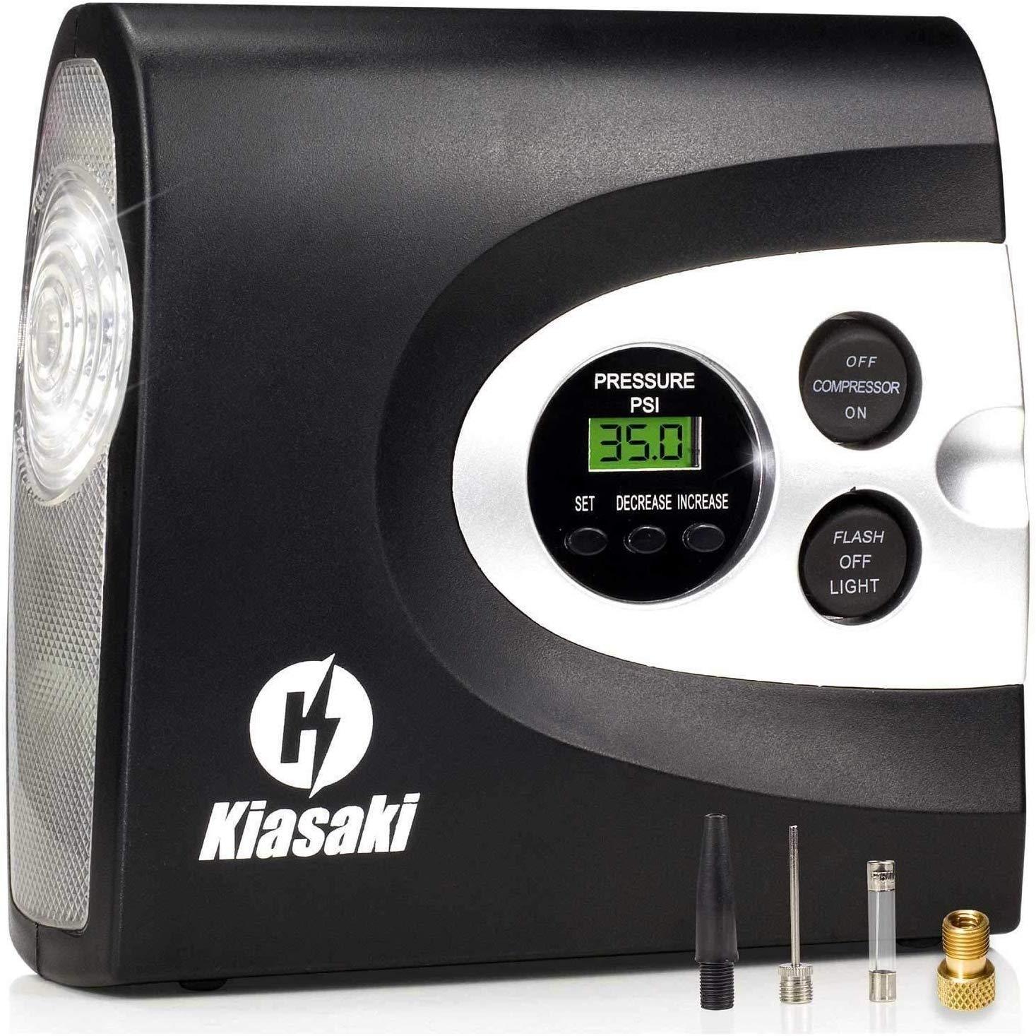 ★【DIGITAL DISPLAY & LED LIGHTING】: The portable air compressor equipped with a large high-precision and bright display that will help you to calculate the required values PSI, BAR, KPA, KG/CM². Kiasaki digital tire inflator is equipped with bright and long-lasting LED lights, easy to use even in the dark, so you can see clearly while you're reinflating your tire at night or making quick repairs on a dark lonely country road.