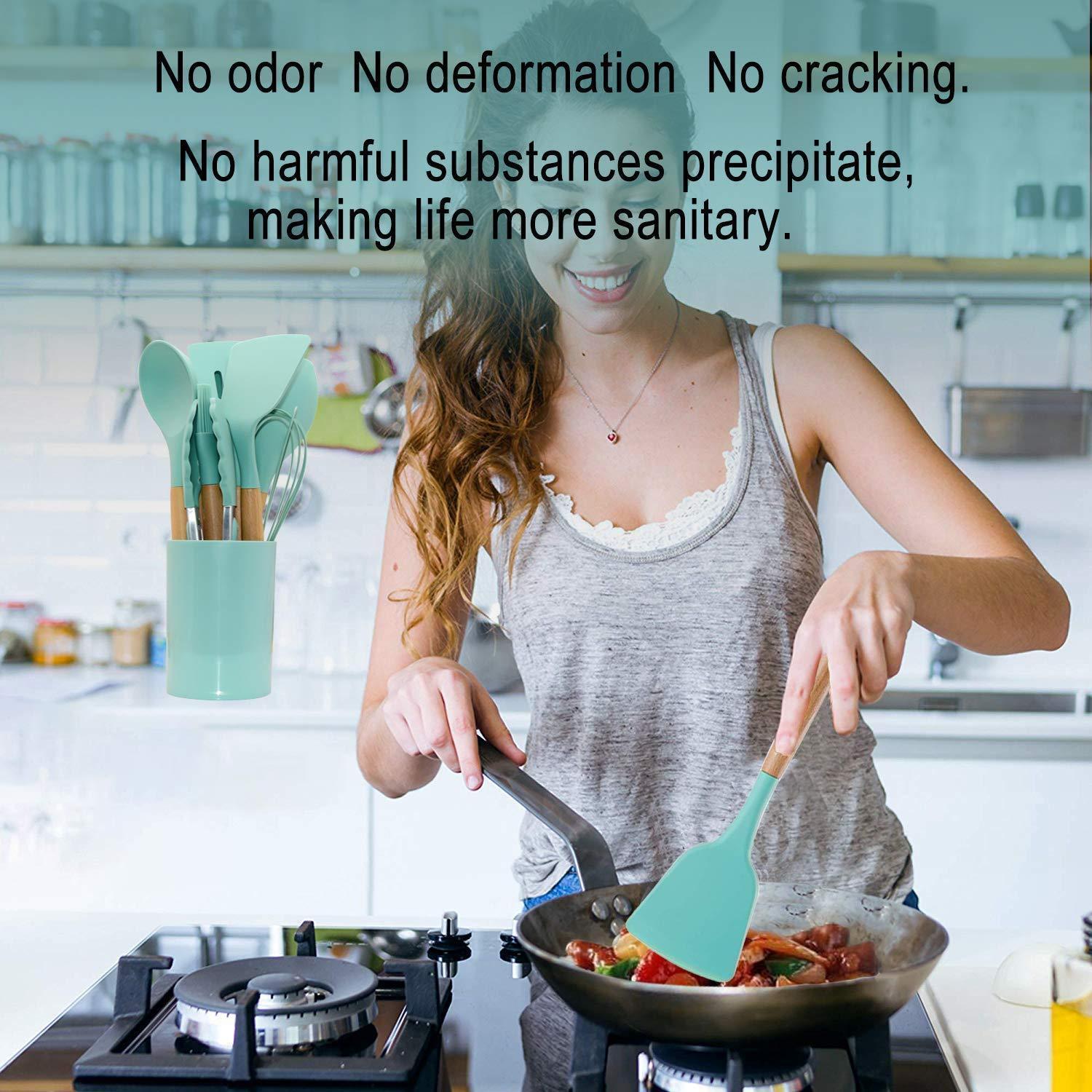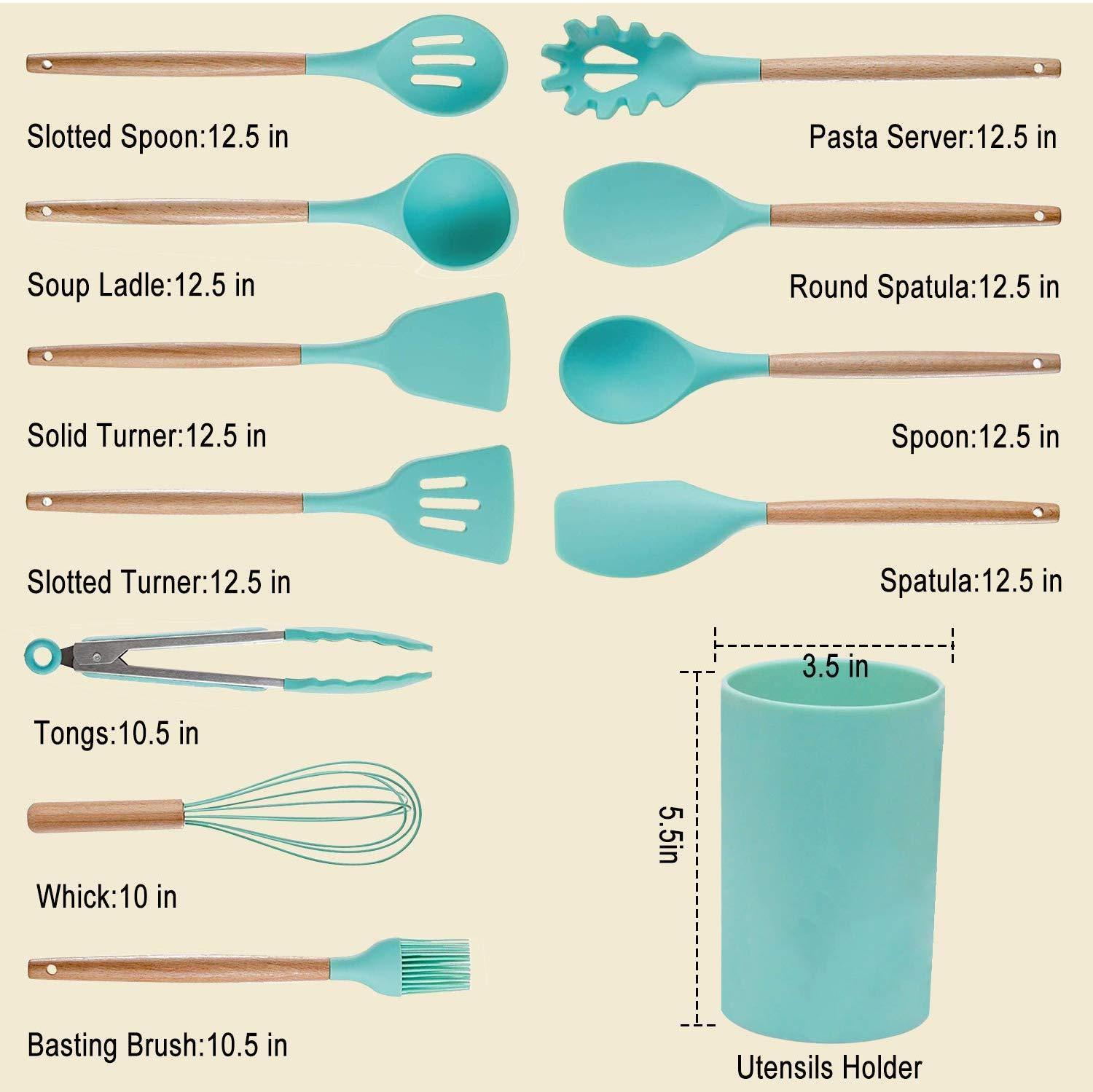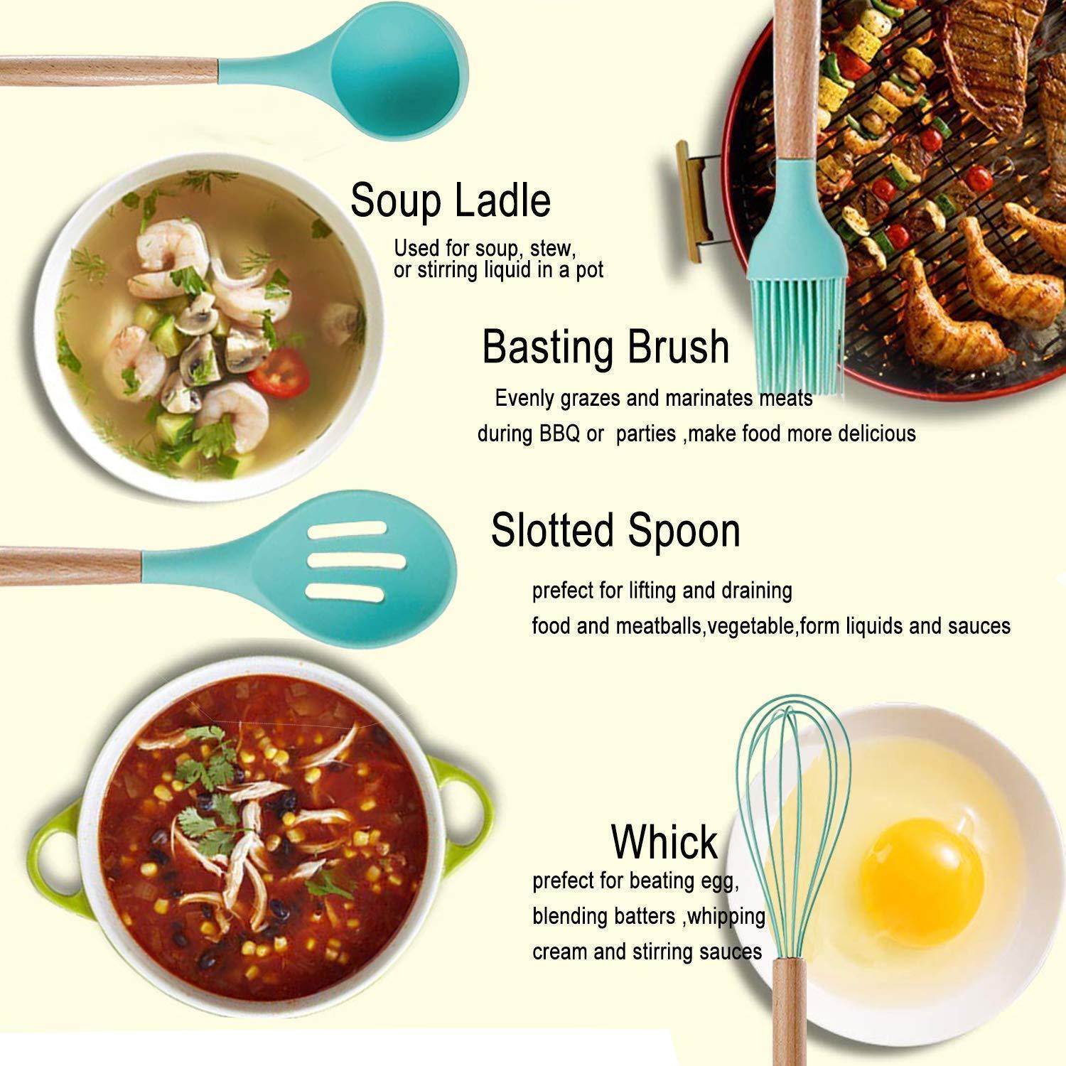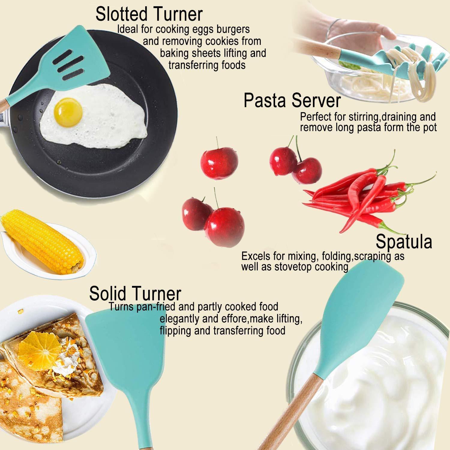 Kitchen Utensil Set Silicone Cooking Utensils, CROSDE 15pcs Kitchen Utensils Set Tools Wooden Handles Spatula Set Cookware Turner Tongs Spatula Spoon Kitchen Gadgets with Holder - Teal