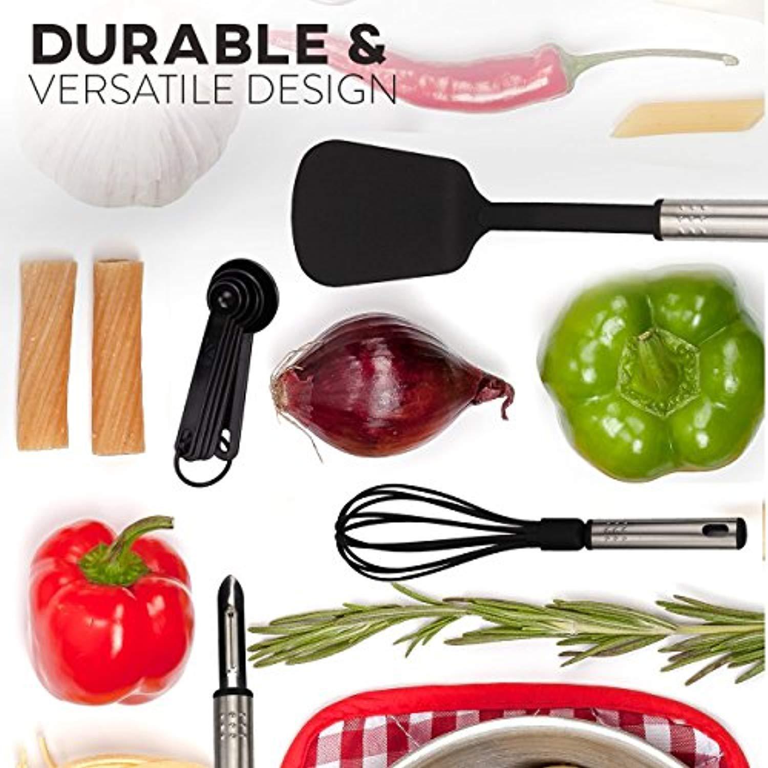 SHOP SMART, SAVE AND GAIN: Don't waste your time in spending a fortune with buying each utensil individually, buy yourself a full 24 piece high-quality light-weight set for cheap and gain a rich selection of professional stainless steel cooking utensils, which will enhance your cooking experience. It is especially designed to help you with all your food preparations, such as whisking, peeling, cutting, stirring, mixing, basting, baking, grilling, frying and serving!