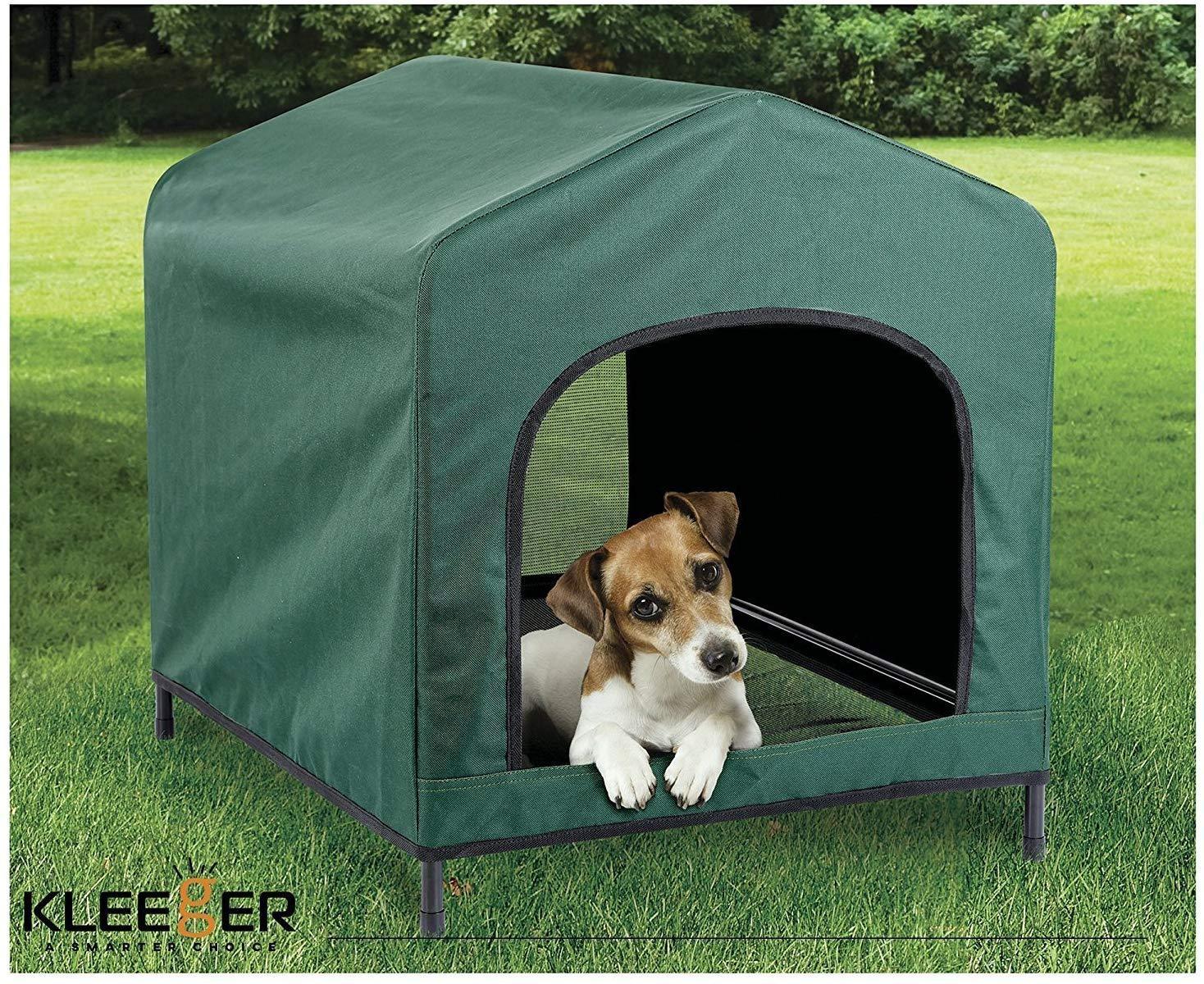 A COMPACT & LIGHTWEIGHT SOLUTION: Whether you're looking for an outdoor pet house for your back yard or for an elevated place for your pet to sleep when you go camping together, this great compact shelter will do the trick. With a size of 26"(Deep) x 21" (Wide) x 24 " (Tall) and a light but durable metal frame, it's perfect for all pets up to 80 lbs.