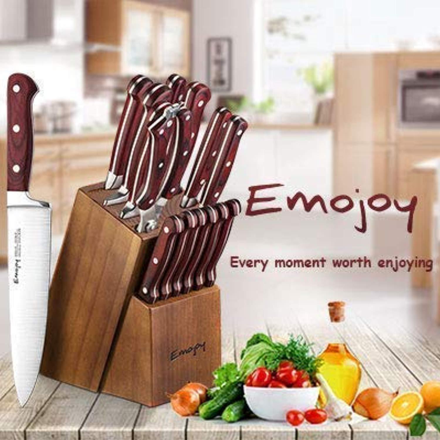 Knife Set, Wooden Handle 15-Piece Kitchen Knife Set with Block Wooden, Manual Sharpening for Chef Knife Set, German Stainless Steel, Emojoy (15 Piece Knife Set)