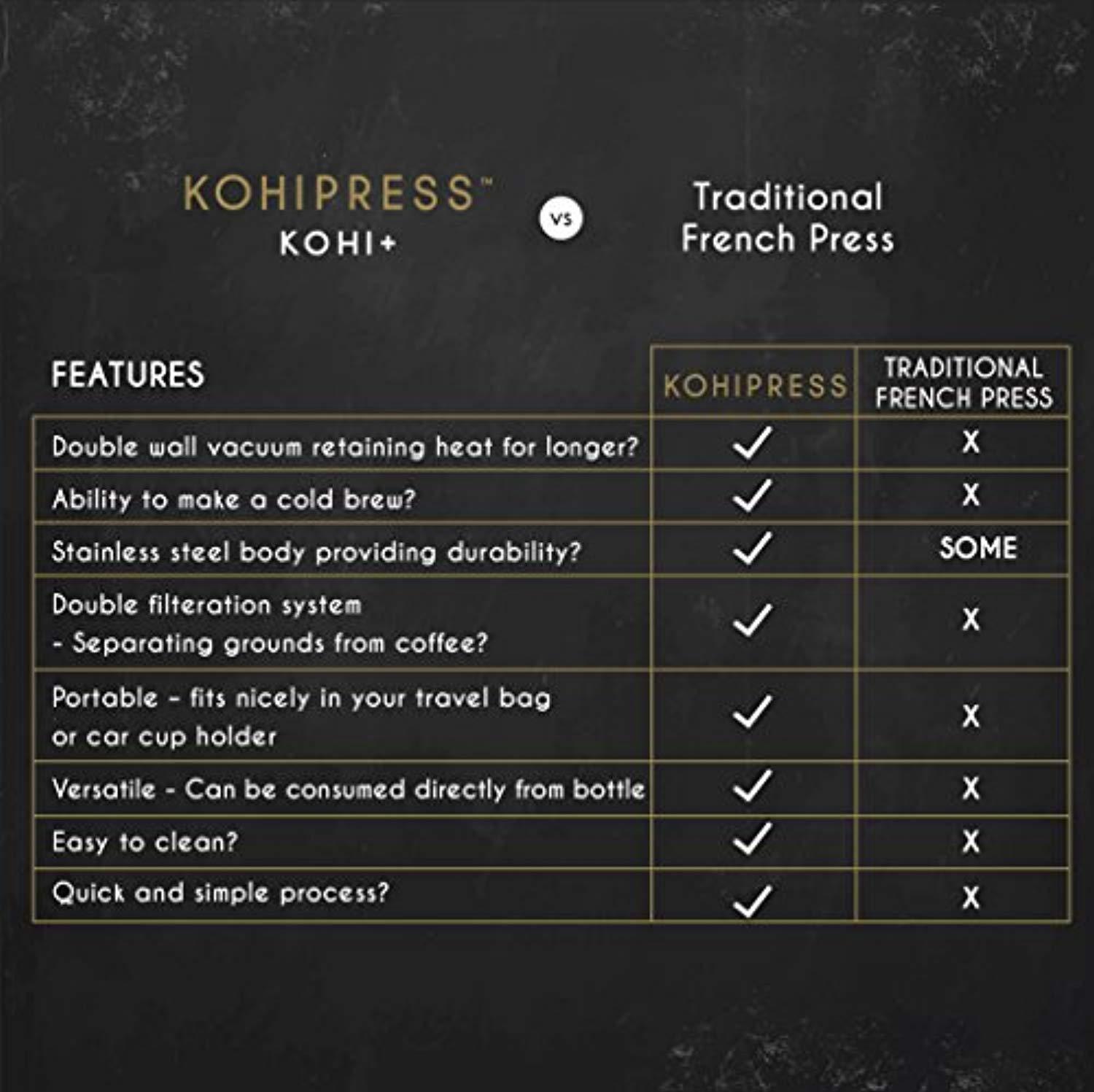 KOHIPRESS The Original Portable French Press Coffee Maker | Vacuum Insulated Travel Mug | Premium Stainless Steel | Hot and Cold Brew (12 oz) | Great for Commuter, Camping, Outdoors and Office (Black)ALL-IN-ONE brewer and insulated travel mug - The versatile KOHIPRESS uses a full immersion steep with a pressurized plunger press ( a similar method as the Aerobie Aeropress ) to make a rich, smooth cup of coffee. REUSEABLE FILTER - The KOHIPRESS boasts a fine micron stainless steel mesh filter which can be reused over and over again. A COST SAVER and environmentally friendly! PORTABLE - The LEAK-PROOF lid means you can store it away without any risk of leaks. The KOHIPRESS weighs 13 oz with a capacity of 12 oz. EASY CLEAN - Our Patented self - lock mechanism separates the brewed coffee from the used coffee grounds. Once finished, simply rinse the chamber and plunger under a tap. CHEAP IMITATIONS COST YOU MORE - The KOHIPRESS is made from high quality material (FDA Approved). The chamber is made from Premium Grade Stainless Steel. The Double Wall Vacuum keeps hot water warm and cold water cool. The hardened plastic plunger is BPA FREE and 100% food safe. Sure, there might be cheaper alternatives available. But why waste your money finding out ours is better? Just have a read of our reviews below.