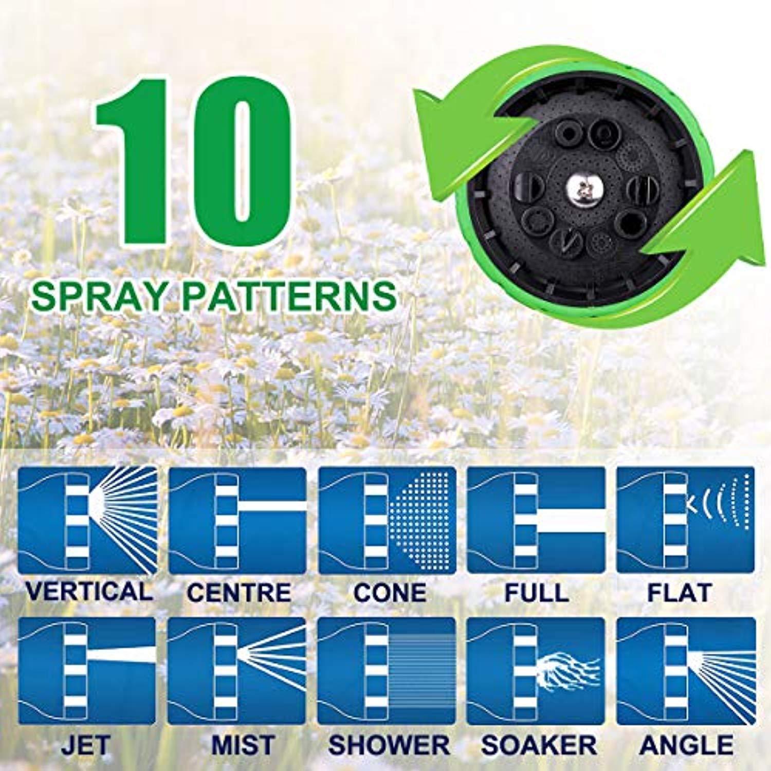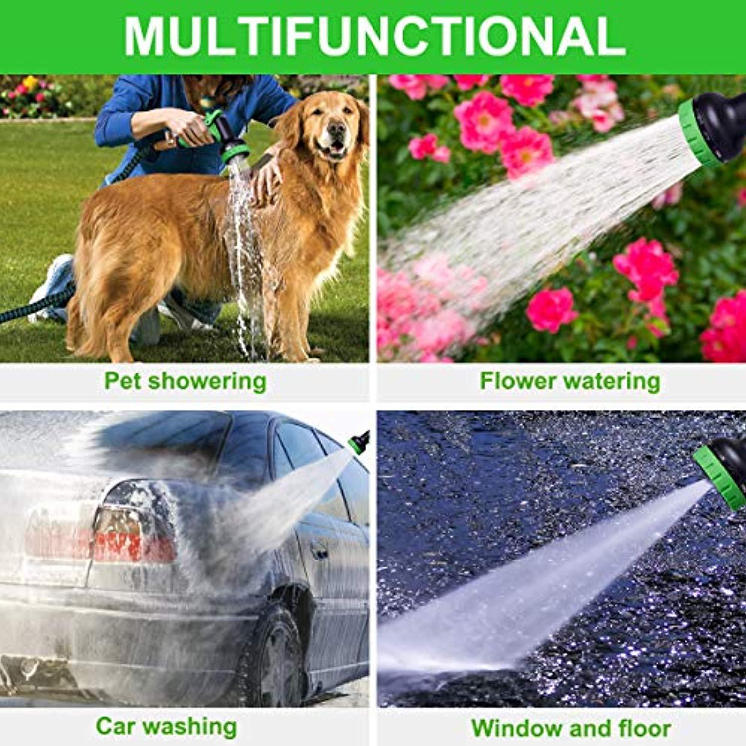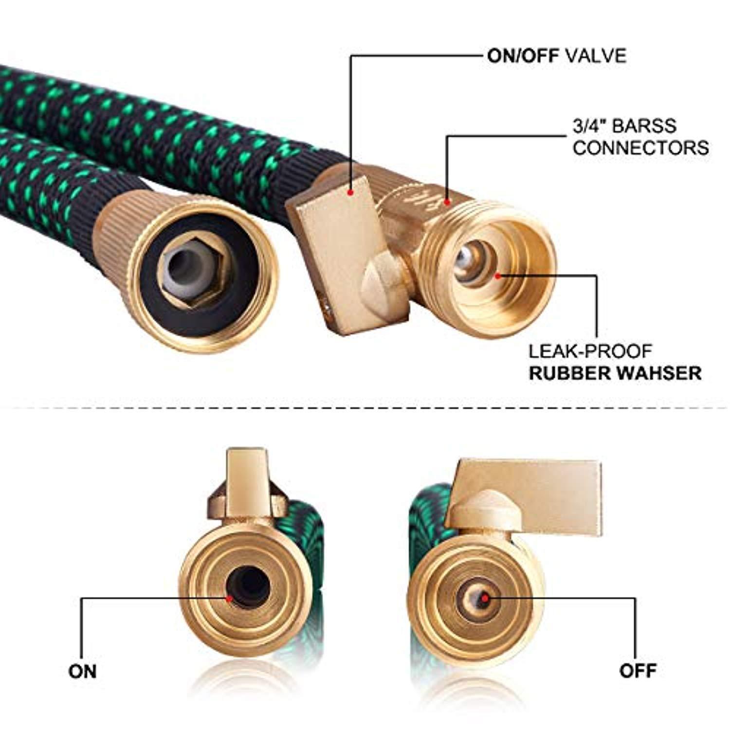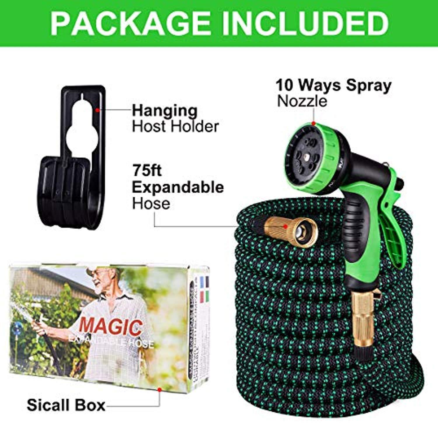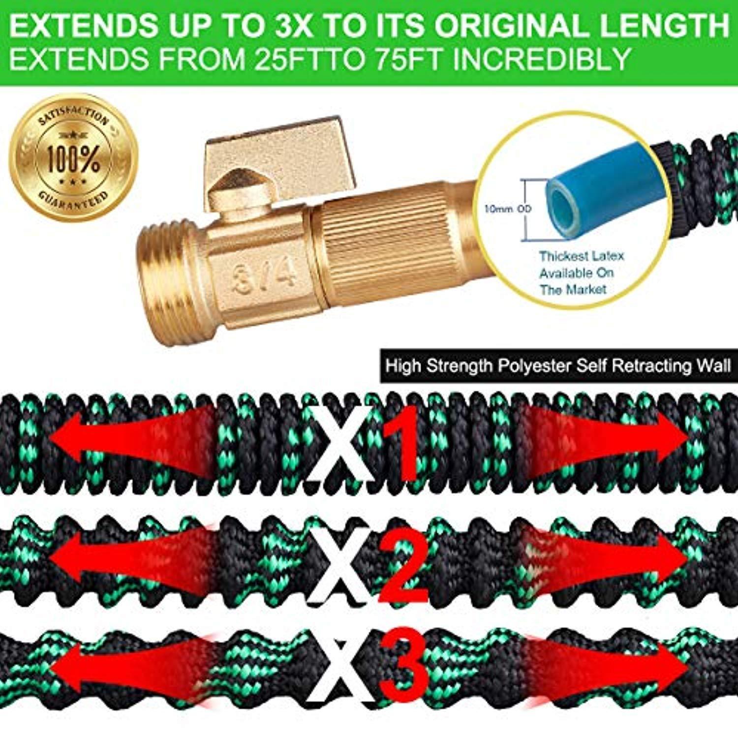 ❤【INCREDIBLE DURABILITY & HEAVY DUTY】- The pipe, brass connectors, valve, nozzle and spray are made with durable premium materials and fabric. They will not rust, leak, tear, rip or crack, and this garden hose design for long-term use ❤【10 PATTERN WATER HOSE NOZZLE】- Compared to most 9 pattern hose nozzle. Our Water nozzle with 10 pattern. Durable zinc alloy construction; the rubberized outer coating is slip-resistant and comfy; water controlling knob for changing the water pressure; rotating bezel for easy choosing kind of spray. Select right type of the stream and water plants, clean garden or pool, shower pet or wash car ❤【FLEXIBLE DESIGN】- When the water is turned on the hose quickly expands up to 75 feet with the water pressure (3-12 Bar) and returns in minutes to its original length when the water is out. Just make sure there is enough water pressure to expand the garden hose.The water hose grows because of its double latex core with high density, low friction and 3750D polyester outer fabric. Never again will you have to lug around heavy rubber and vinyl garden hoses that kink and tangle ❤【LIGHTWEIGHT AND FLEXIBILITY】- The expandable garden hose is lightweight. The original length is 33 feet. It can be expanded up to 3 times of its original length with water pressure, then retracts when the water is turned off. Never kink and tangle. Lightweight, compact and storage easy ❤【EASY TO USE & STOREGE】- Usage and storage is a breeze thanks to the incredible expanding design. Super lightweight retractable garden hose can expands 3x to an impressive 75ft and returns to its original length in minutes for simple storage!