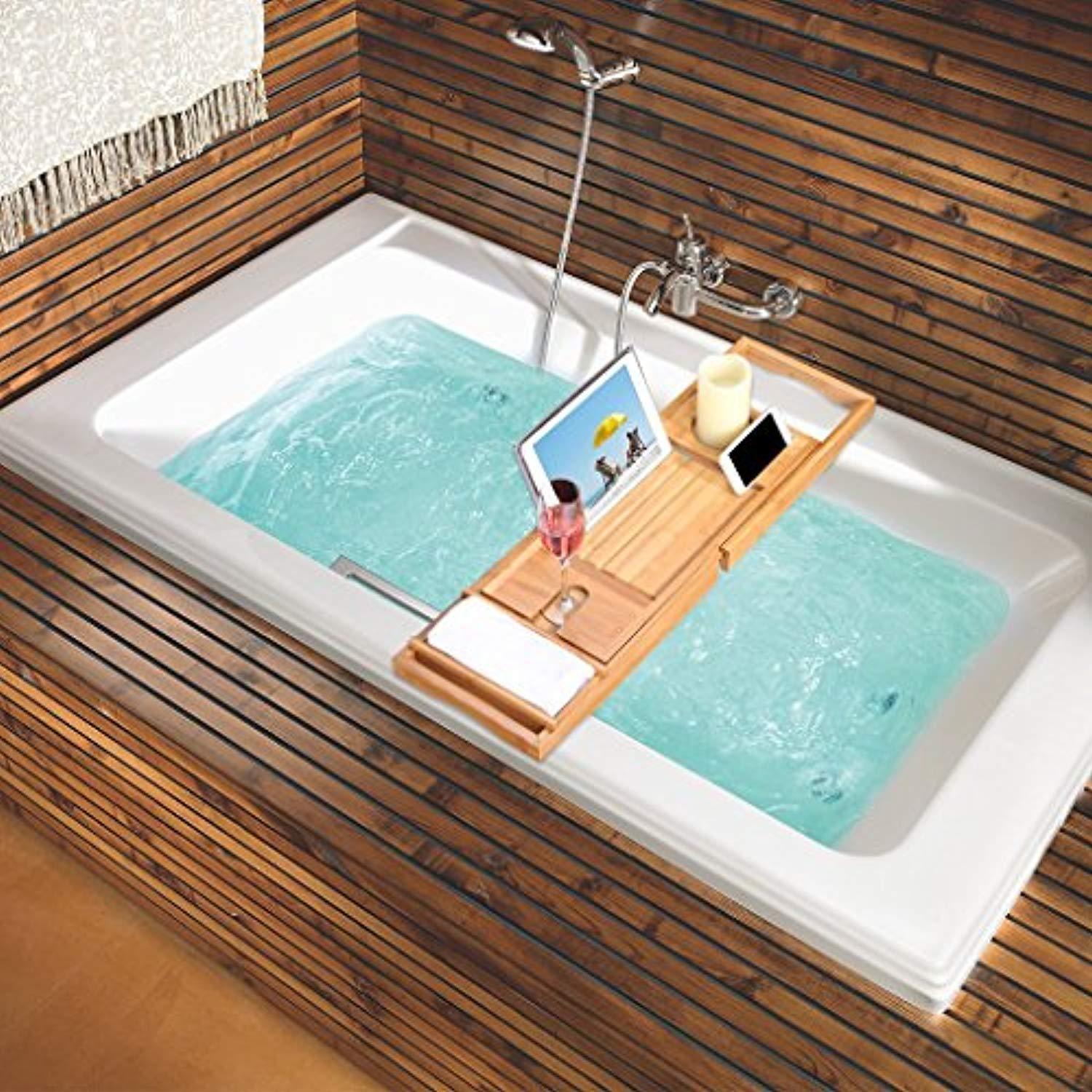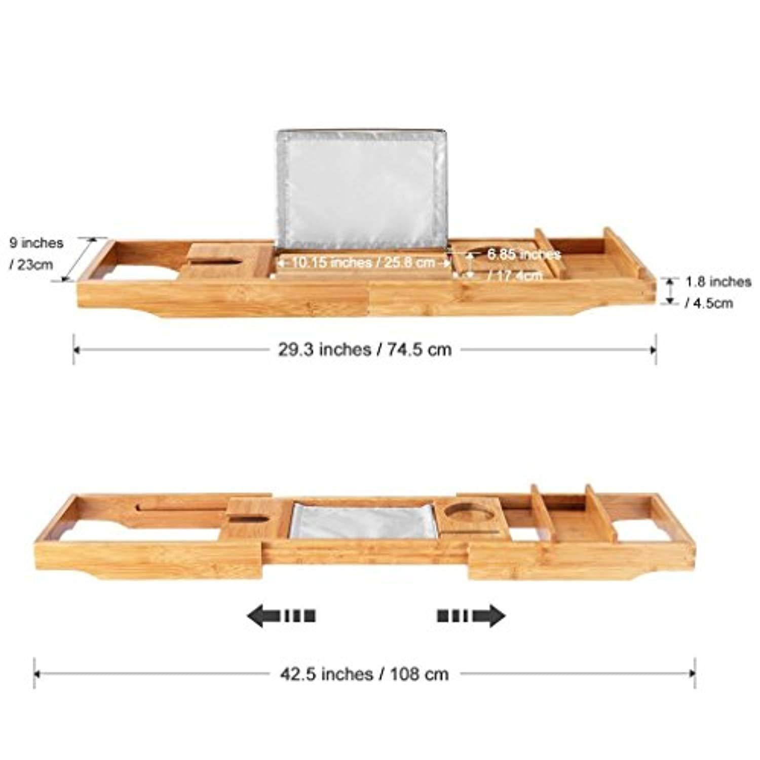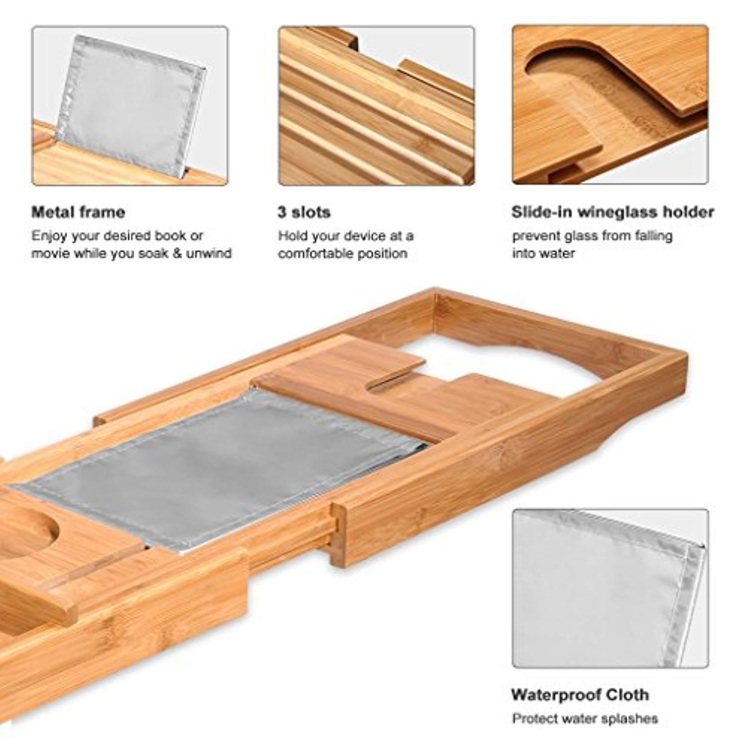 LANGRIA Bamboo Bathtub Caddy Tray with Extending Sides Mug/Wineglass/Smartphone Holder, Metal Frame Book/Pad/Tablet Holder with Waterproof Cloth Detachable Sliding Tray Non-Slip Rubber Base