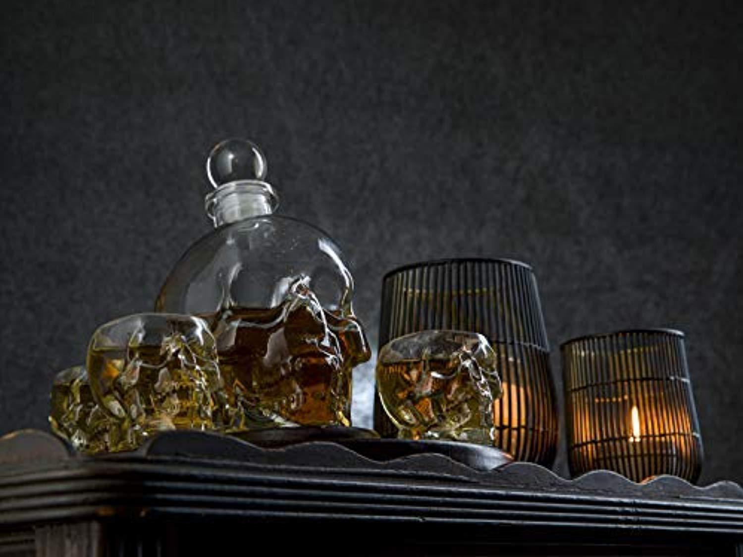 HIGHEST QUALITY: Complete with 1 skull-shaped decanter, 4-skull shaped shot glasses and a wooden tray holder. This set is perfect for Halloween, pirate-themed parties, or bachelor parties. Crafted of fine crystal for timeless shine and durability, guests won't be able to resist talking about this set long after they're done drinking. Great for vodka, liquor, whiskey, and more, this is one set that will make you stand out Handcrafted to add a unique design element to the home bar Crafted from solid glass, each liquor decanter contains an intriguing floating glass skull for an eerie feel. Featuring a glass stopper with a rubber base, it can hold in the flavor and aroma of any of your favorite spirits and poisons. Will add a unique design element to the home bar, it plays a key role in creating hauntingly good cocktails.