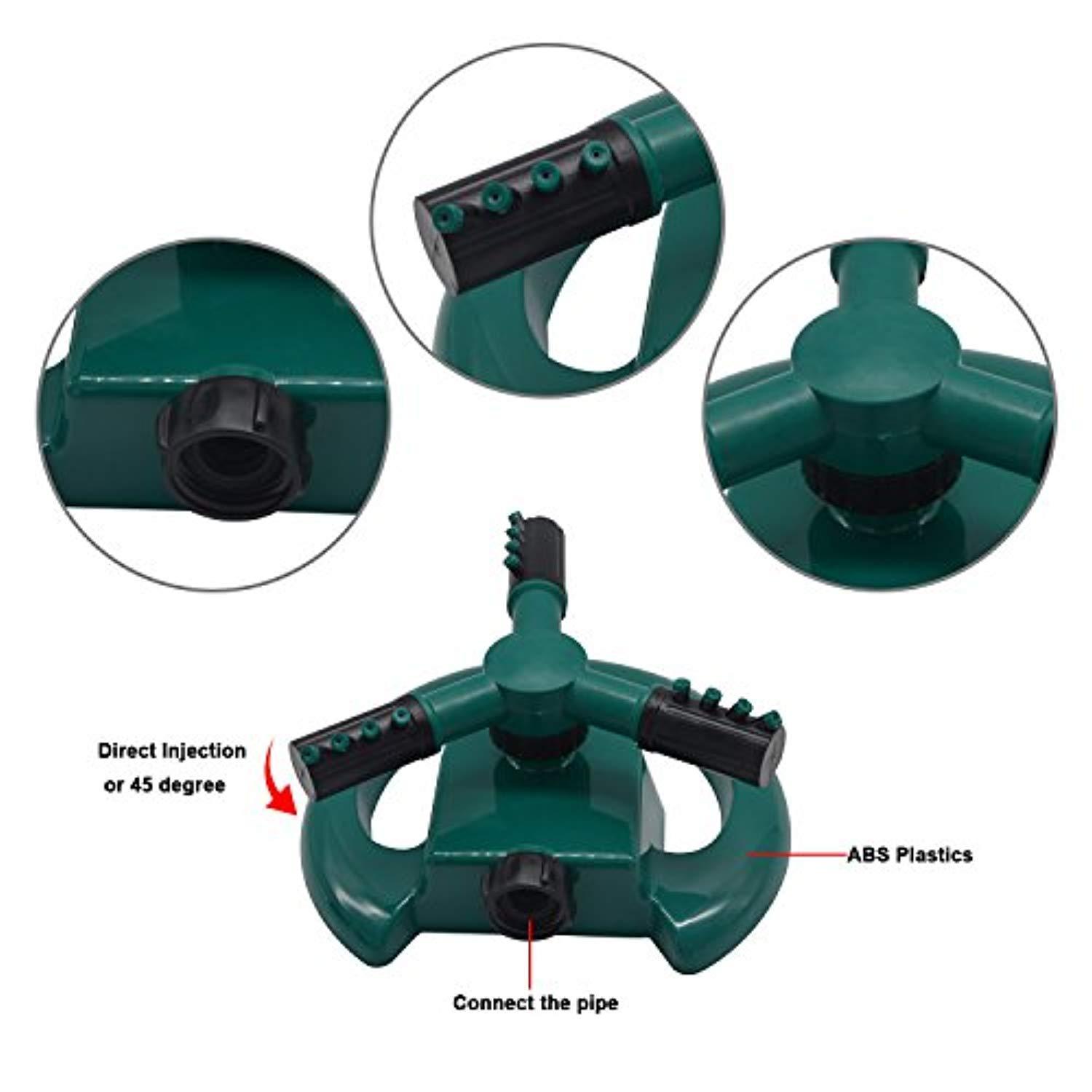 - Premium quality - Three arms + ABS plastic rotary lawn sprinkler, 360 degree rotating action, efficient, quick watering providing better coverage saving you time and water. - Effective water sprinkler irrigation system - patented design of water-saving device can be targeted to save water most by adjusting the water density, size and scope - Easy use - Rotating spray nozzles allow for customizable watering to meet your lawn's exact needs. The angle can be set to 90 degrees for more compact watering or 45 degrees for watering larger areas. - Long spray distance - Efficiently water your lawn up to 26ft-32.8ft distance with international standard pipes - Ideal for watering smaller size yards and gardens and kids fun. Heavy-duty all plastic construction lasts season-after-season