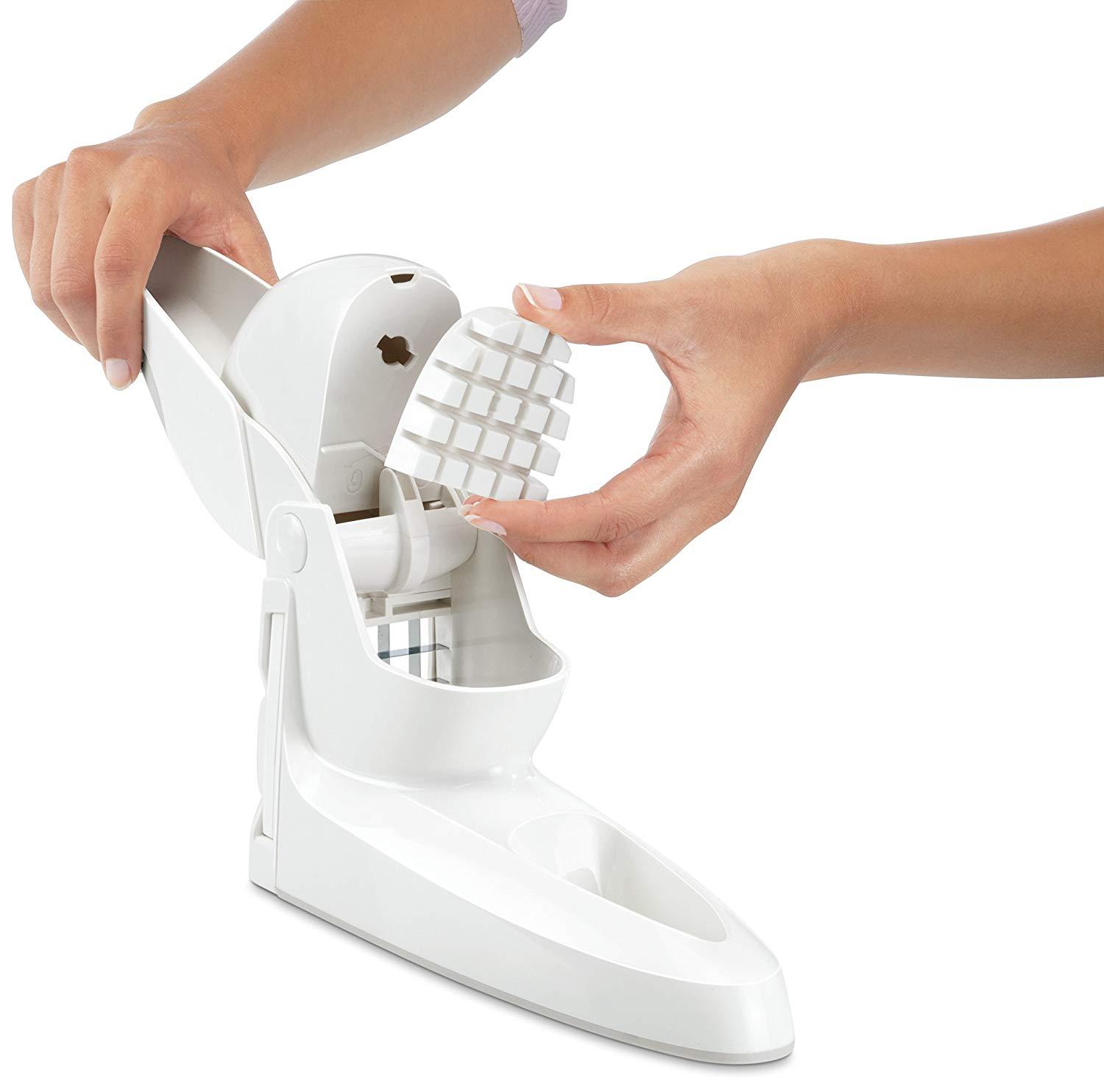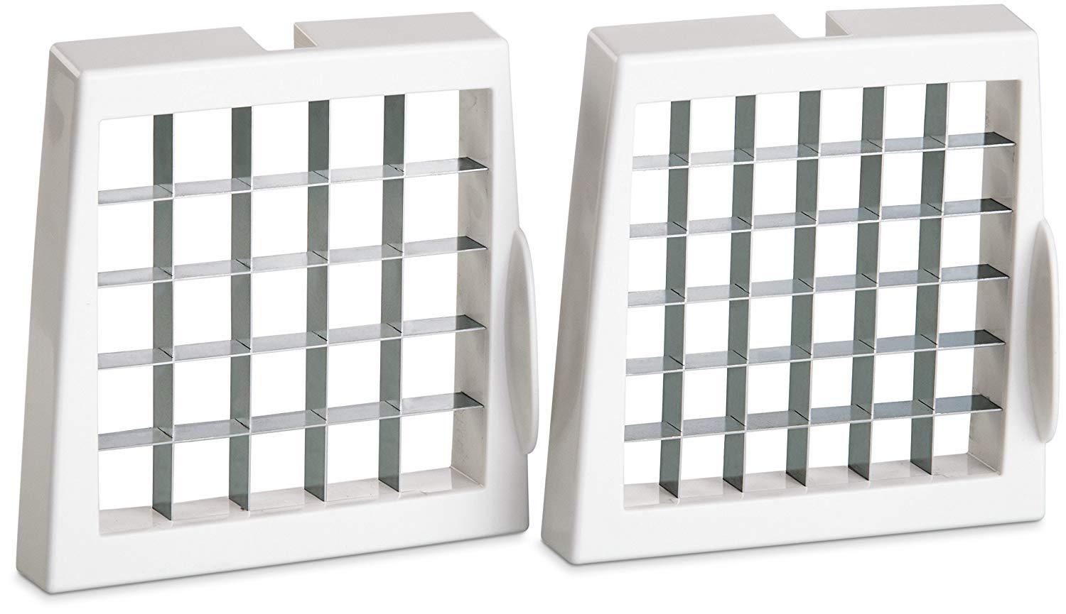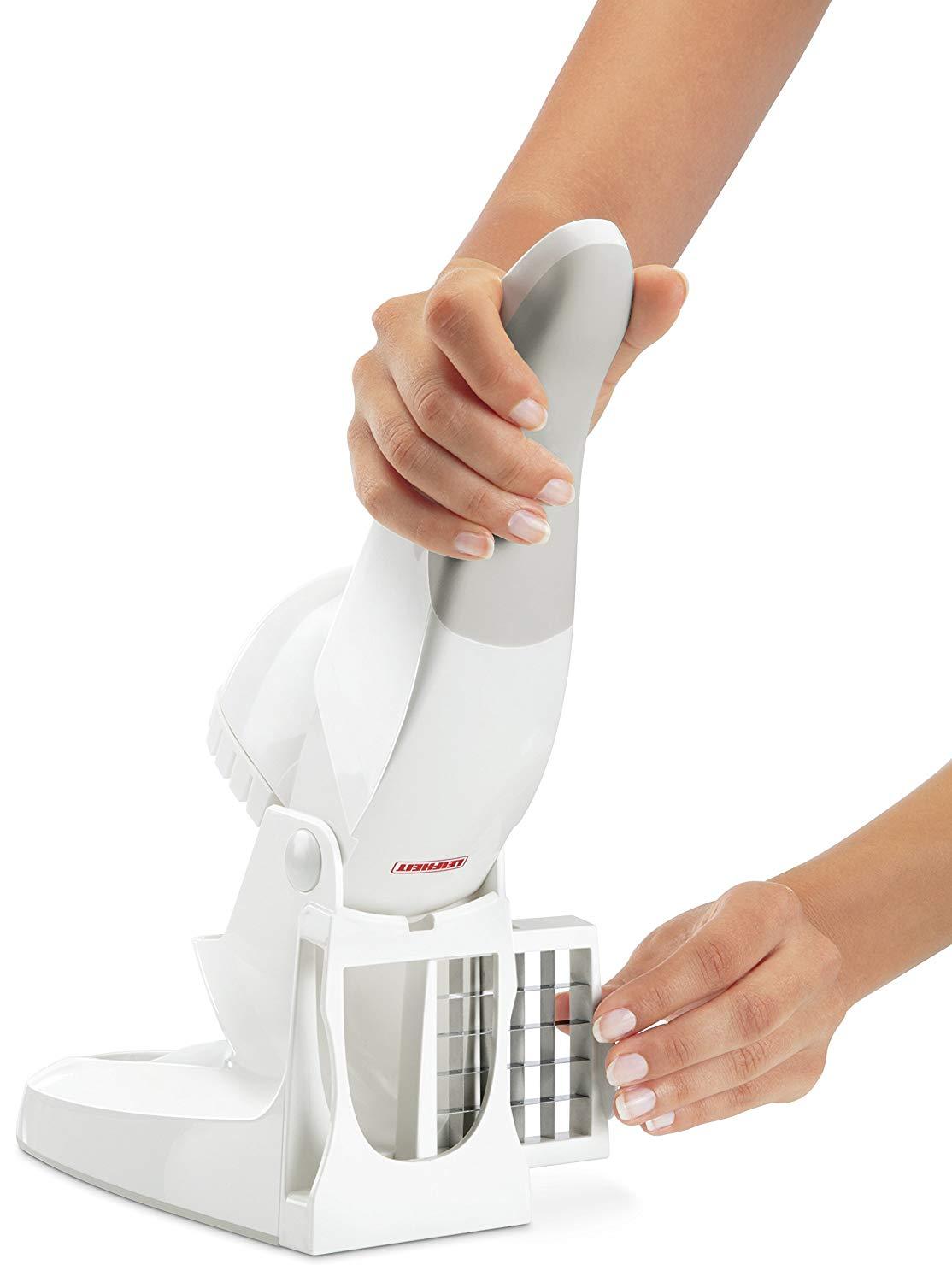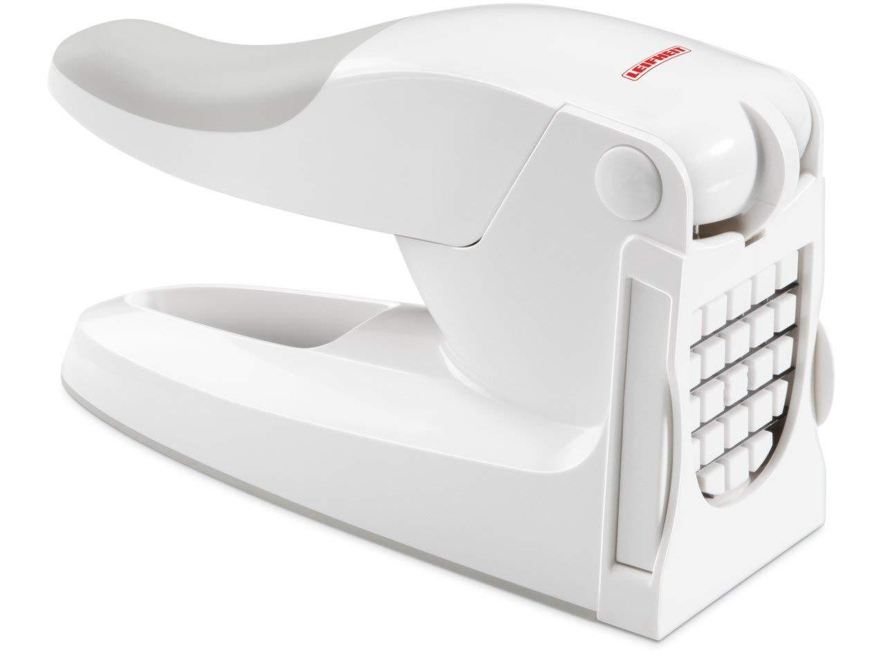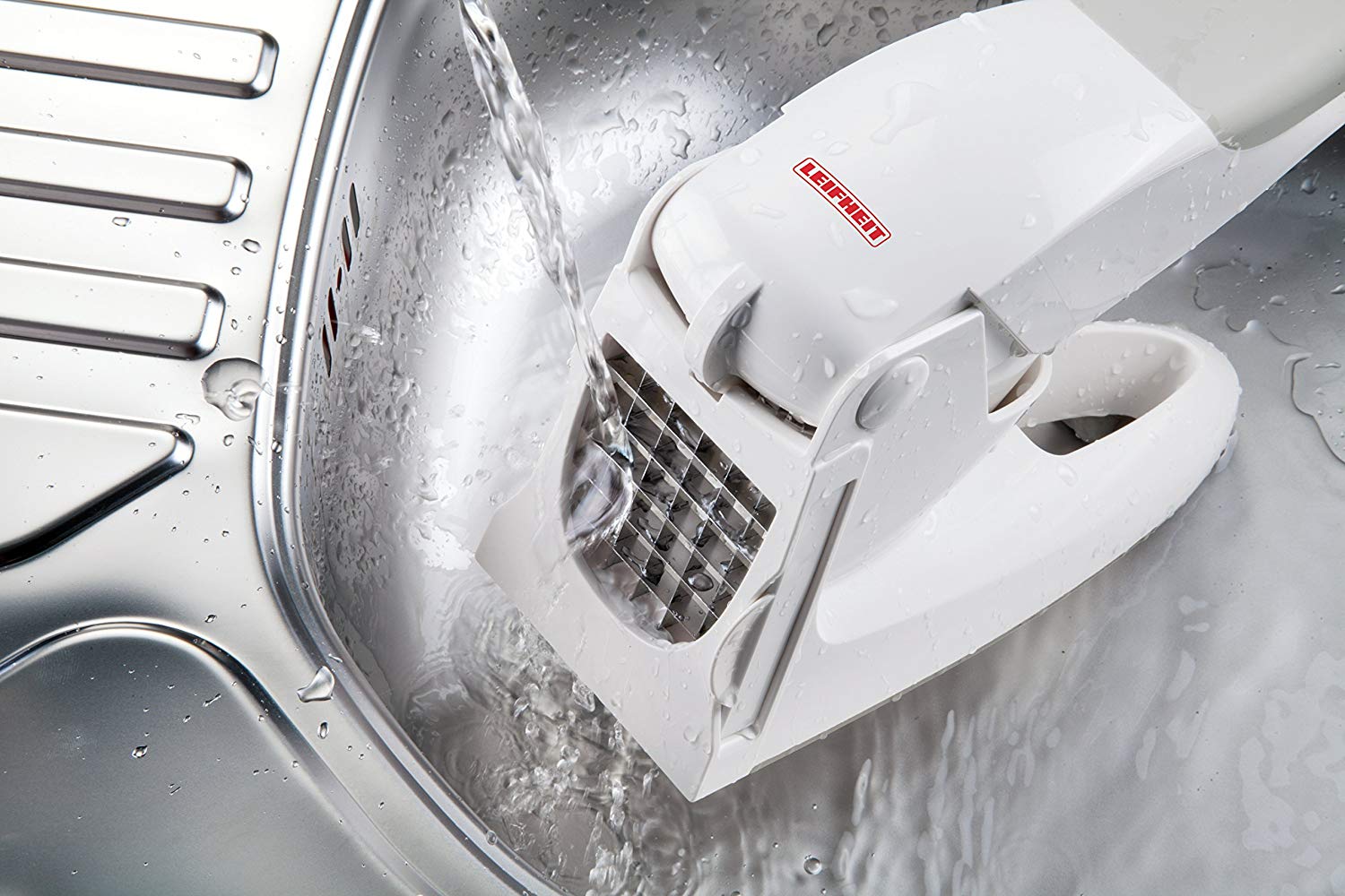 Easily cut potato and vegetable sticks with two blade inserts One press of the handle produces many sticks in 10-mm and 12-mm size For easy preparation of chips and healthy vegetable sticks The non-slip soft-touch zone on the handle makes cutting easier The base's anti-slip coating prevents slipping while cutting. 3-year guarantee
