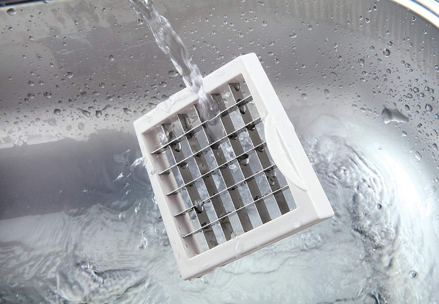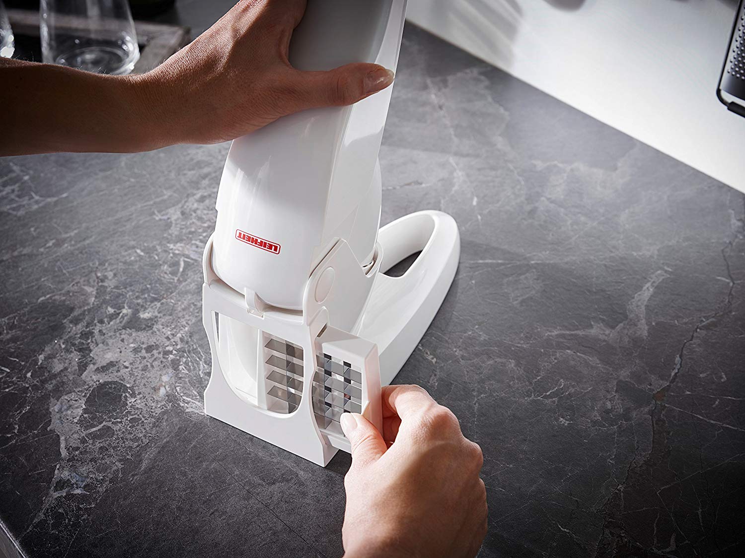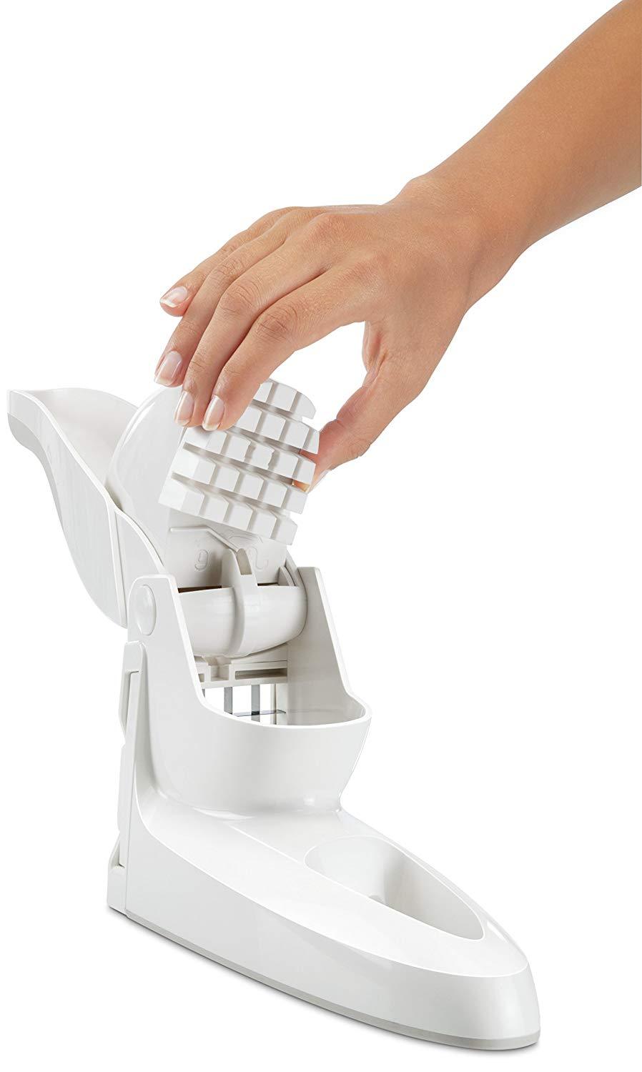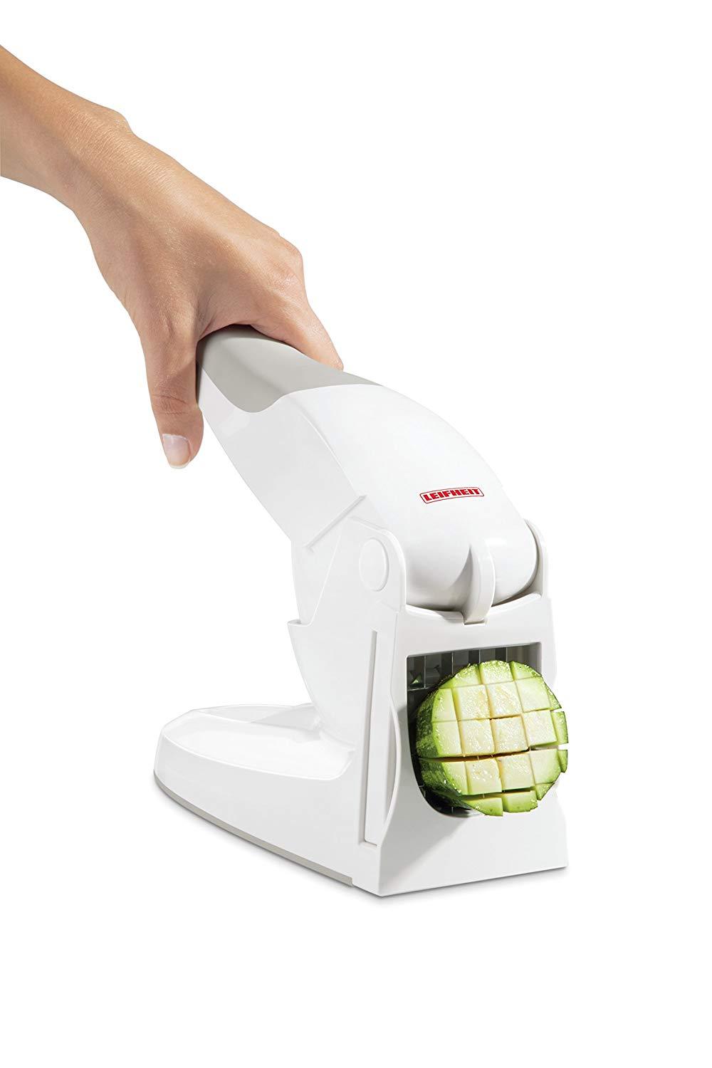 Easily cut potato and vegetable sticks with two blade inserts One press of the handle produces many sticks in 10-mm and 12-mm size For easy preparation of chips and healthy vegetable sticks The non-slip soft-touch zone on the handle makes cutting easier The base's anti-slip coating prevents slipping while cutting. 3-year guarantee