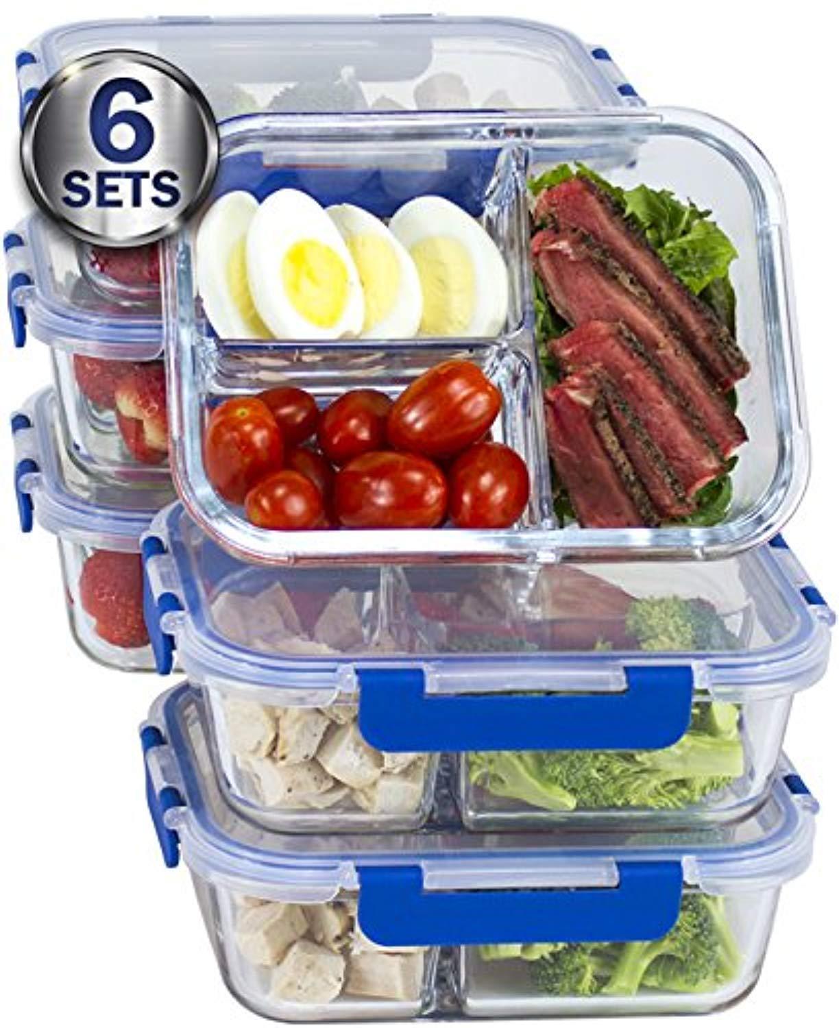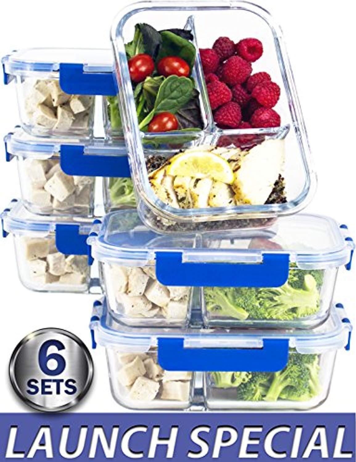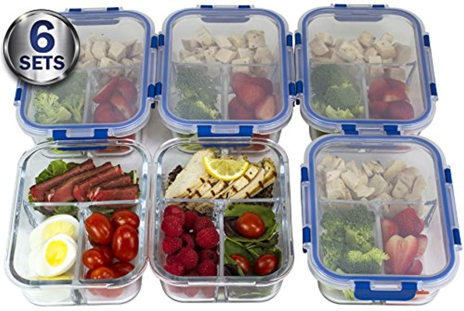 [LIFETIME LIDS 6 PACK] LARGE Premium 6 Sets 3 Compartment Glass Meal Prep Containers 3 Compartment with Snap Locking Lids, BPA-Free, Microwave, Oven, Freezer, Dishwasher Safe (4.5 Cup, 36 Oz,)