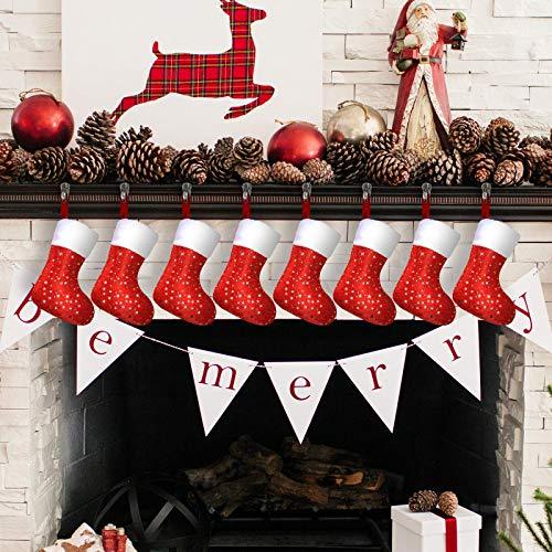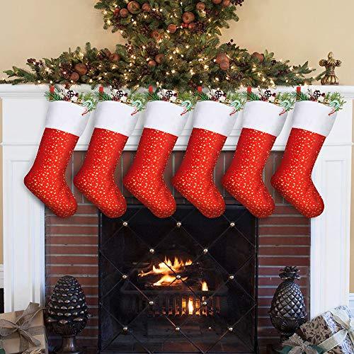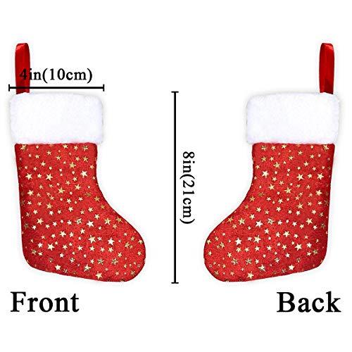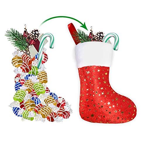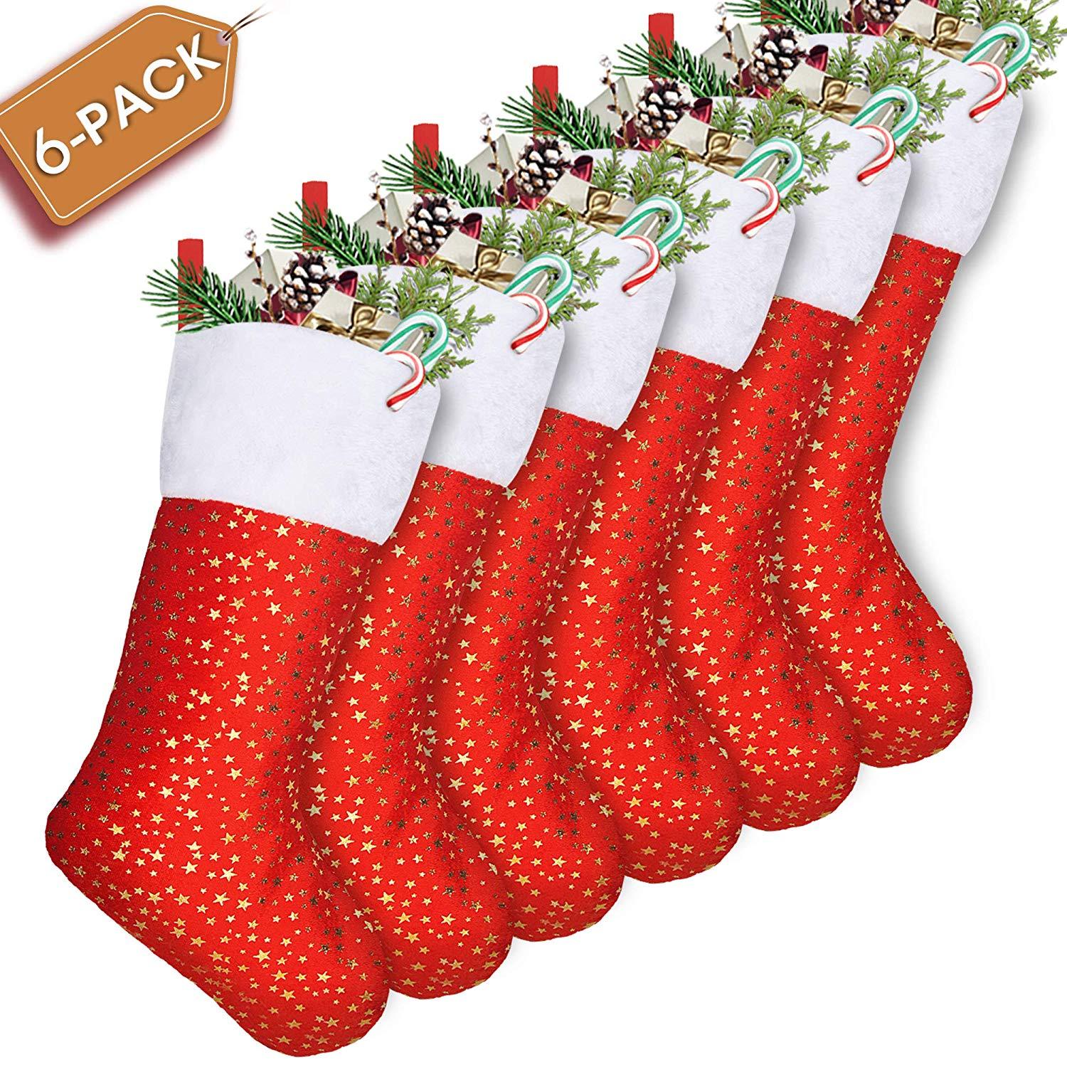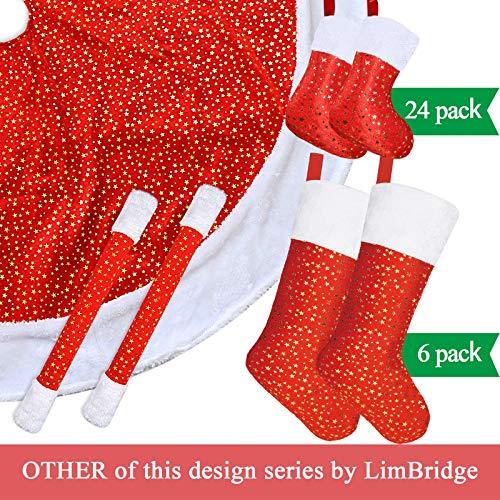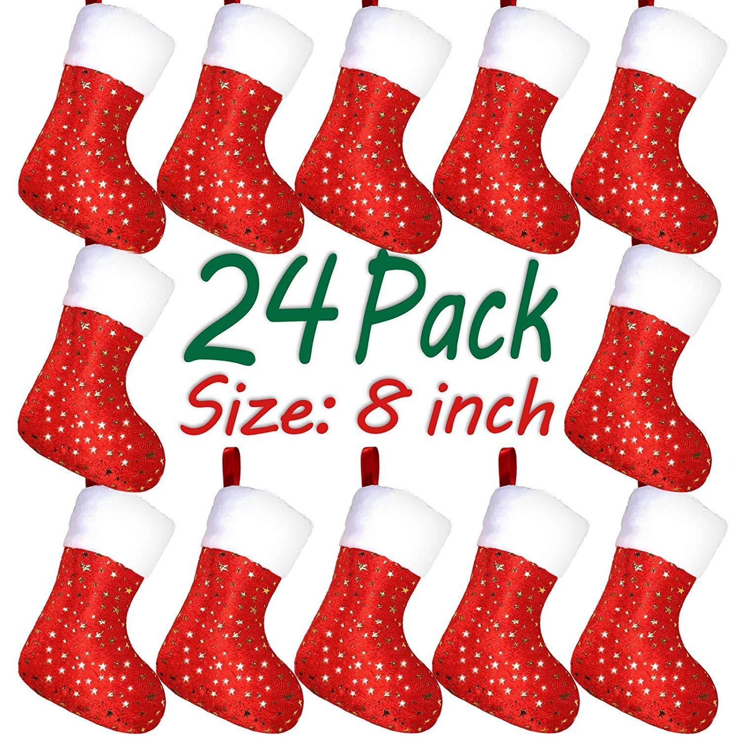 Original Design by Limbridge. Soft velvet material with white plush trim, classic red-white color match. Glittery golden stars design. Great addition to holiday decorations & seasons decor.													 							Super Value Pack of 24 Christmas stockings, 8" mini size. Perfect small gift wrap for friends, family, co-workers. Beautiful holiday decor, ready to hang on stocking holders on fireplace mantel.													 							Hold goodies, gifts, cane candies, gift cards, chocolates, little treats and other stocking suffers. Durable & reusable for many years.													 							Personalized stockings for you to embroider names on top wide cuff. Perfect gift for family and friends.													 							Match with LimBridge 18" golden star Christmas stockings, tree skirt & fridge door handle cover.