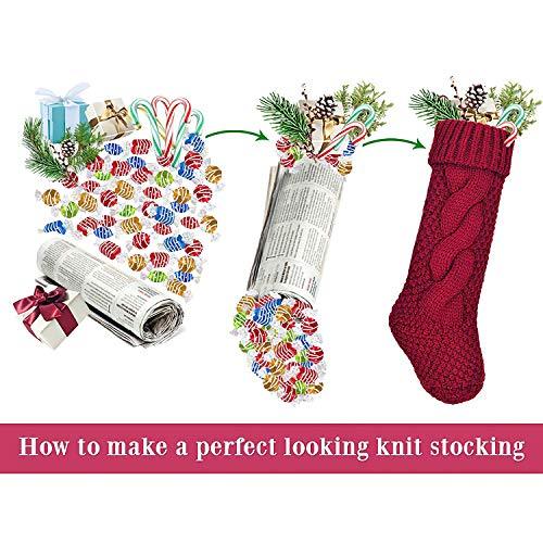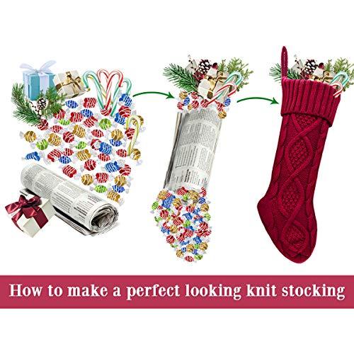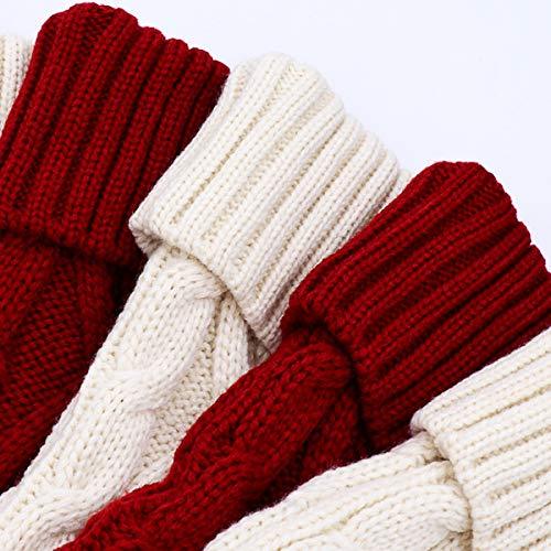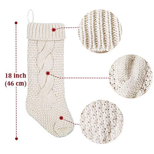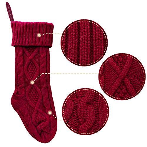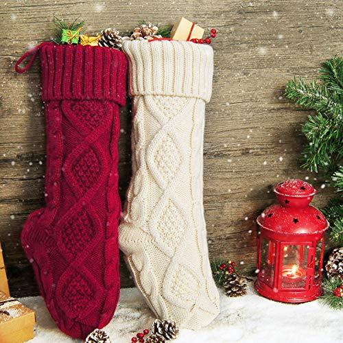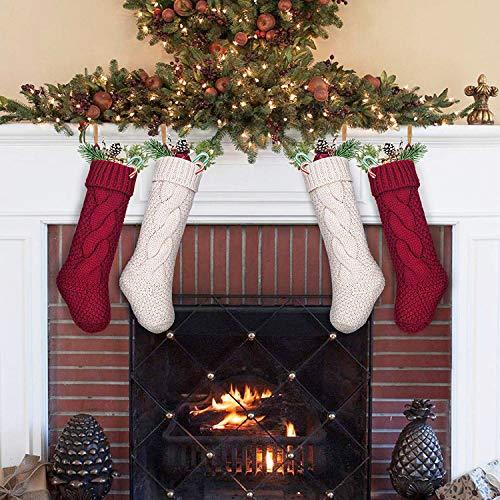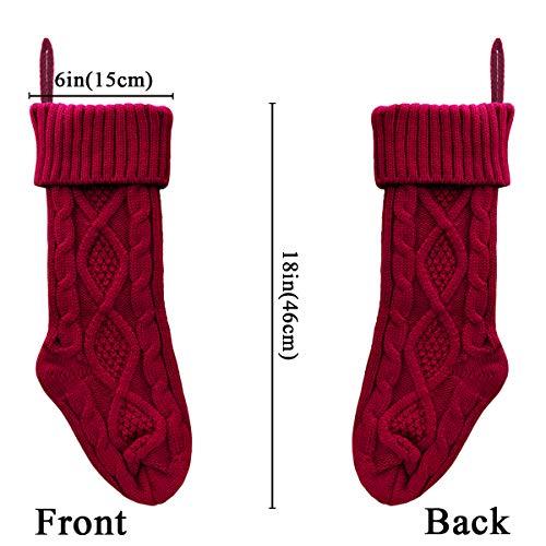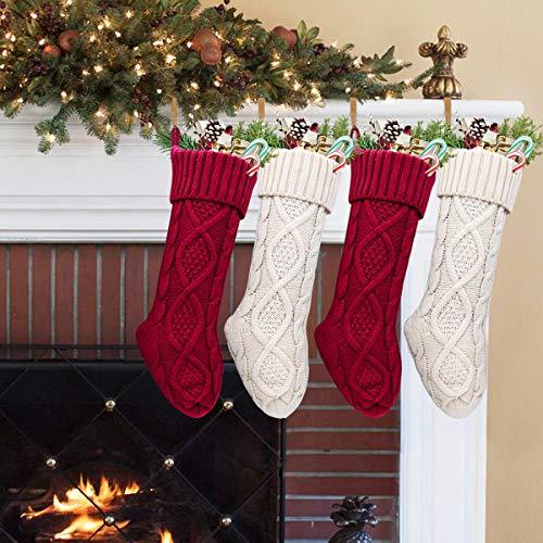 VALUE PACK of 4 rustic knitted Christmas stockings, 18" large size with wine red & off white. Cable knit pattern. Great addition to holiday decorations & seasons decor.													 							CABLE KNIT stockings. Beautiful stockings for Christmas decor, ready to hang on stocking holders on fireplace mantel. Create precious holiday memories.													 							HEAVY YARN, sturdy. Loose-knit by heavy yarn make they still stretch well. Neatly knitted on both size, no loose threads running out. Personalized Christmas stockings set for family. Durable & reusable for many years.													 							WARM FEEL, thick enough to hold gifts like a sweater. Custom Xmas stockings, ready to put names on them. Perfect Christmas ornaments gift for family and friends.													 							HOLD A LOT STUFF. 18" large Christmas stockings. Hold goodies, gifts, cane candies, gift cards, chocolates, little treats and other stocking suffers.