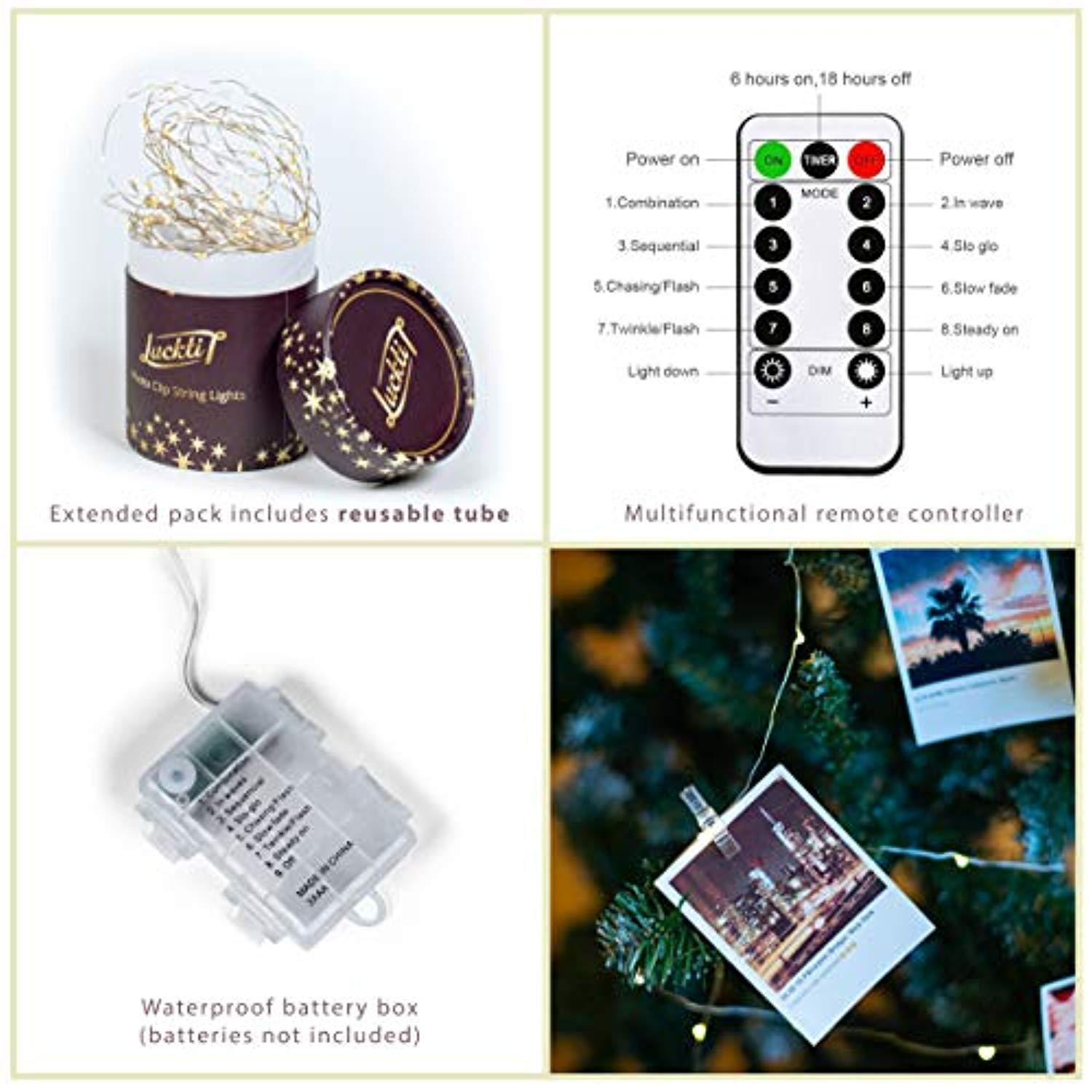 Luckti 30 LED 10 ft Photo Clips String Lights with Remote & Timer, Battery Powered Fairy Clip Lights for Hanging Photos, Cards, Pictures Holder for Christmas Home Decoration