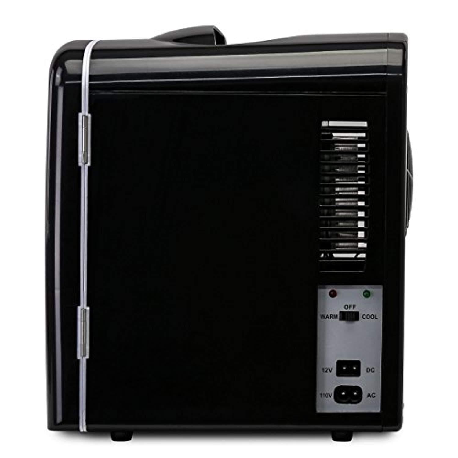 COOLING & WARMING - Enjoy cold drinks, fresh food & warm meals on the go, cools to 36 degrees lower than ambient temperature & warms up to 131 degrees Fahrenheit (55C) 4L CAPACITY - Conveniently store up to 6 cans of your favorite refreshments DUAL POWER FEATURE - 110V (AC) wall outlet & 12V (DC) cigarette lighter adapter included so you can use it at home, at your desk, in your dorm, in your car, or even on your boat THERMOELECTRIC TECHNOLOGY - High quality solid state cooling & warming system operates upright/sideways/upside down, no need for refrigerants (Freon free) FEATURES - This quiet & lightweight mini fridge includes a heavy duty locking latch, built-in carrying handle, fully insulated, removable shelf, WARM/COLD switch, & easy to clean interior