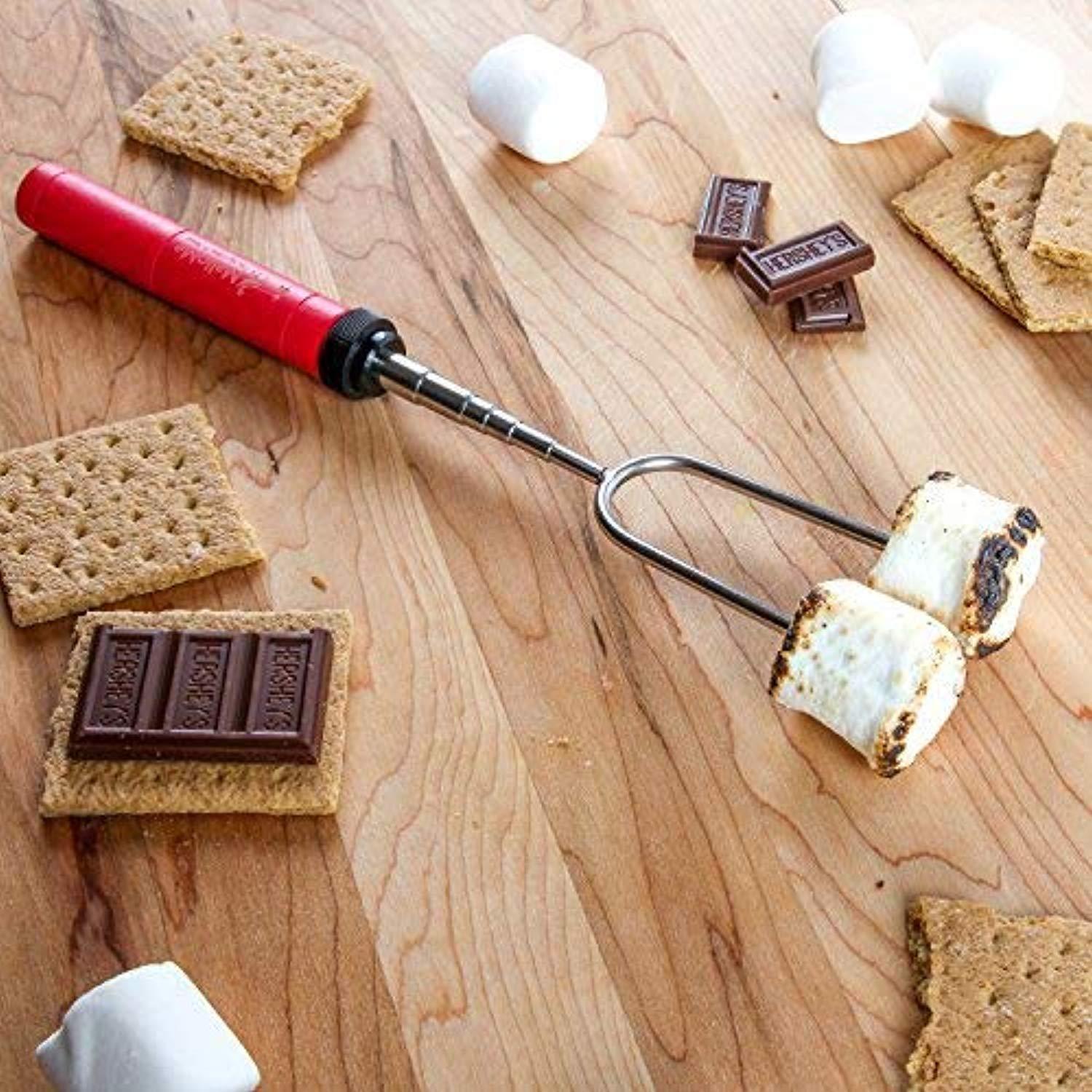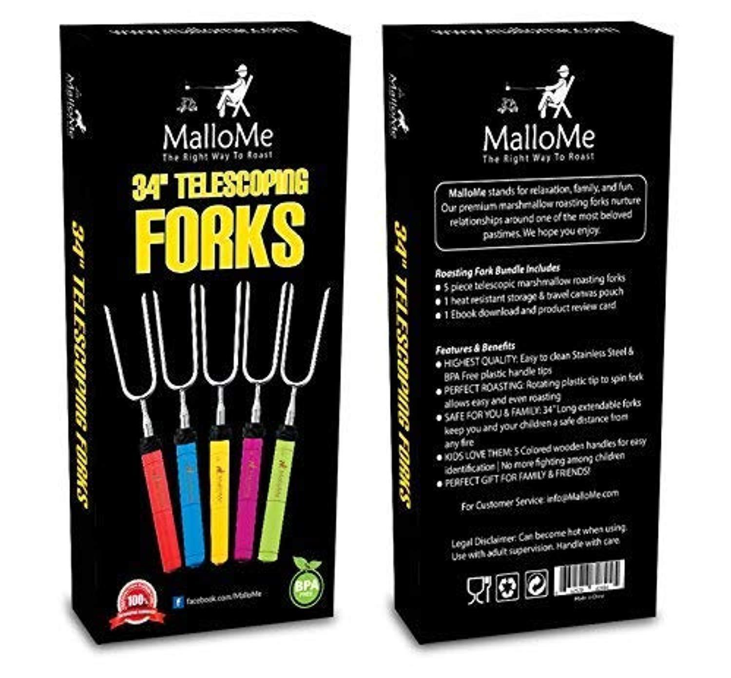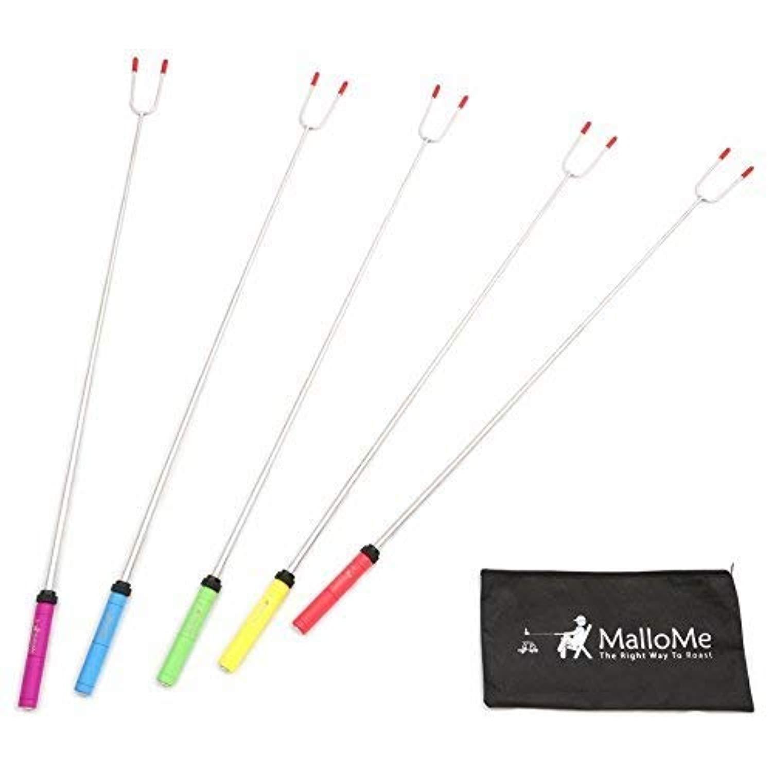 MalloMe Premium Marshmallow Roasting Sticks Set of 5 Smores Skewers & Hot Dog Fork 34 Inch Rotating Extending Patio Fire Pit Camping Cookware Campfire Cooking Kids Accessories – Bonus Bag & Ebook