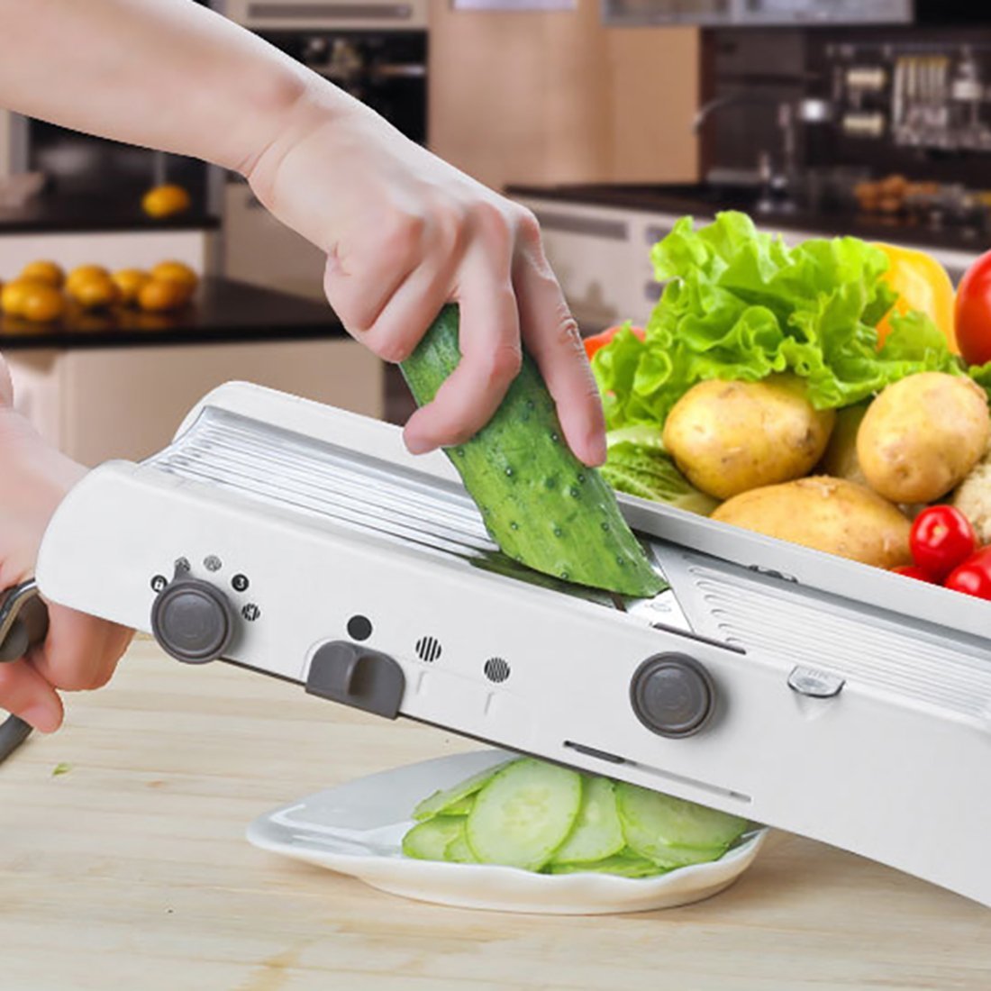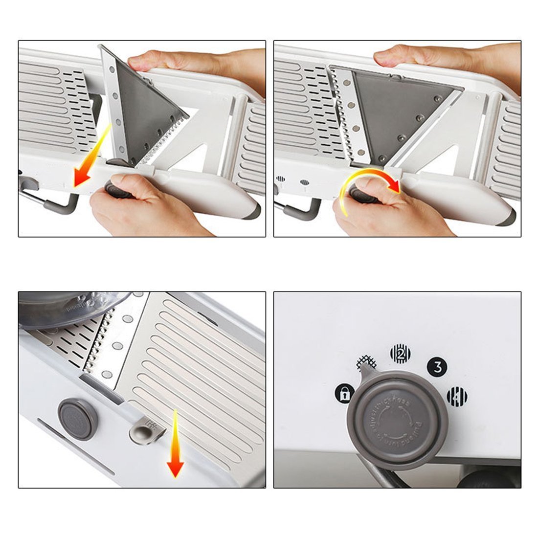 Adjustable Blades: Manual adjustment cutting blades of this vegetable slicer, which allows you to use the appropriate blade you need for many cut styles.