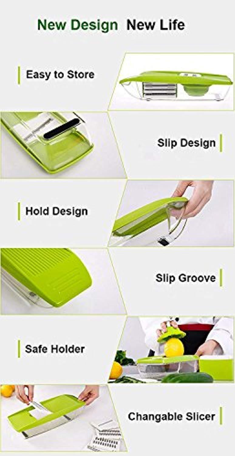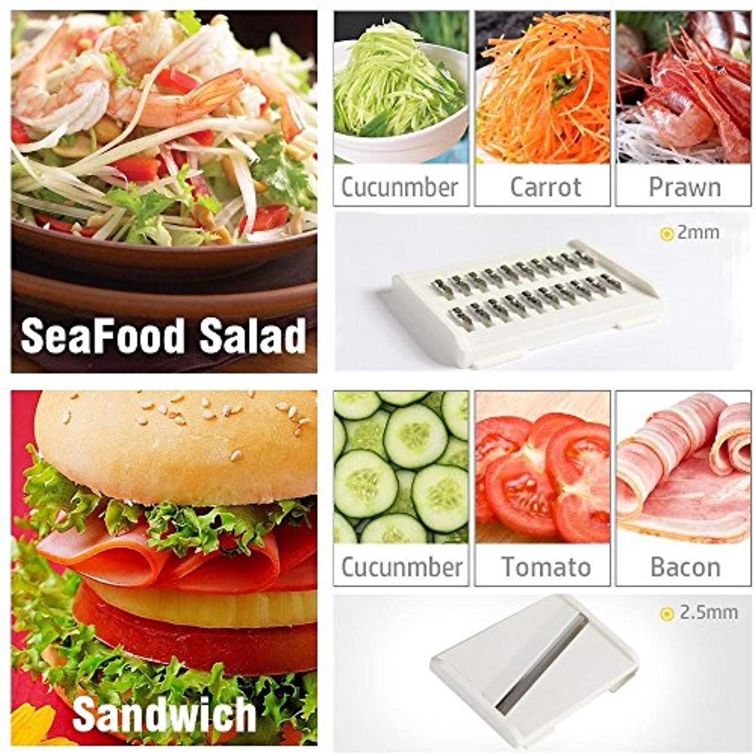 TOP QUALITY—Built from first-grade, BPA-free ABS food-safe plastic, and 5 ultra sharp Japanese premium stainless steel blades, guaranteed not to rust or lose sharpness over time.| CONVENIENT & USER FRIENDLY: Comes assembled and ready to use. All parts can be stored away neatly inside the food container after use. The 5 thickness settings can be easily accessed via the turning knob. Super easy and safe to use. CONTAINER MATERIALS—We use the food grade Transparent materials for the container, which have been past the FDA,CE,RoHS.So our Mandoline slicer is very safety. Pick Up the Perfect Spiral Slicer, Vegetable cutter, Vegetable Grater All In One. YOU CAN USE TO MORE KIND OF FRUIT AND VEGETABLE AND CLEAN--Use the fine grating blade to grate ginger, garlic, nutmeg, chocolate, etc. Use the crude grating blade to grate carrots, cheeses, etc. The choices are many, easy use the white brush to clean the Mandoline slicer.