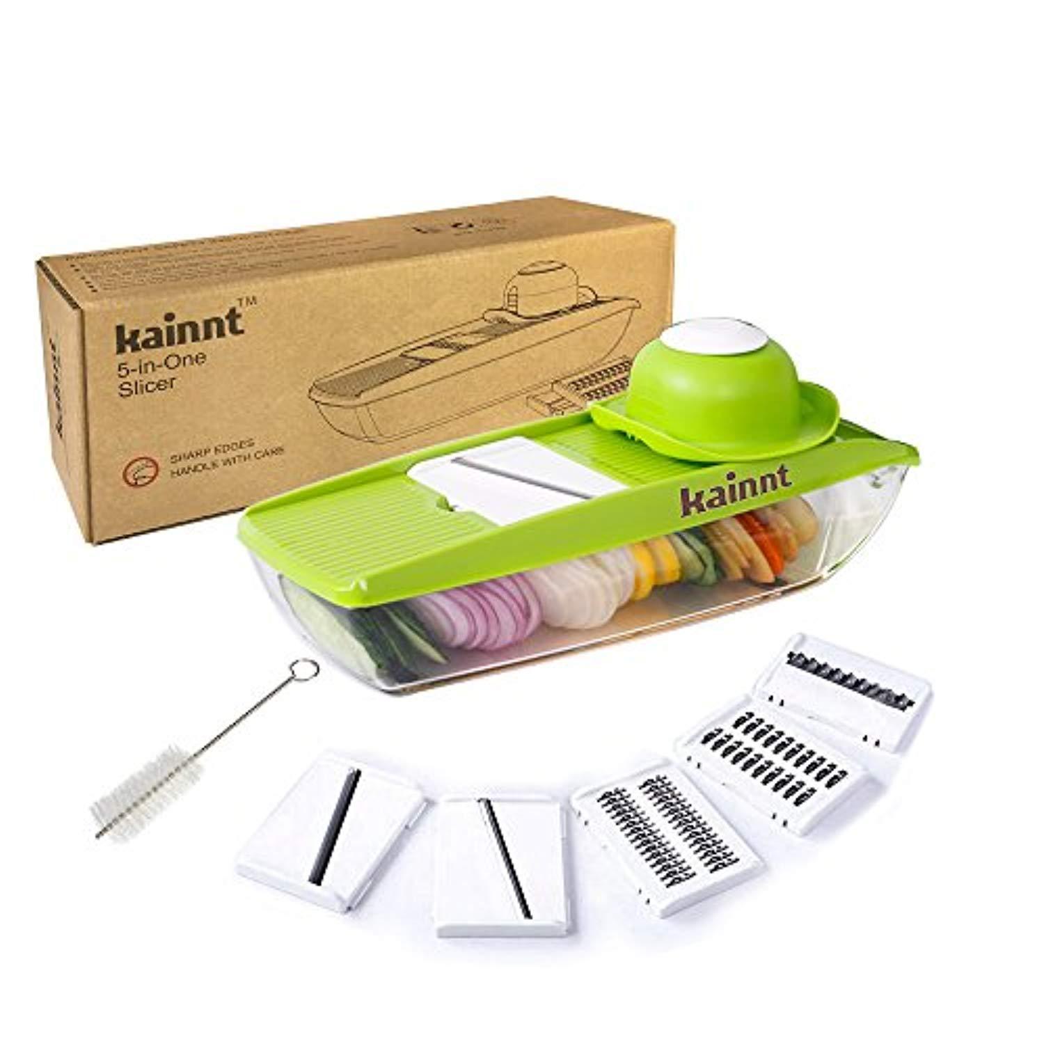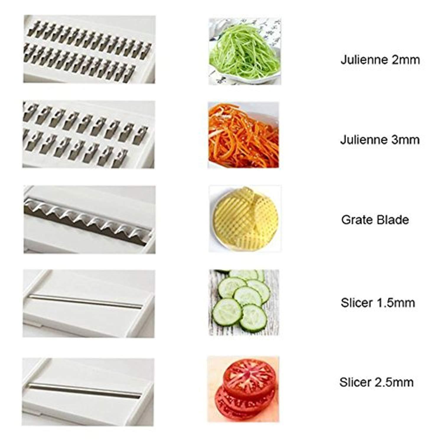 5 Interchangeable Stainless Steel Blades---We put 5 different Interchangeable Stainless Steel Blades thickness slicer settings easily adjustable, it can create 5 types of vegetable slices/julienne (Slicer 2.5m&1.5mm,Julienne2.0mm&3.0mm,one Grate Blade).A perfect gift for Moms, cooks and healthy-conscious people, making their kitchen life fun and easy. WHAT WILL YOU GET—We put the one white clean brush+ one set Mandoline Vegetable Slicer including the 5 different Interchangeable Stainless Steel Blades thickness slicer, you can use the white clean brush to clean your Mandoline slicer.