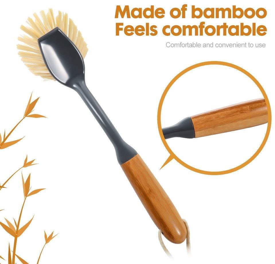 The bristles are made of special TPR material, proper hardness and safe for all surfaces, unlike plant fiber is nondurable and easy to drop. The workmanship of our brush is excellent and will not deform even if be used for a long time. Bamboo handle is very comfortable and easy to grip, won't hurt your hands when you use it. Beautiful, functional and Durable and non-wear.