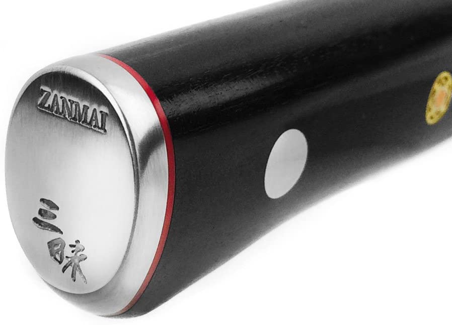 33-layer Damascus blade with super-steel VG-10 coreTriple-riveted black pakkawood handle complimented with red spacersHandle features a traditional Japanese mosaic accent decorative pin60-61 Rockwell hardness with 9-12° blade angleEngraved stainless steel end cap adds balance; Handcrafted in Seki city, Japan