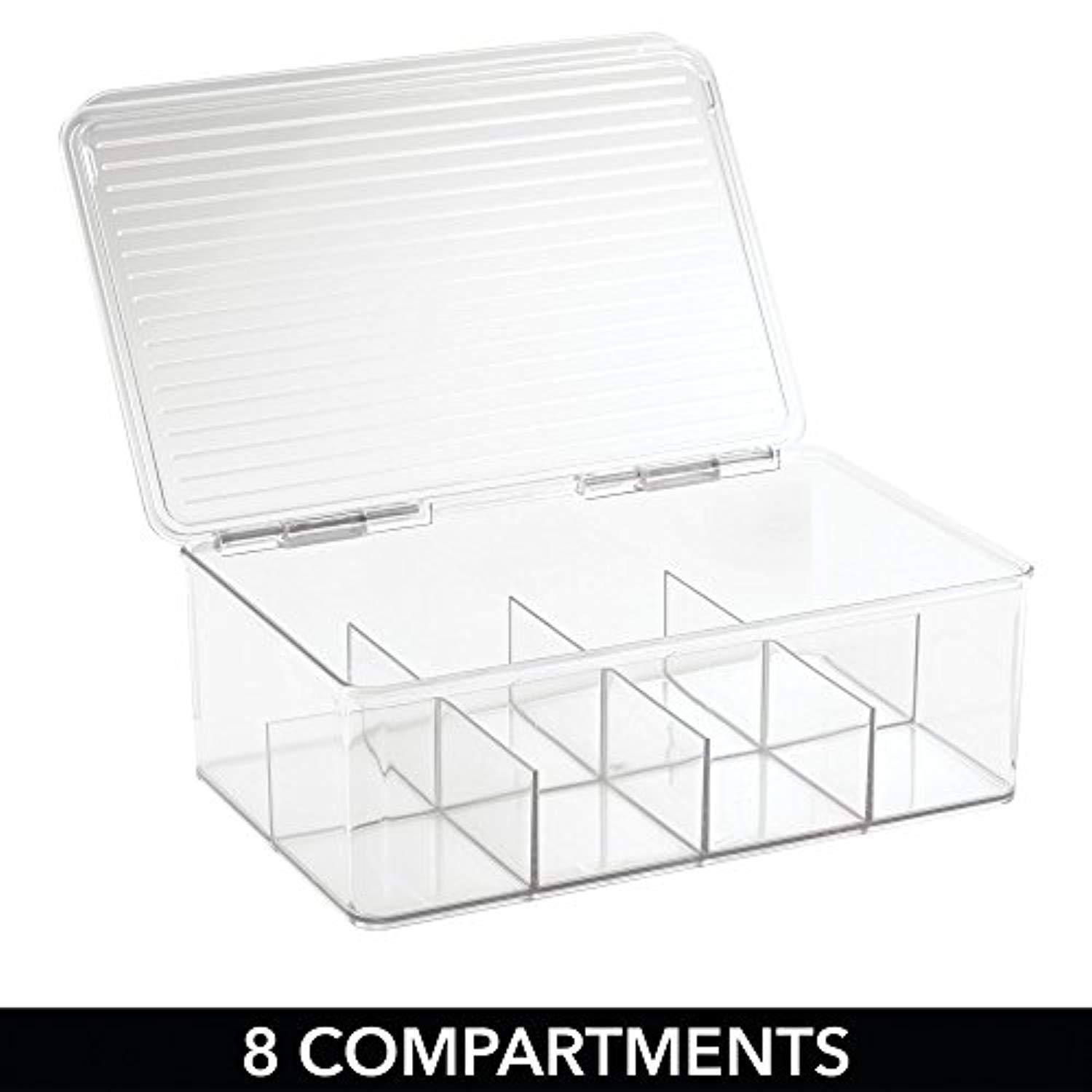 HINGED LID: Hinged lid easily opens to make grabbing what you need simple; Clear construction makes it easy to see what is stored inside; Stack organizers to create space-saving vertical storage; Create a beverage center in your kitchen with this convenient storage bin