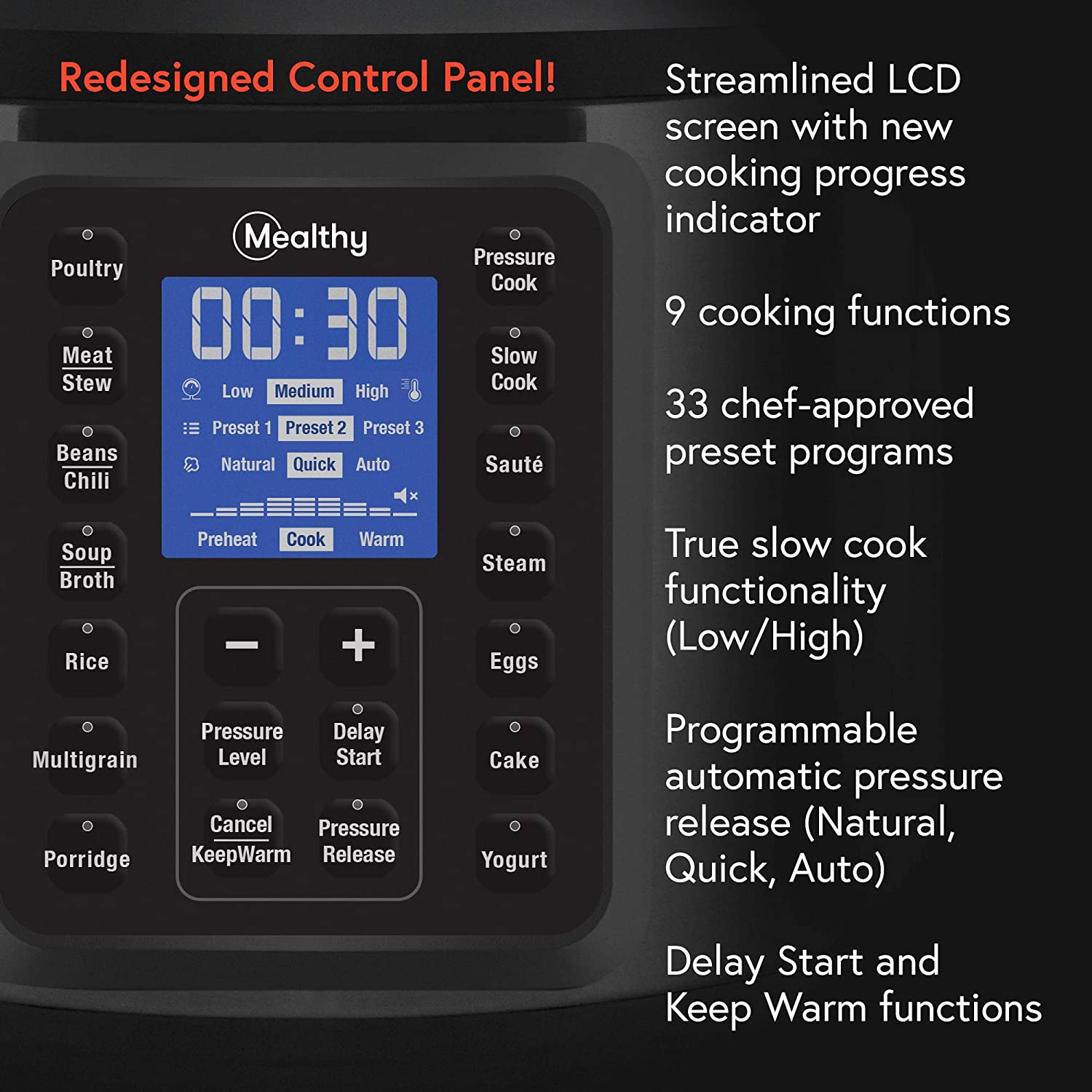 PRESETS THAT MAKE SENSE: Our 33 new preset cooking programs correspond to cooking methods tested by our in-house chefs and recipes on the Mealthy site and app: Poultry, Meat/Stew, Beans/Chili, Soup/Broth, Rice, MultiGrain, Porridge, Steam, Egg, Cake, Yogurt, Slow Cook, Saute, and Manual Setting (Pressure Cook)