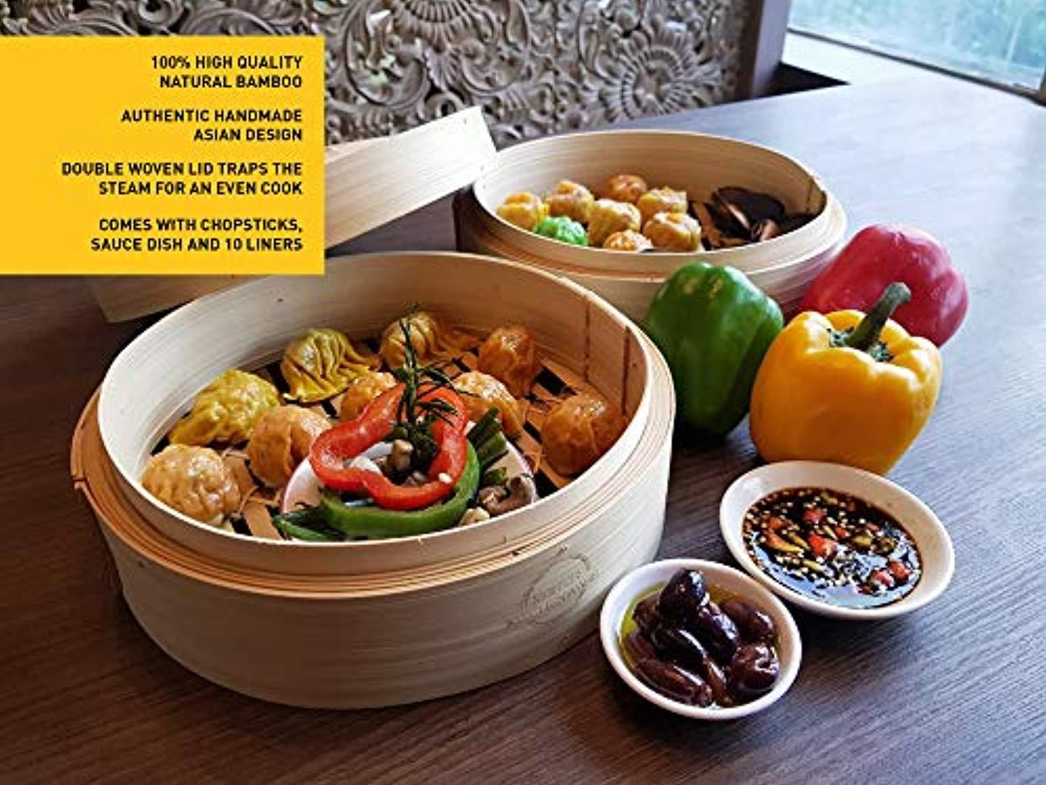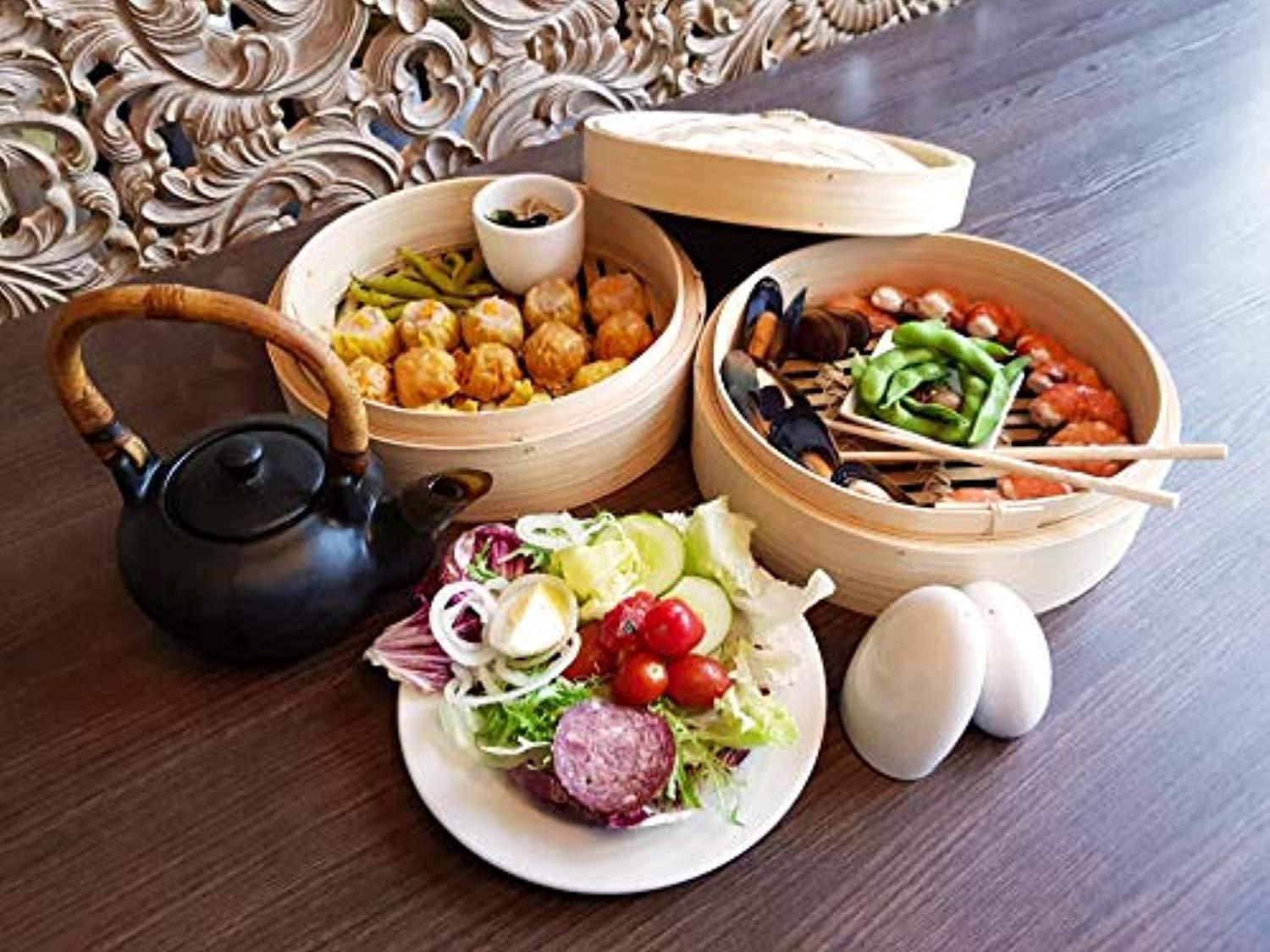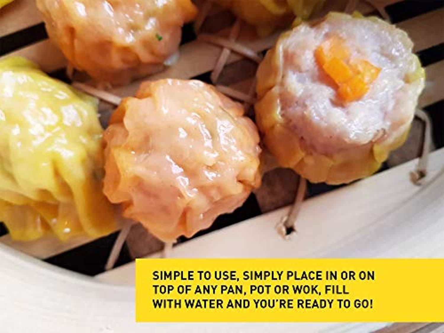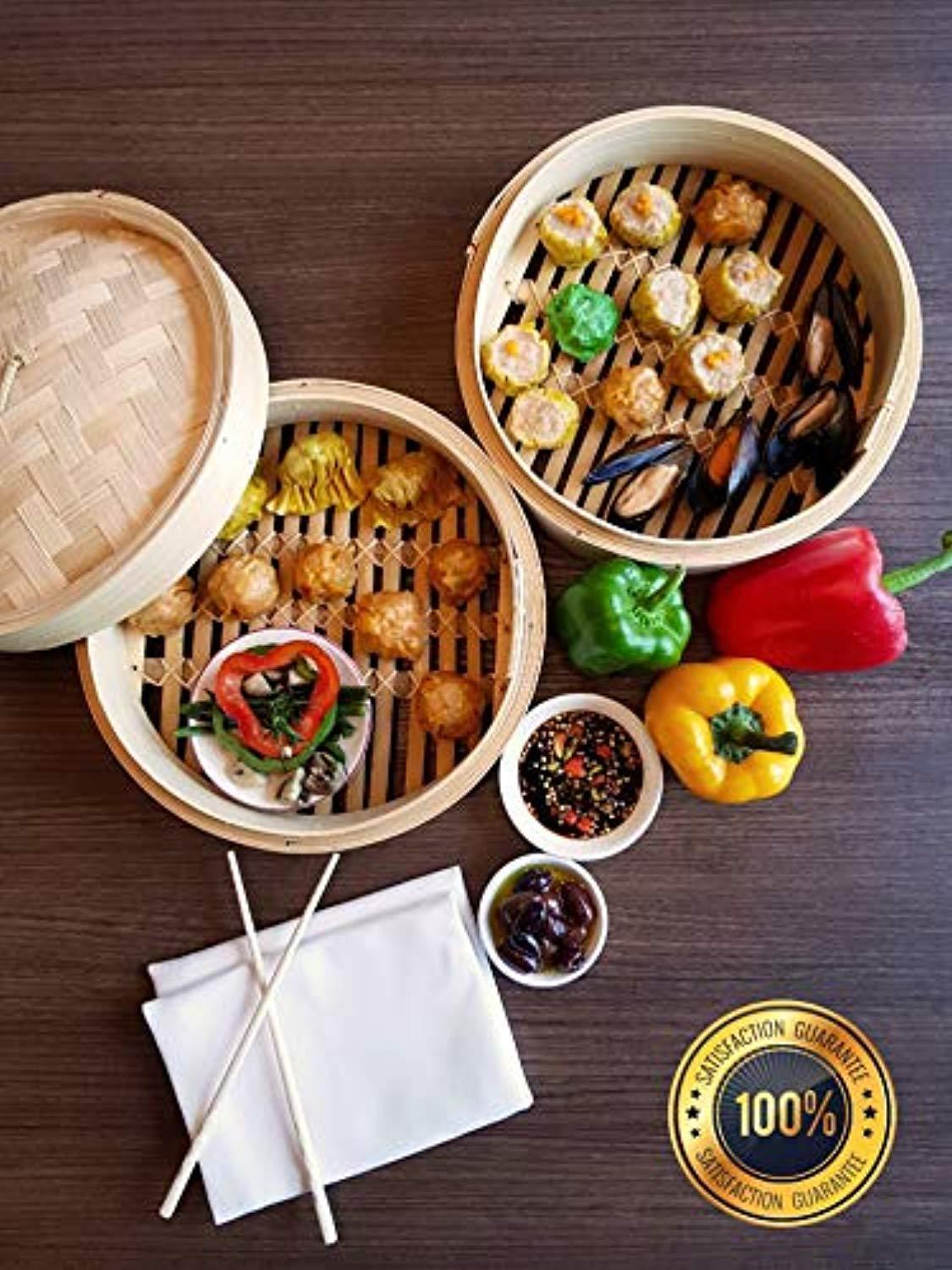 2 TEIR CONSTRUCTION - Bamboo steamers can have stackable layers with slatted bottoms. Such multi-level steamers are highly efficient as they allow you to steam multiple items simultaneously. our two tier baskets allow the space to cook or reheat more servings at once. Each Tier Offers 10" Diameter x 2.4" Depth; Interior Diameter: 9.25" STEAMED FOOD TASTED BETTER - Bamboo steamers absorb the excess moisture which in turn prevent condensation from dripping on the food. Constructed of a circular bamboo frame, the steamer features a slatted bamboo bottom that allows steam to move freely within the cooking chamber. The domed bamboo-mesh lid helps circulate heat. If you don’t like soggy veggies, you have yet another reason to use a bamboo steamer. HOW TO CARE FOR YOUR BAMBOO STEAMER - Bamboo steamers are not dishwasher safe. Vinegar is a natural safe way to disinfect and deodorize it. Use a half a cup of vinegar in one gallon of hot water to soak a cloth in and lightly squeeze out the water from the cloth. Wipe over the bamboo steamer with the cloth and repeat this method a few times until clean. Rinse the cloth in hot clean water and wipe the bamboo steamer over once more. Let your bamboo steamer completely dry on the rack before putting BACKED BY OUR 60 Day 100% HASSLE FREE MONEY BACK GUARANTEE - If you are not completely satisfied with our Bamboo Steamer set we offer a 60 day 100% money back guarantee, no questions asked. We are that confident that you will love this steaming basket and we are willing to offer this money back guarantee.