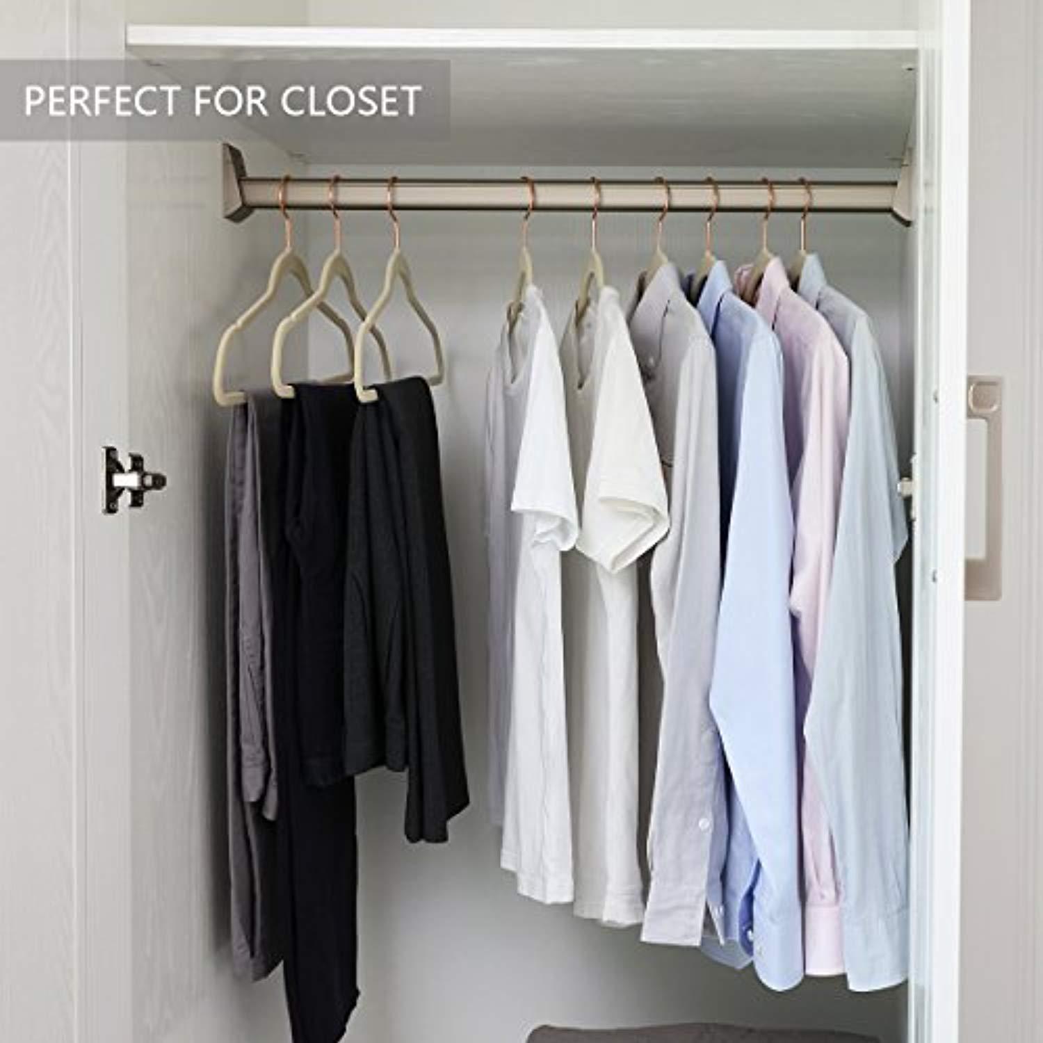 ✔【Full Adult Standard Size】- (LxWxH): 17.5"x0.2"x9" inches.Made of Top Quality ABS Plastic, Eco-friendly Ivory Nylon Flocked, Rose Gold Hook/Copper Hook.VALUE PACK of 50 pcs . ✔【Swivel Rose Gold Hooks】- can be 360 degree rotated, which easy sorting of clothes no matter which direction you hang your clothes, strongly attached to our durable hanger so the hook doesn't detach or snap easily ✔【Super Strong】- MIZGI velvet hangers with 2019 NEWLY improved quality made of premium grade plastic. Rest assure that it will steadily hold even the heaviest clothes in your closet, can hold large capacity from 5kg to 8kg(11lbs to 18lbs).It is stronger and much lighter than wooden suit hangers but sturdy to hold heavy coats without getting bent ✔【Nonslip】 - Supreme soft luxurious velvet flocked instead of plastic or metal leaves no crease on the pant when you fold them over.Prevents slippery or wide neck clothes from slipping off the flocked hangers, no shedding or fading on your white clothes with latest flocking technique. Great coat hangers for suits, shirts, coats, sweaters, skirts, dresses and pants etc ✔【Double Maximize Closet Space】 - Designed ivory velvet hangers Increases Closet space by as much as 50 percent.The slim and sleek design felt hangers works for your closet efficiently, maximizing space and adding class, helping you organize your wardrobe in the most space efficient manner ✔【100% Satisfaction Guarantee】- MIZGI is different kind of Company that prides itself in providing the absolute best customer service , if you has any questions for this boutique hangers and it is not suitable for you. Send 1 simple email to Clicking "Ask seller" and received a 100% money back. (In fact, you do not need to send back)
