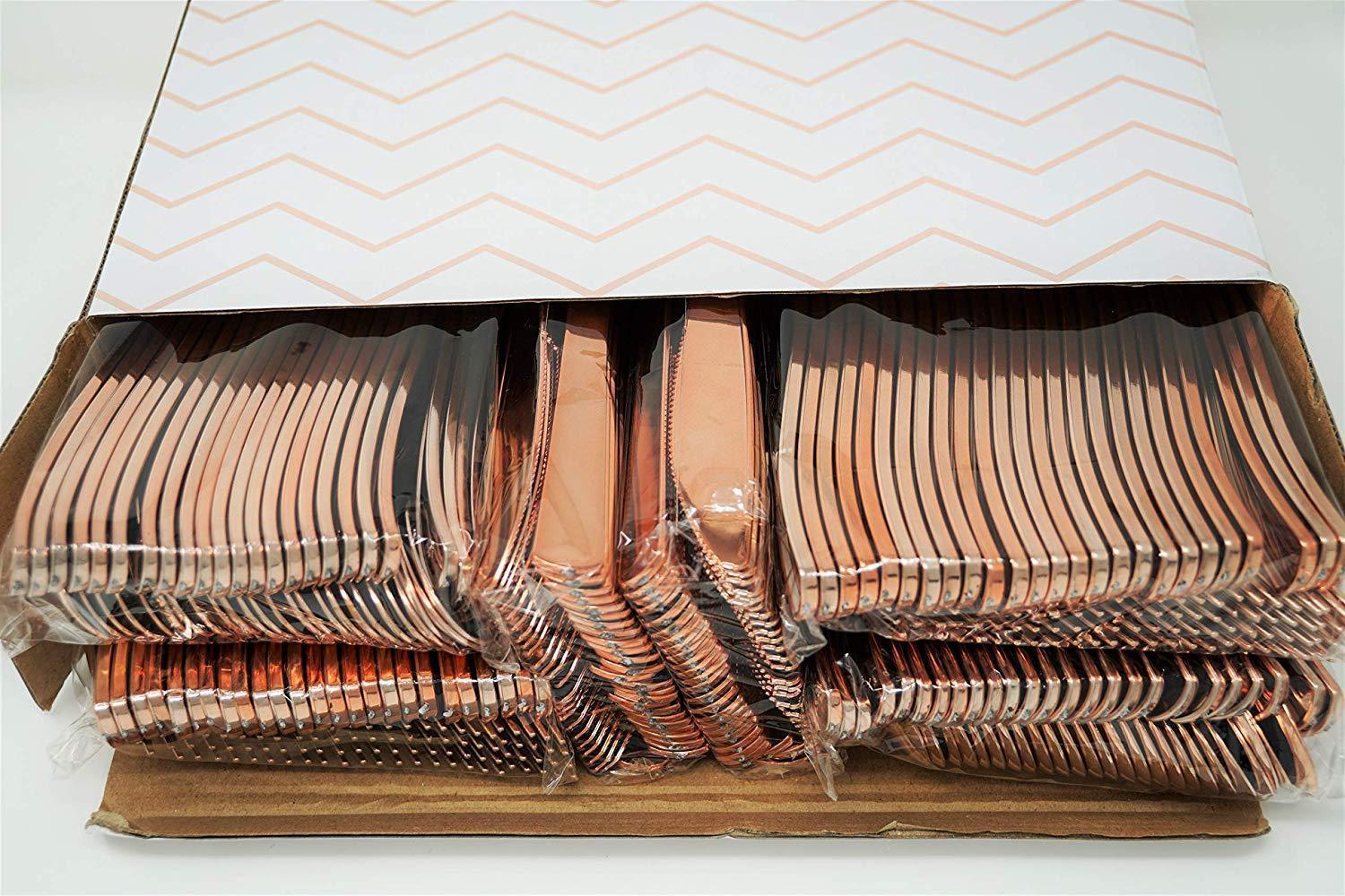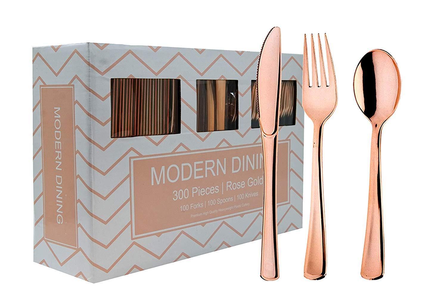 Modern Dining | 300 Rose Gold Plastic Silverware Cutlery Heavyweight Premium Quality Disposable Flatware Set Perfect Utensils for Weddings & Dinner Parties | 100 Forks, 100 Spoons, 100 Knives