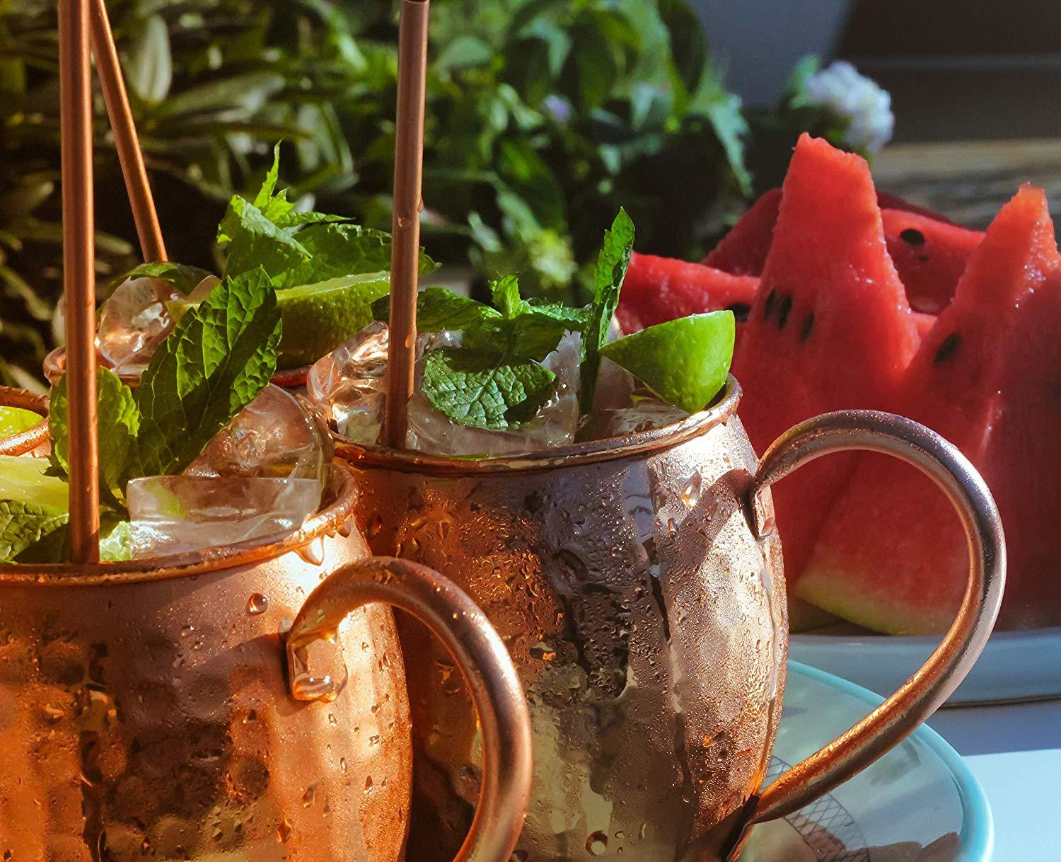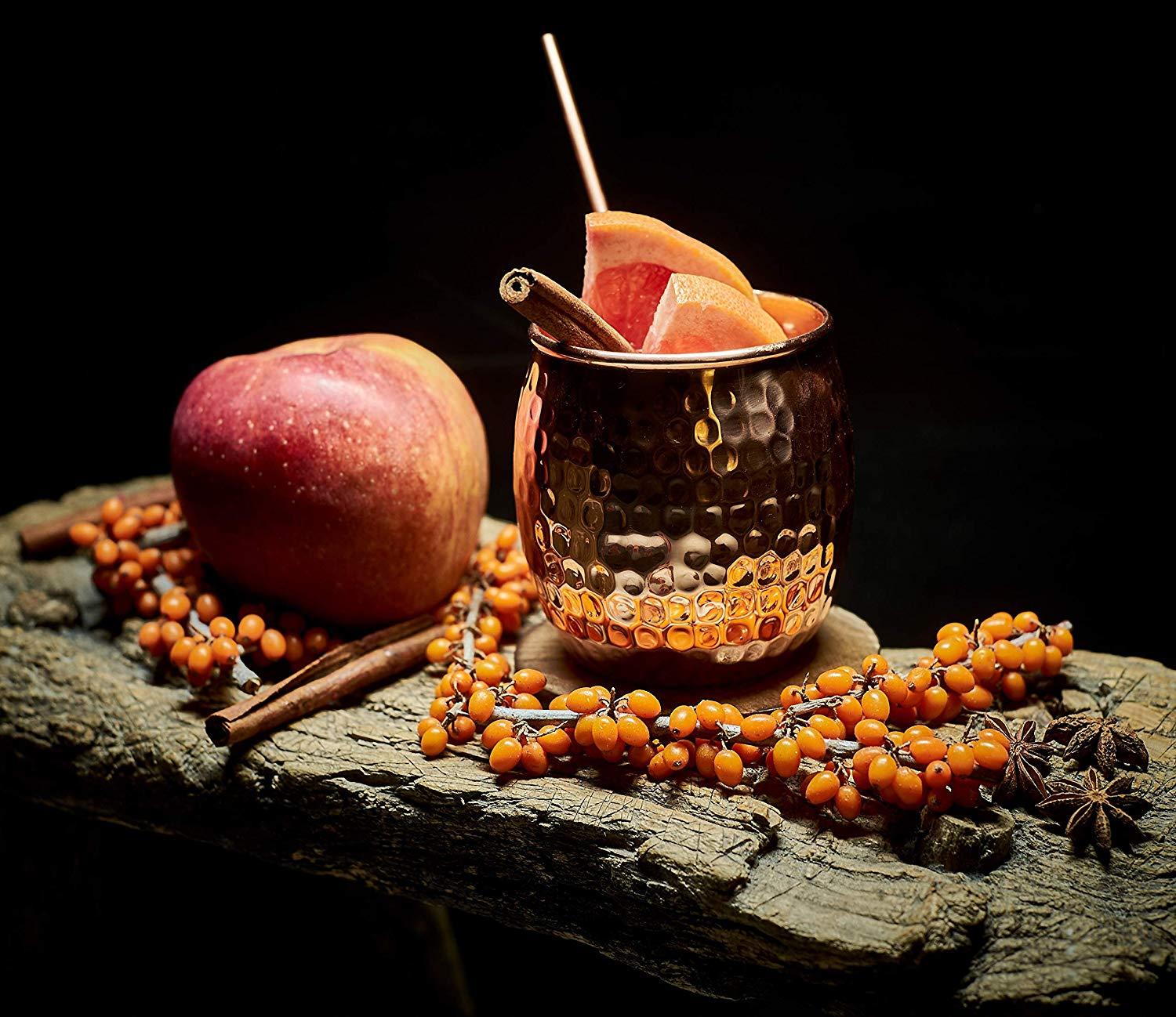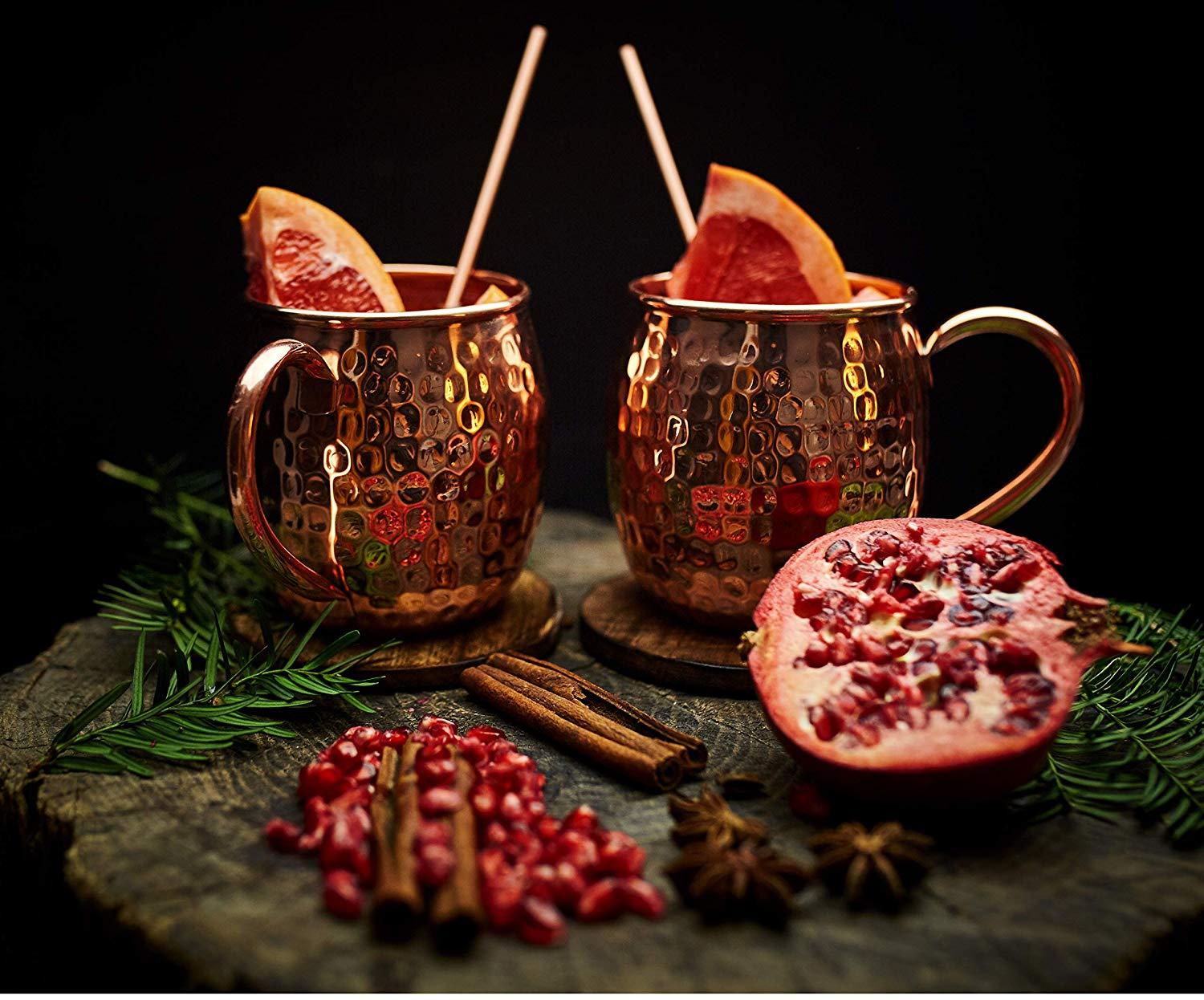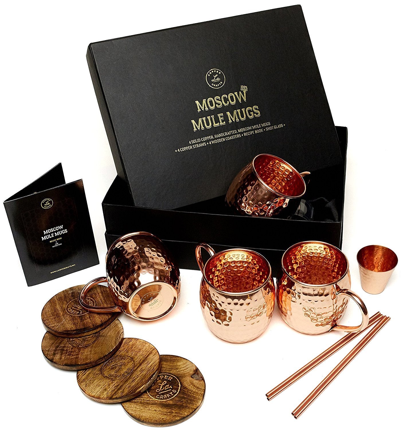 Moscow Mule Copper Mugs Set - 4 Authentic Handcrafted Copper Mugs (16 oz.) with 2 oz. Shot Glass, 4 Straws, 4 Solid Wood Coasters and Recipe Book - Gift Box Included