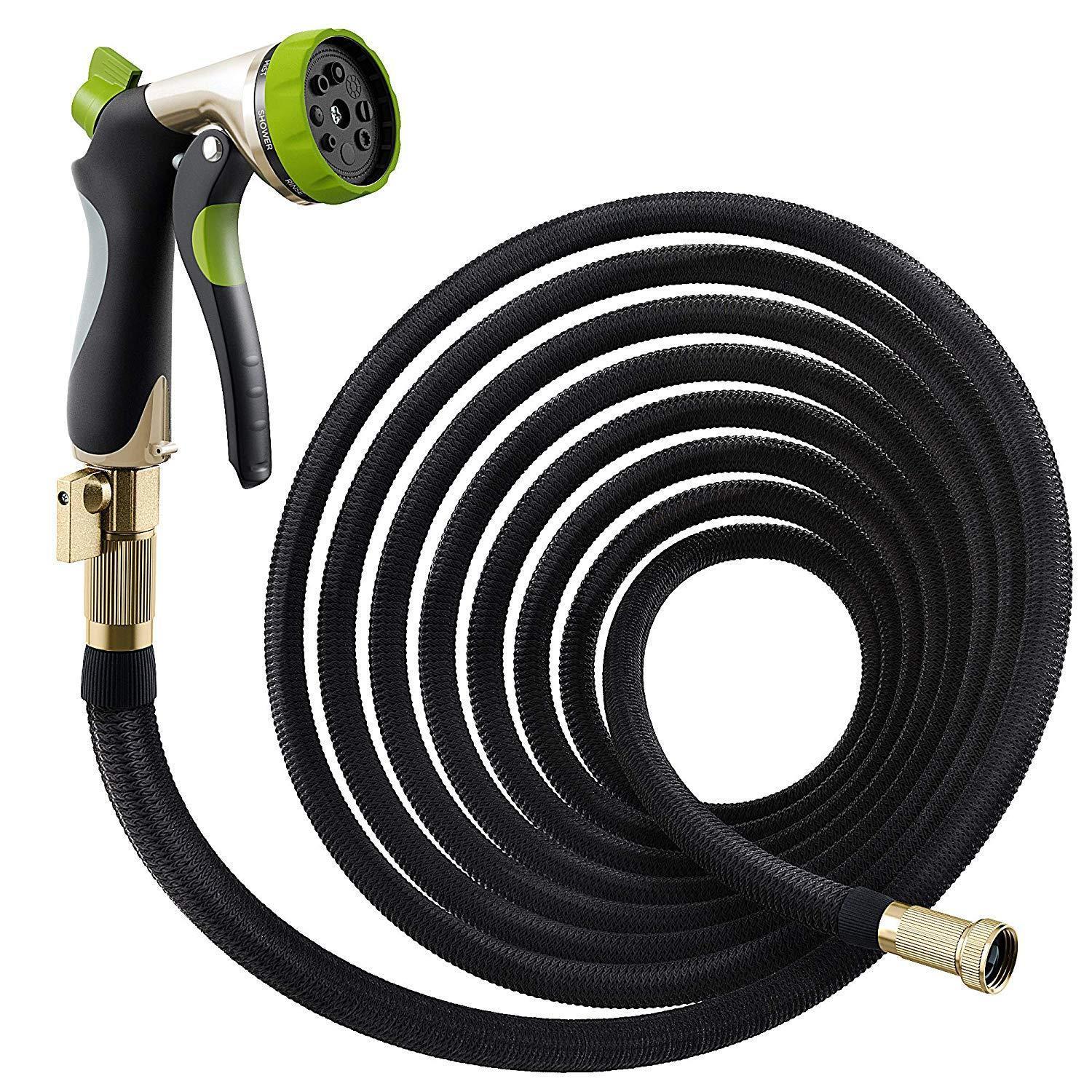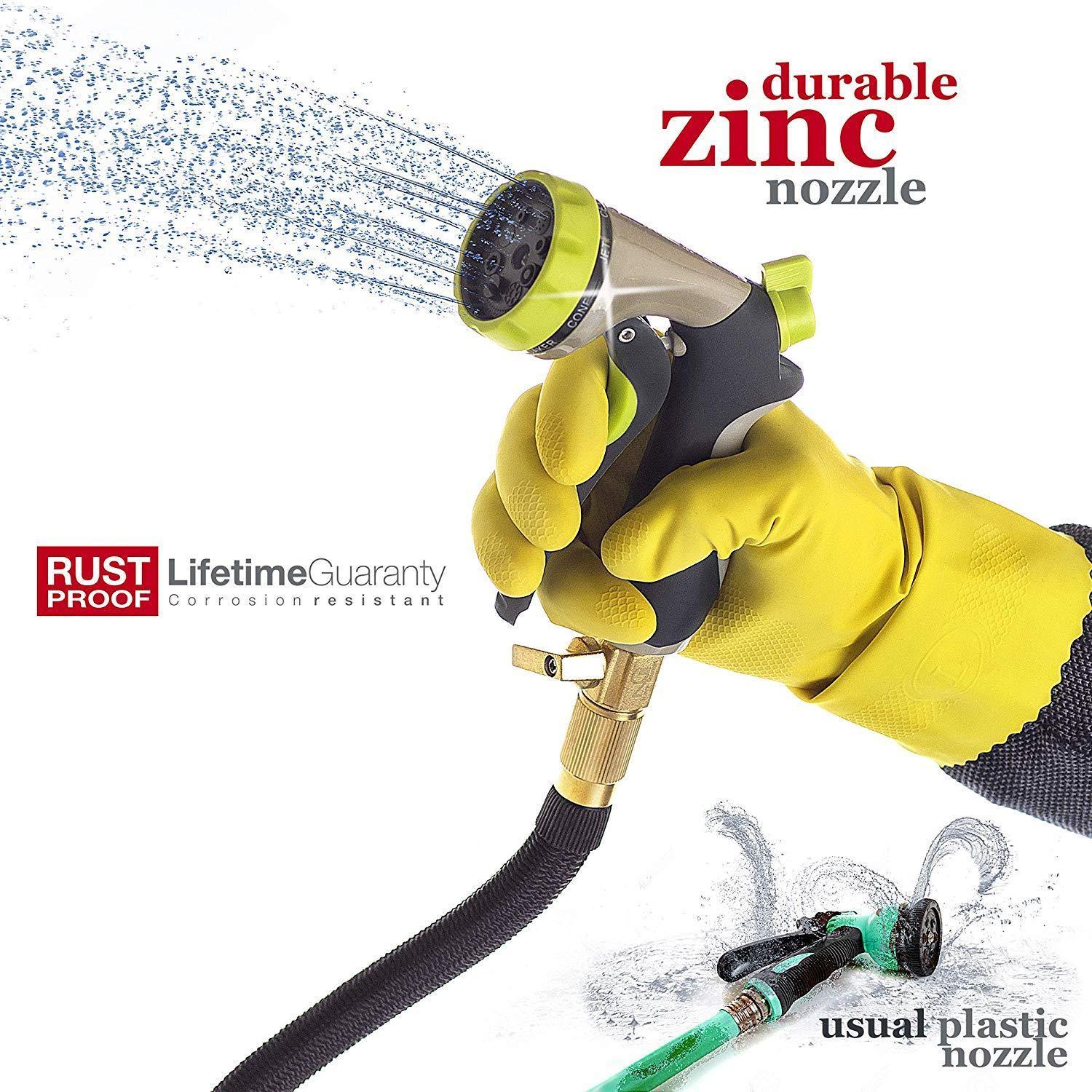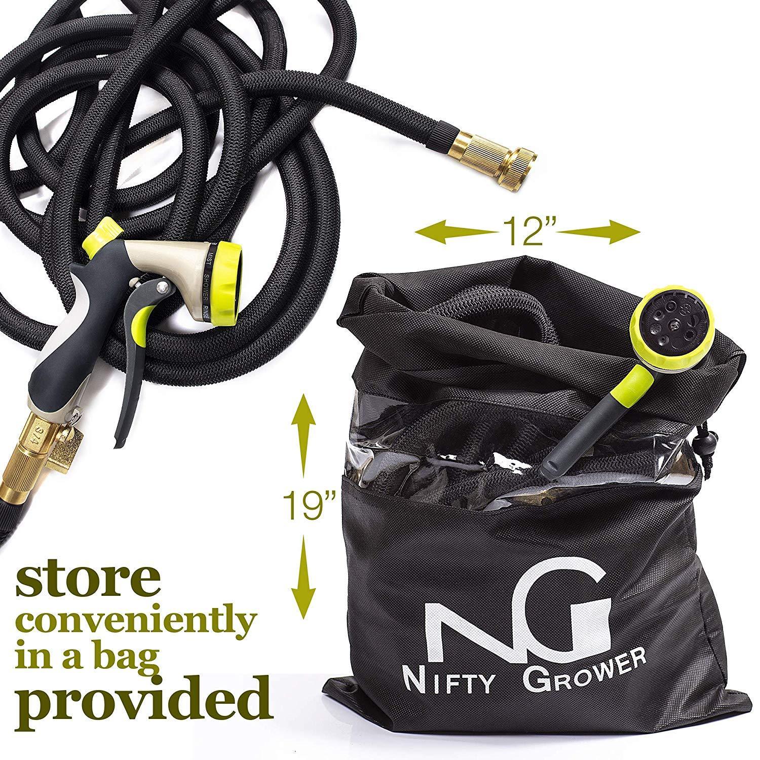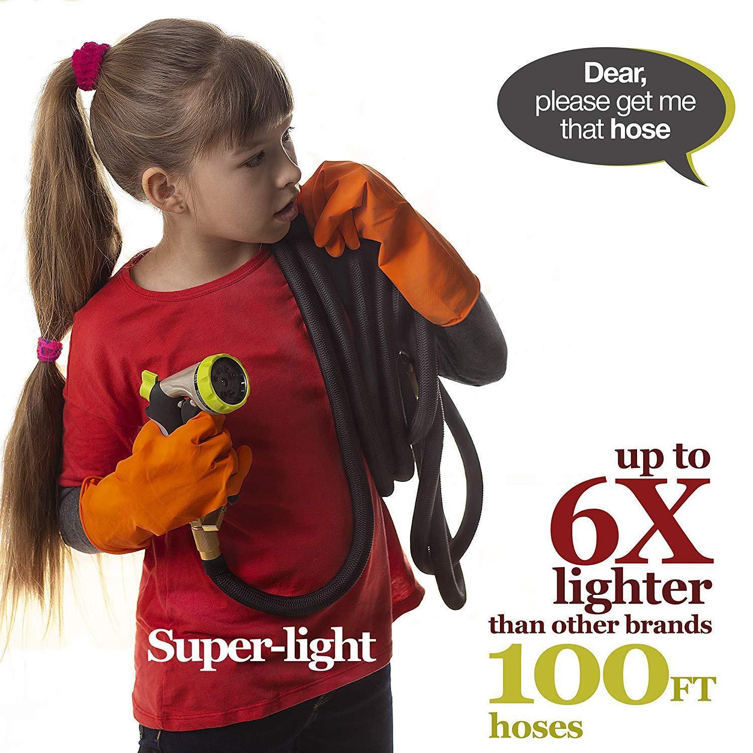 INCREDIBLE DURABILITY - no more leaks, tear or cracks: solid 3/4 Inches brass connectors, rubber washer, double latex pipe, sturdy on/off valve, zinc alloy spray nozzle, extra-flexible 3750D polyester fabric cover; the hose can withstand water pressure 3-12 Bar and temperature 41℉-113℉ - this garden hose for long-term use FLEXIBLE DESIGN - this expandable hose starts out from 34 Feet; when the water is turned on the hose quickly expands up to 3 times in length (100 Feet) with the water pressure (3-12 Bar) and returns in minutes to its original length when the water is out. Just make sure there is enough water pressure to expand the hose FREE 8 PATTERN HOSE NOZZLE - durable zinc alloy construction; the rubberized outer coating is slip-resistant and comfy; water controlling knob for changing the water pressure; rotating bezel for easy choosing kind of spray. Select right type of the stream and water plants, clean garden or pool, shower pet or wash car EASY TO STORE - lightweight, highly portable, flexible hose comes with a free storage bag - simple way to save your storage space. Just drain water from the hose when not in use, put in the bag and store out of direct sun. Besides that, the water hose in the bag can serve as a USEFUL GIFT for all gardeners