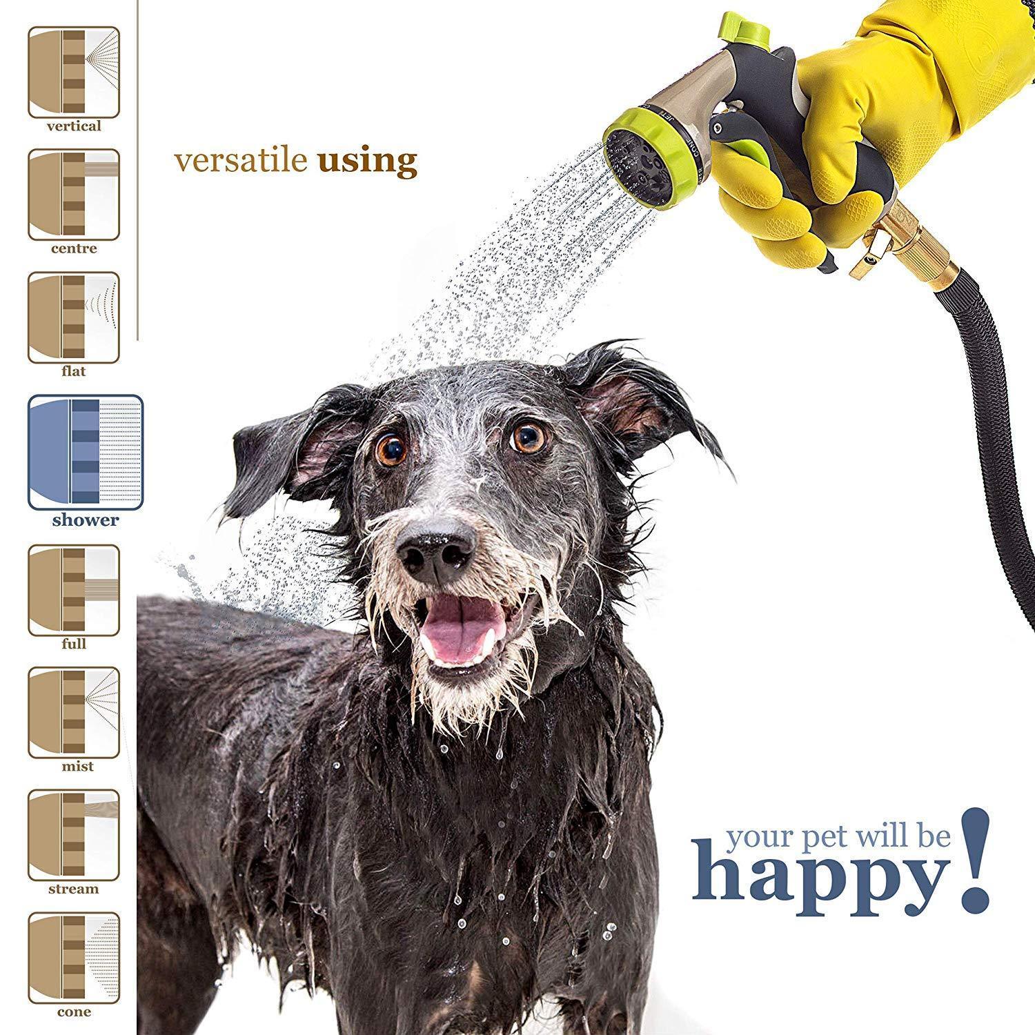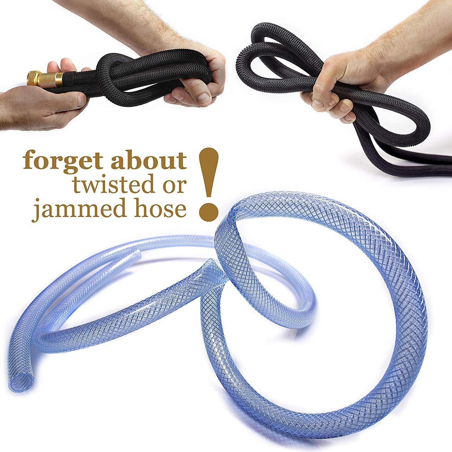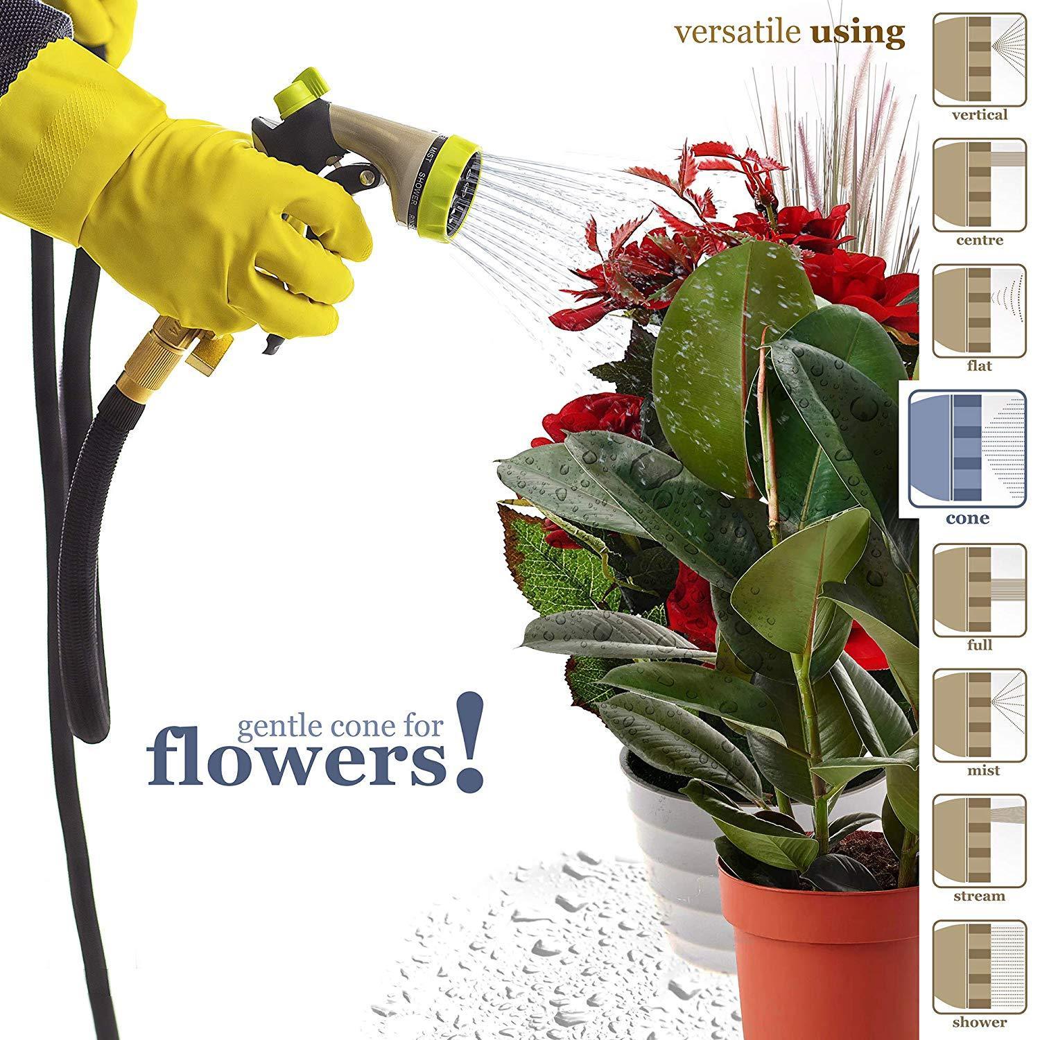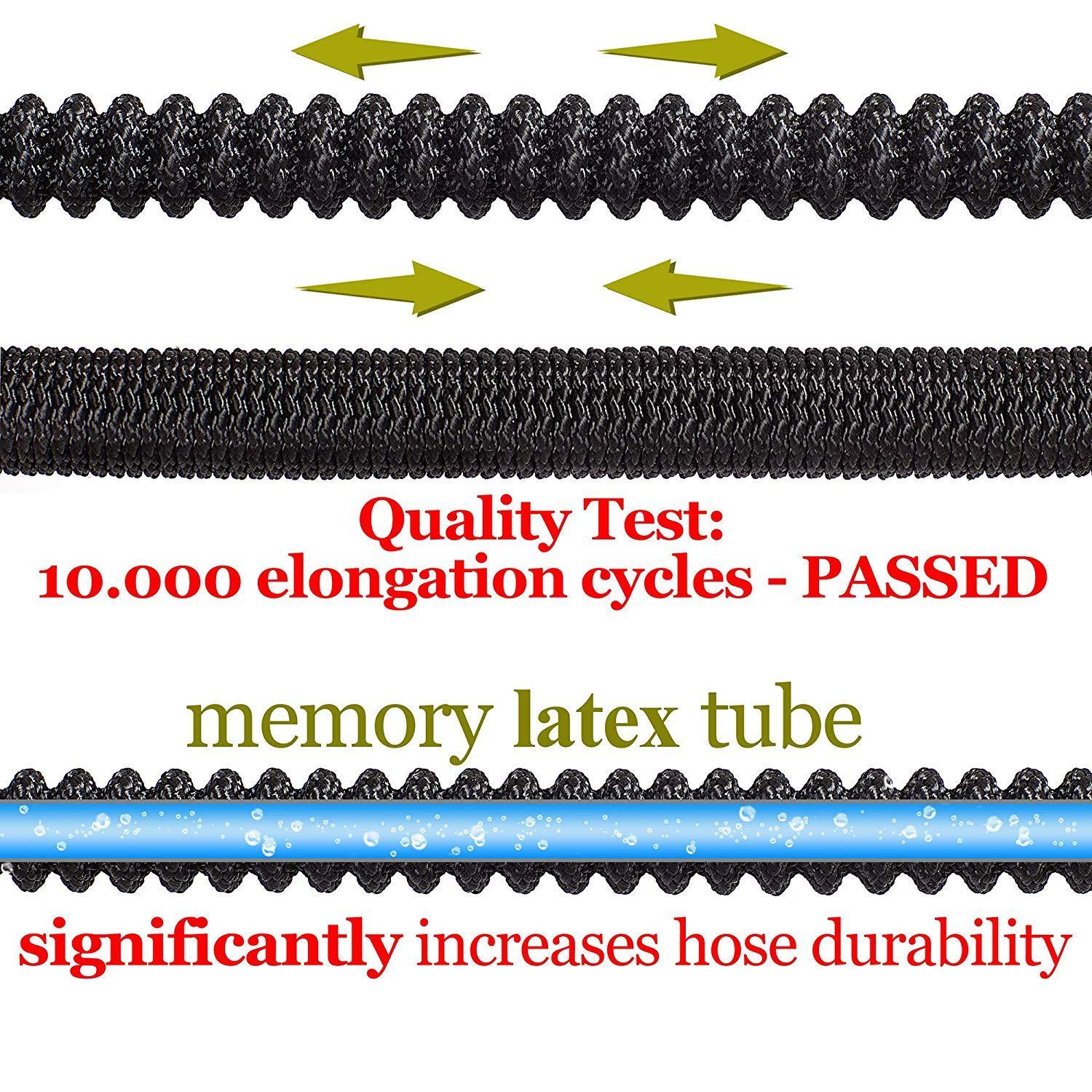 INCREDIBLE DURABILITY - no more leaks, tear or cracks: solid 3/4 Inches brass connectors, rubber washer, double latex pipe, sturdy on/off valve, zinc alloy spray nozzle, extra-flexible 3750D polyester fabric cover; the hose can withstand water pressure 3-12 Bar and temperature 41℉-113℉ - this garden hose for long-term use FLEXIBLE DESIGN - this expandable hose starts out from 34 Feet; when the water is turned on the hose quickly expands up to 3 times in length (100 Feet) with the water pressure (3-12 Bar) and returns in minutes to its original length when the water is out. Just make sure there is enough water pressure to expand the hose FREE 8 PATTERN HOSE NOZZLE - durable zinc alloy construction; the rubberized outer coating is slip-resistant and comfy; water controlling knob for changing the water pressure; rotating bezel for easy choosing kind of spray. Select right type of the stream and water plants, clean garden or pool, shower pet or wash car EASY TO STORE - lightweight, highly portable, flexible hose comes with a free storage bag - simple way to save your storage space. Just drain water from the hose when not in use, put in the bag and store out of direct sun. Besides that, the water hose in the bag can serve as a USEFUL GIFT for all gardeners
