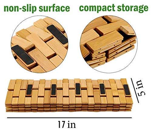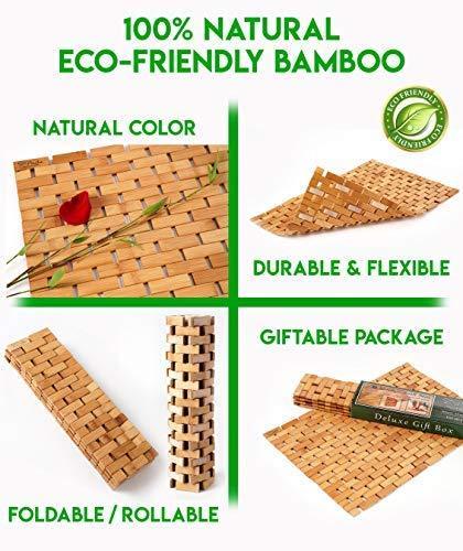 ECO FRIENDLY BAMBOO: Lighter than teak wood and stronger than plastic or rubber, our solid bamboo wood mats have a longer lifespan, would not stain, sag or bend, and also roll up for space saving storage