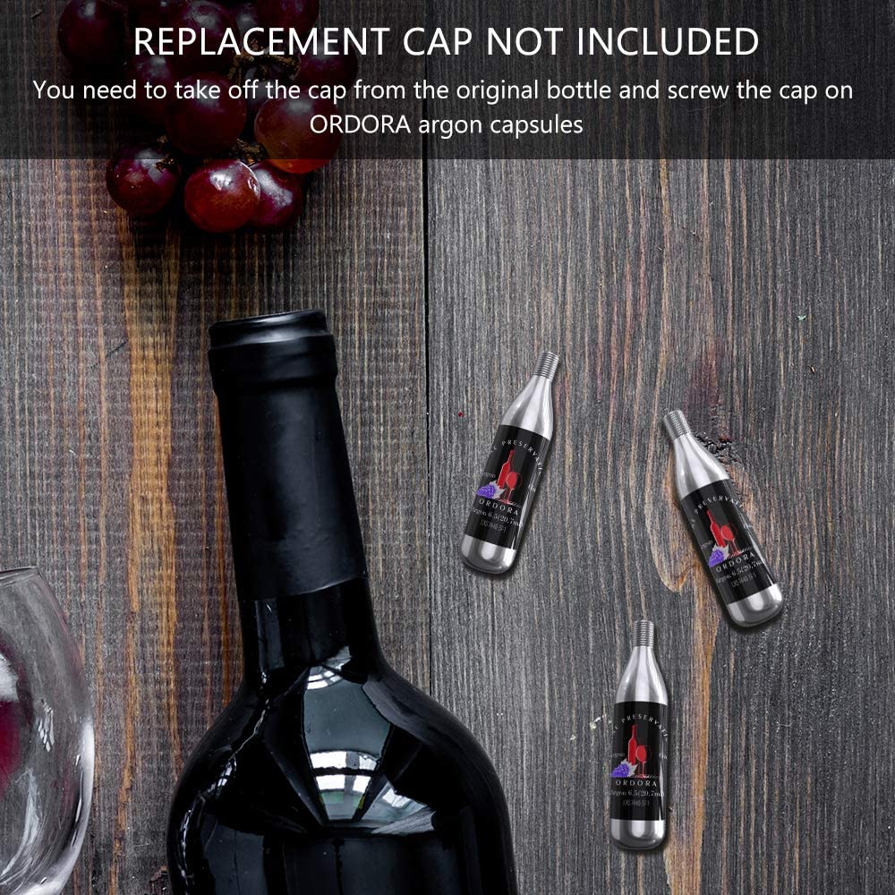 Only Compatible for Coravin Wine Preservation System: ORDORA wine preserver argon capsules compatible for Coravin Model 1 / Model Two Premium / Model One Advanced / Model Two Elite, and so on.CAP NOT INCLUDED - Only come with 3pcs * 6.5g/20.7ml argon gas capsules, not including the cap. You need to take off the cap from the original bottle and screw the cap on ORDORA argon capsules.