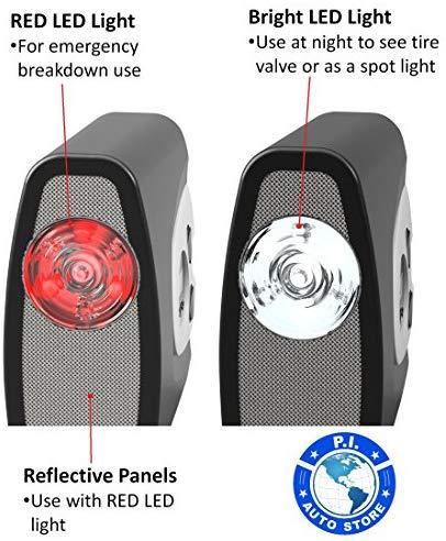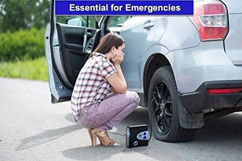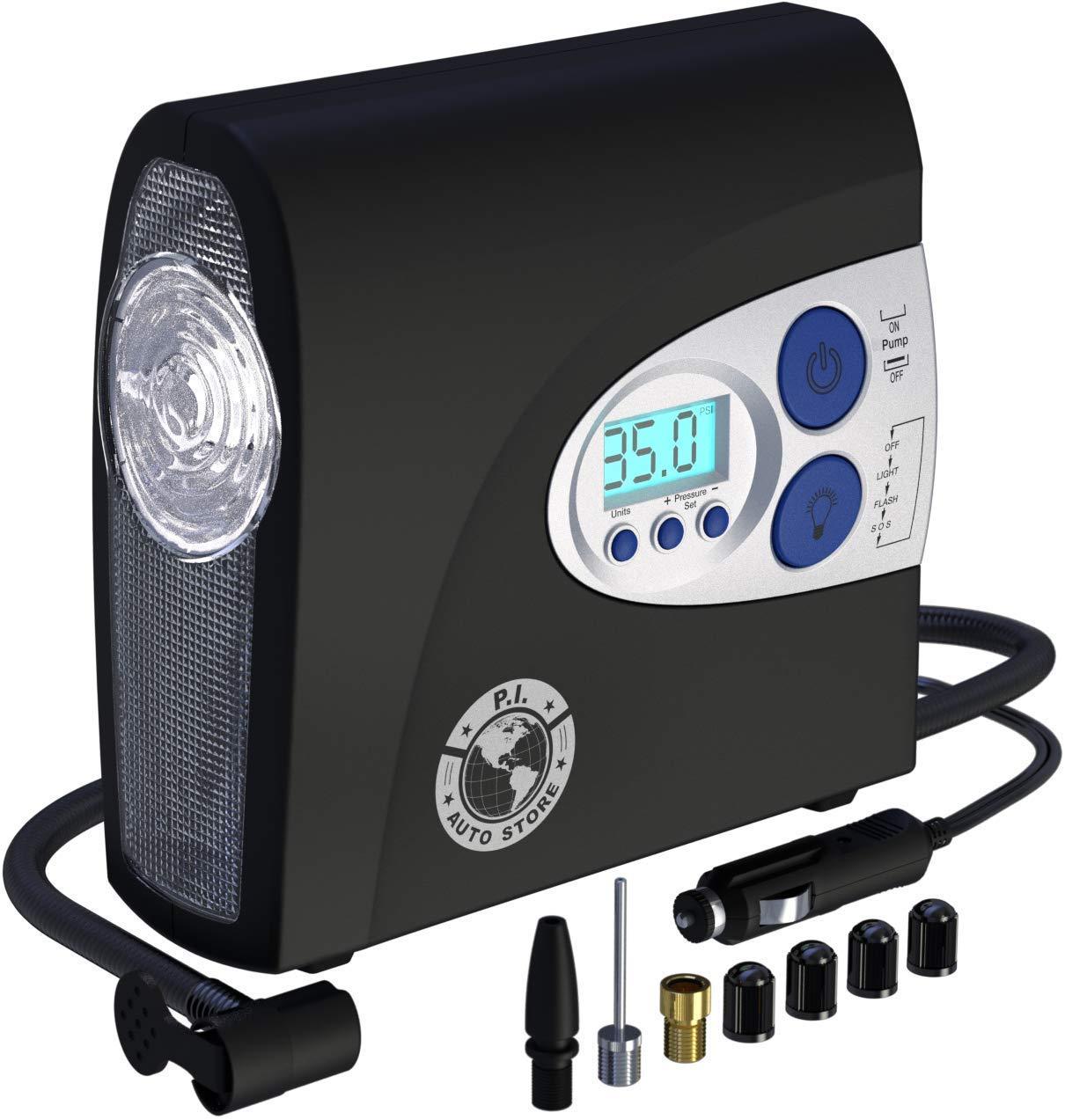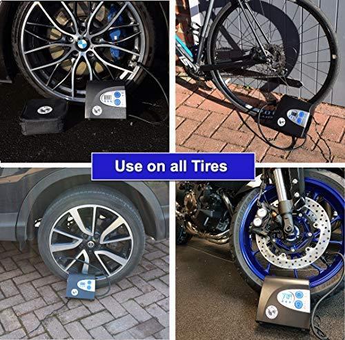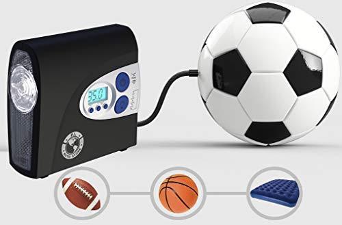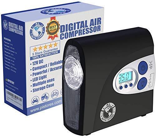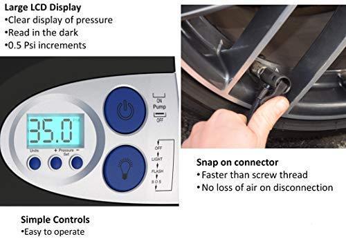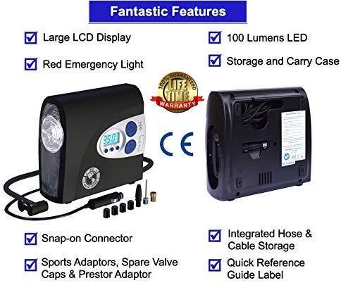PREMIUM FEATURES – New 2019 Improved Air Compressor with powerful pump generating 38 l/min air-flow. Can inflate a mid-sized car tire from flat to 30 Psi in under 3 minutes with Auto Shut Off. Digital Tire Pressure Gauge with large LCD display. Super Bright 100 Lumens LED light and Red SOS Light to be used in roadside emergency situations. VERY SIMPLE TO USE – Plug into your 12 Volt cigarette lighter socket or other 12 V outlet. Easily set pressure on the large backlit LCD display gauge, connect to tire valve with the snap on quick connector. Microprocessor monitors tire pressure and will automatically stop at your set pressure. This removes the need to keep checking the pressure and avoids over inflation. COMPACT ROBUST DESIGN - Compact design and Storage Case make it ideal for storage in your trunk. You never know when you will need it in an emergency. Longer hose and cables are fully integrated into housing. Fused to protect vehicle VERSATILE - Best for Car, Bicycle, Motorbike, RV, SUV, ATV (Not for Trucks). Also, Sports Equipment and inflatables (adaptors included). Connect to household supply with our AC/DC Converter (must be purchased separately - see offer) INCLUDED – Carry Case, 4 Spare Dust Caps, Schrader to Presta valve adaptor for bicycles tires and an exclusive Digital Guide to Tire Care. We guarantee satisfaction as you will have access our dedicated USA based customer service and get LIFETIME WARRANTY