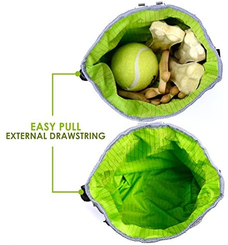 EASILY STORES KIBBLE, TOYS & TREATS: The convenient drawstring securely holds in generous amounts of dog training treats, accessories, and dog toys. Enjoy the easy to clean bright green lining which makes it simple to spot pet treats right when you need them. Perfect for dog training at the park!