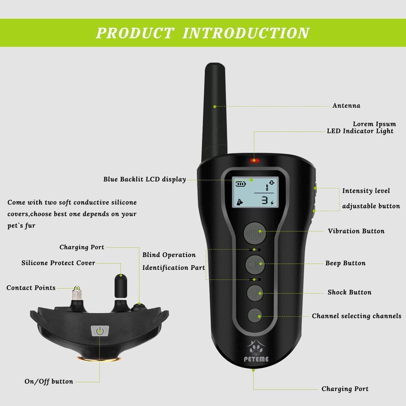 【3 TRAINING MODES TRAINING COLLAR】- Peteme electronic dog training collar provides 3 extremely efficient and safe training modes (beep, vibration and shock modes) for you to teach a dog basic obedience commands and solve an uncontrollable dog's behaviour problems.The dog training collar is easy to learn and quick operate.