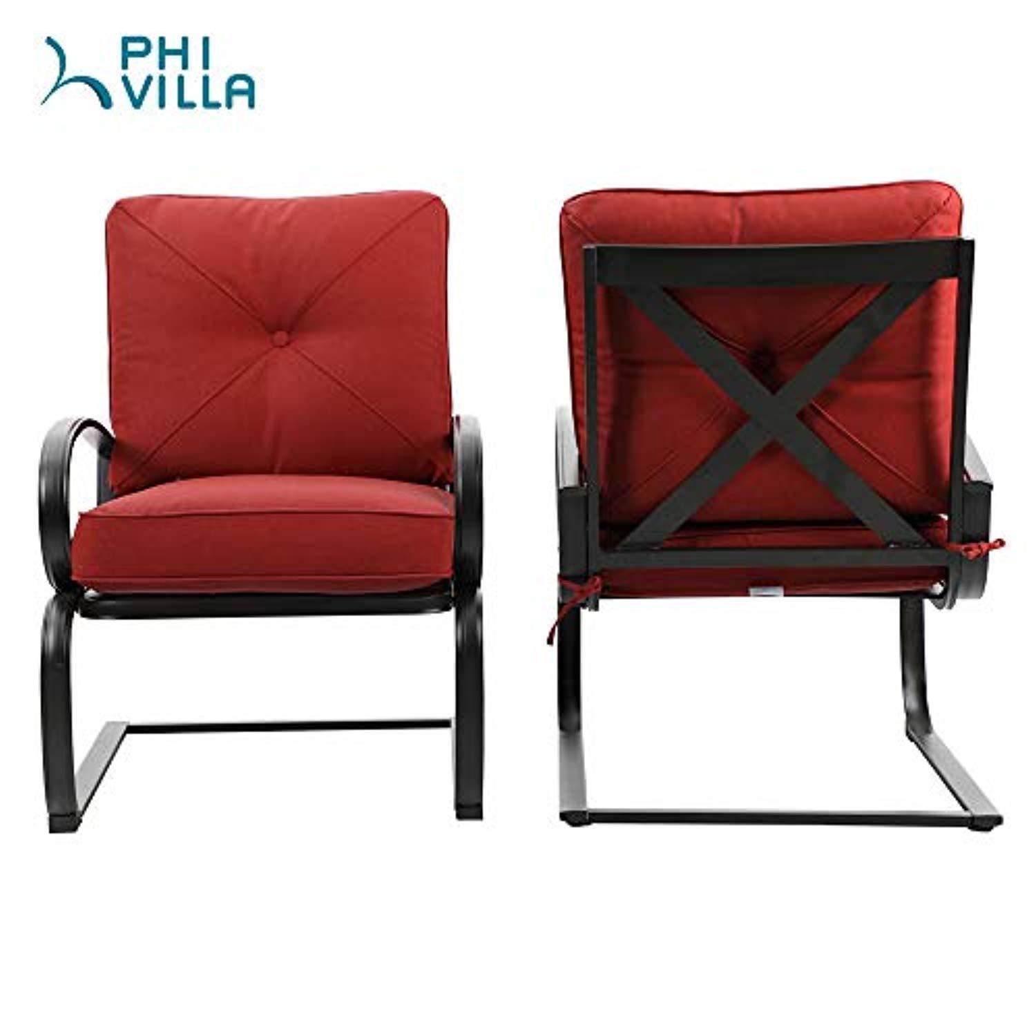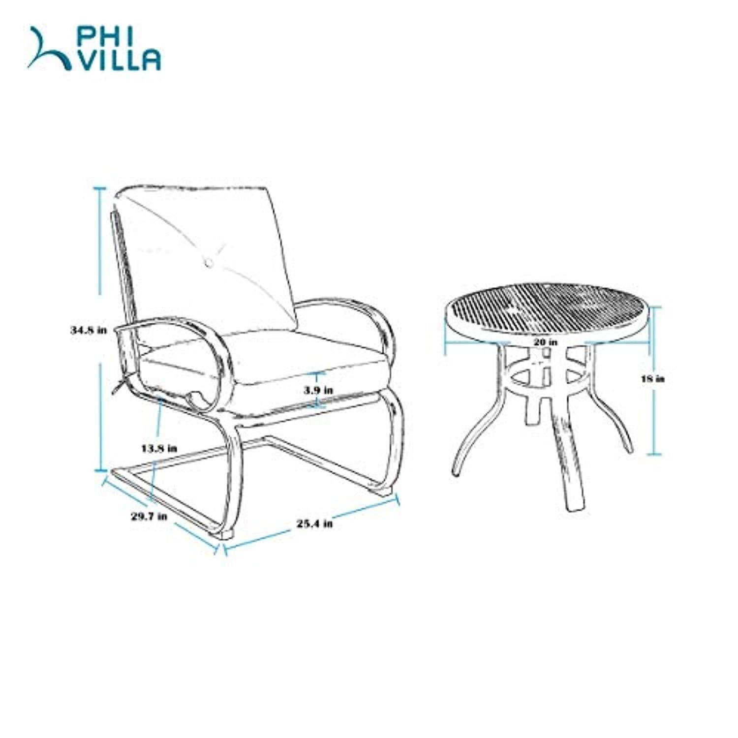 Heavy duty metal chair frame uses e-coating for rust resistant,weather resistant and easy to clean when outdoor use,thickened tube prevent the chair from changing shape by your frequent rocking; Back of the chair is using Big‘X’design and the widen upper and lower frame brings strong visual impact.It still feels great when not using pillow.C-spring elastic buffer can add more comfort and leisure feeling; Table with honeycomb top and retro frame is sturdy and durable; Cushions are made with water-resistant,and UV-treated,mildew,fade and stain-resistant cover,allowing easy cleaning of accidental spills or blemishes caused by the elements;