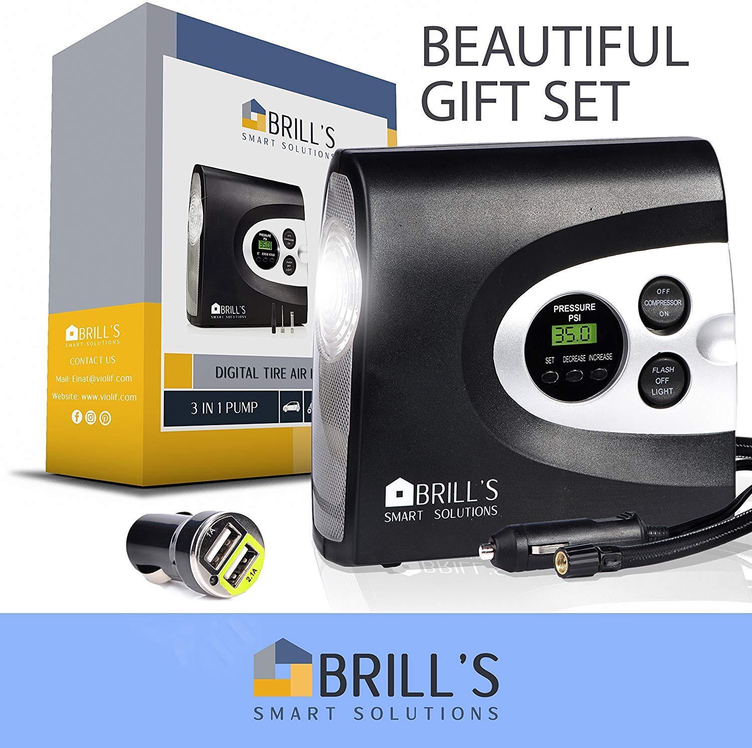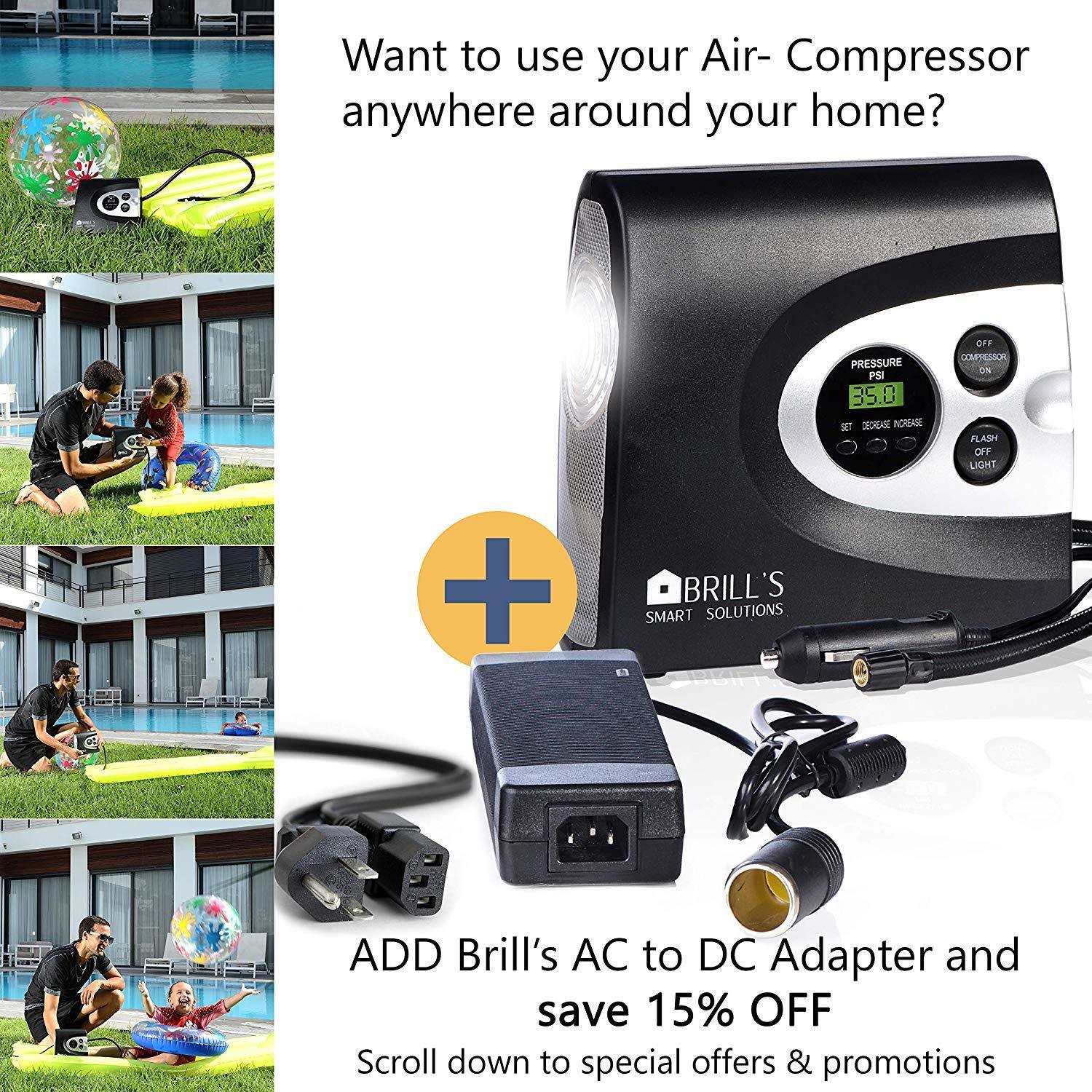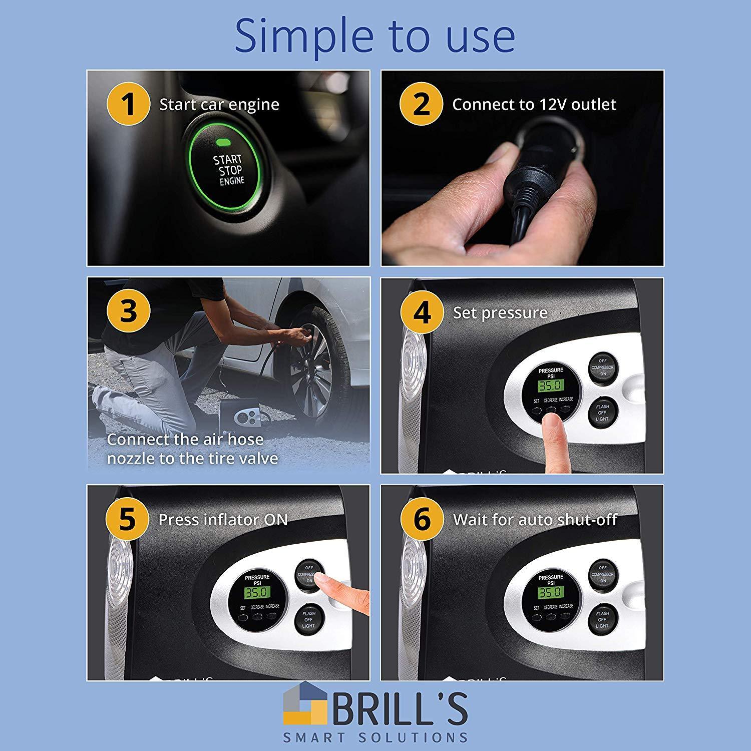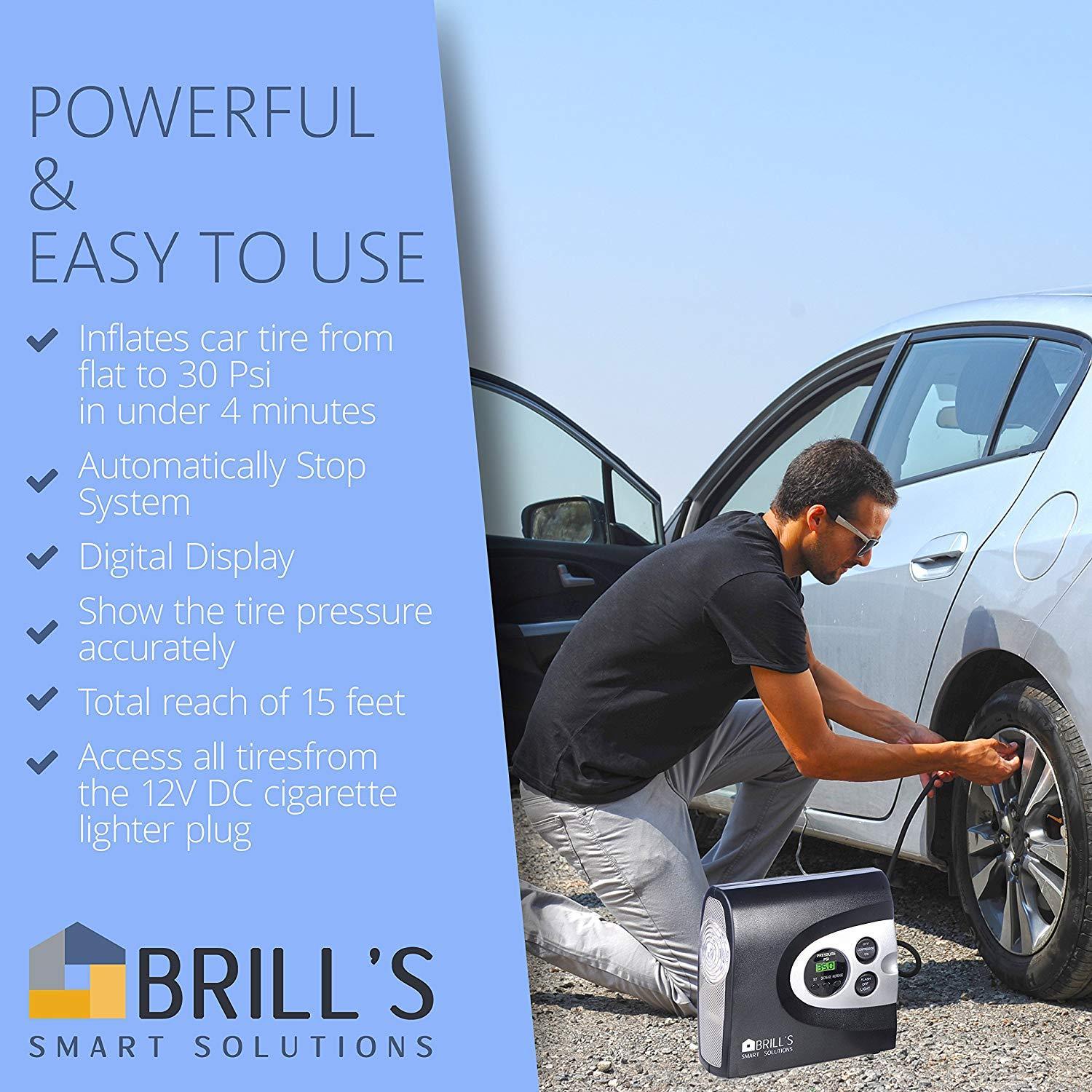 ✔ 𝗡𝗢 𝗠𝗢𝗥𝗘 𝗟𝗢𝗢𝗞𝗜𝗡𝗚 𝗙𝗢𝗥 𝗚𝗔𝗦 𝗦𝗧𝗔𝗧𝗜𝗢𝗡𝗦 - Portable air compressor Tire Inflator Capable to inflate a midsize car tire from flat to 30 Psi in under 4 minutes, Pump up To 150 psi. Compact and portable but still powerful. ✔ 𝗠𝗨𝗟𝗧𝗜𝗨𝗦𝗘 - 𝗖𝗔𝗥𝗦 - 𝗕𝗜𝗞𝗘𝗦 - 𝗜𝗡𝗙𝗟𝗔𝗧𝗔𝗕𝗟𝗘𝗦 - Helps you inflate your car tire, Bicycle, Motorcycle, Sports Equipment and Inflatables. Does not support Truck tires. 𝗦𝗜𝗠𝗣𝗟𝗘 𝗧𝗢 𝗨𝗦𝗘 – Monitors tire pressure, automatically stopping at the precise pressure you set (+/- 1 Psi). Bright back-light digital LCD display gauge helps you read the pressure in the dark easily. Total reach of 15 feet will access all tires on your vehicle from the cigarette lighter plug.