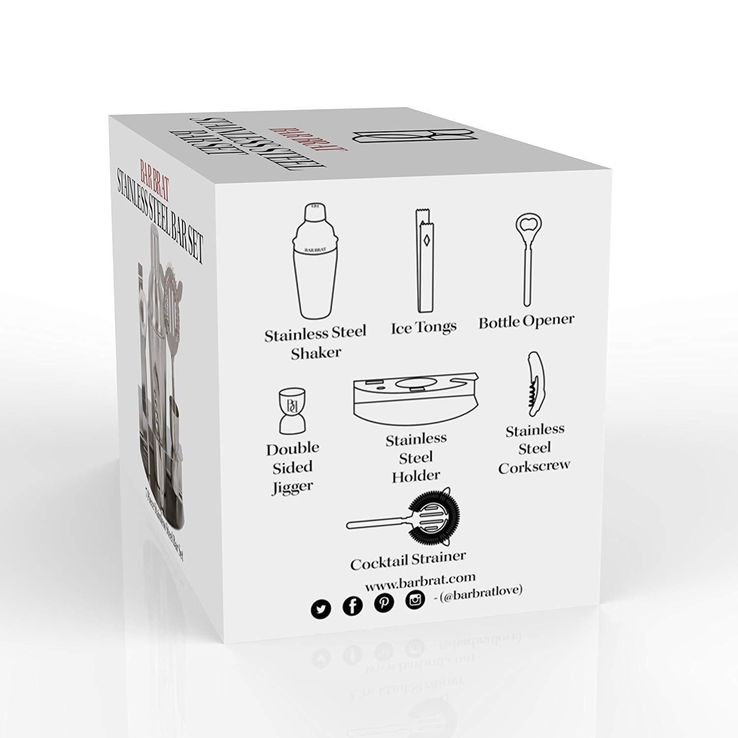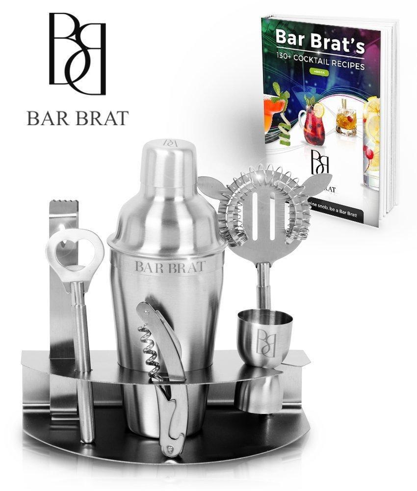 ★ 7 PIECE BAR SET MAKES 6 - 10 DRINKS - As a trusted brand with many bar products, Bar Brat provides a complete bundle set - Includes 3 Piece Drink Shaker that is a 24 ounce cocktail shaker set with strong Built-in Cocktail Strainer and a Bonus Double size 1 & ½ oz. jigger ★ LONG LASTING BAR KIT - Made of the strongest stainless steel thus it is very strong. Our premium and protected packaging makes the Bar Brat cocktail shaker set the perfect holiday gift and christmas gift. ★ PERFECT SHOW PIECE FOR ENTERTAINING - Impress your friends with your bar kit and the pre built stand. And after the part, everything is easy to clean and dishwasher friendly. ★ ELEGANT GIFT PACKAGING - Our packaging is elegant and makes this cocktail shaker set the perfect holiday gift and christmas gift for anyone. ★ 100% LIFETIME MONEY BACK GUARANTEE - If you are not fully satisfied with your cocktail shaker, we will refund you your purchase. No questions asked. Add to cart and you will not be disappointed. 101 Cocktail Recipe Ebook To Be Emailed Immediately After Product Is Shipped
