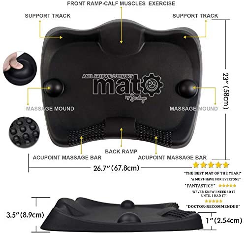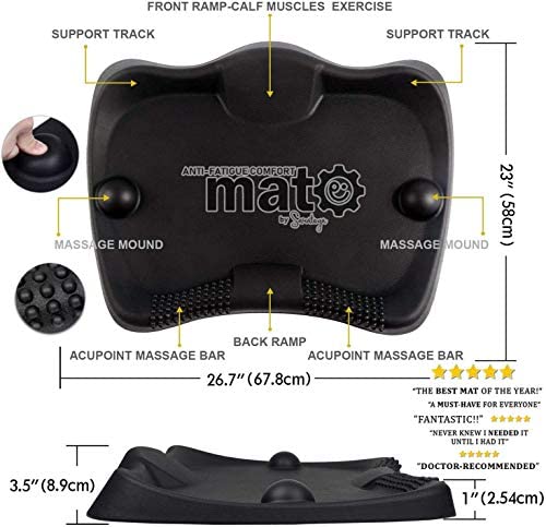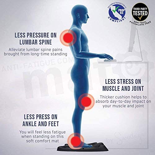 ✔ BURN CALORIES & INCREASE PRODUCTIVITY – Have you heard that recent studies say that sitting is the NEW smoking? Our anti-fatigue standing mat makes sure you’re moving while working, burning more calories compared to sitting all day, and you can stand for longer period of time for better work productivity. Ours come with a free premium massage ball ($15 value) that you can roll under your tired feet to iron out knots, relieve tightness, & and improve circulation. ✔ YOU CAN'T GO BACK TO NORMAL MAT – Standing all day long on a normal mat is boring and draining. This is why we’ve created our anti fatigue standing mat. It helps relieve the burden and pressure from standing or sitting all day so you can stand longer without fatigue or aching feet and legs. The 3D features included on our kitchen/office mat promotes continual foot movement for your health. ✔ HOME & OFFICE WORKSPACE – You can keep our mat under your desk to easily transition from sitting to standing. The non-slip mat has anti-skid surface, so you don’t have to worry about slipping. Our mat also offers the perfect amount of space to promote continual active foot movement, and is the perfect choice for nearly any workspace, such as your home, office, classroom, kitchen, and more! ✔ ERGONOMIC & COMFY – Our comfort foam is designed to encourage movement and stretching, unlike regular kitchen mats. With a custom front and back ramp calf exercise, support tracks, massage mounds, and acupoint massage bars, your body can enjoy the full benefits of a standing anti-fatigue mat! ✔ 100% MONEY-BACK GUARANTEE – Saratoga products has 100% money back guarantee. We are committed to excellence. Either you are fully satisfied with your product or receive your money back. Please contact us if you experience any issues, because customer satisfaction is our #1 priority!