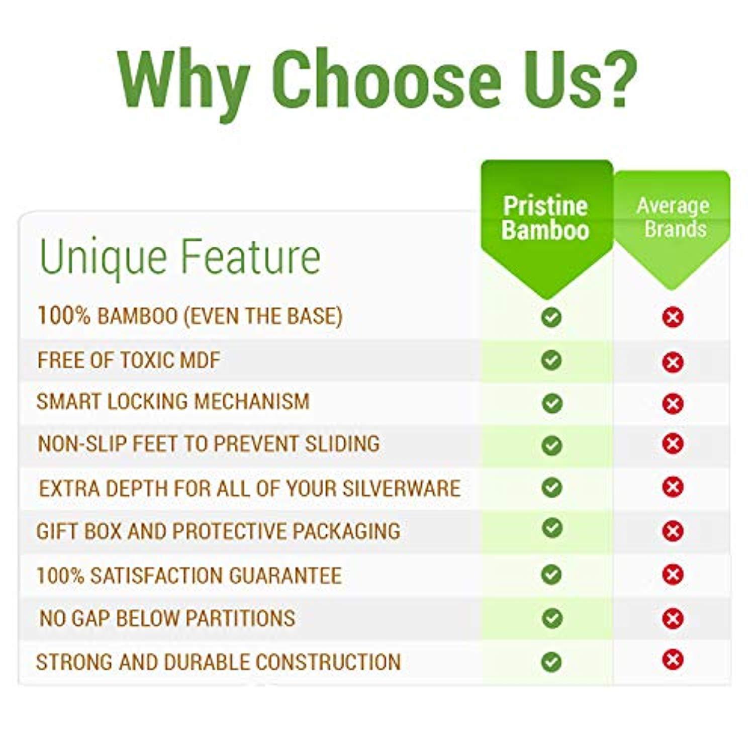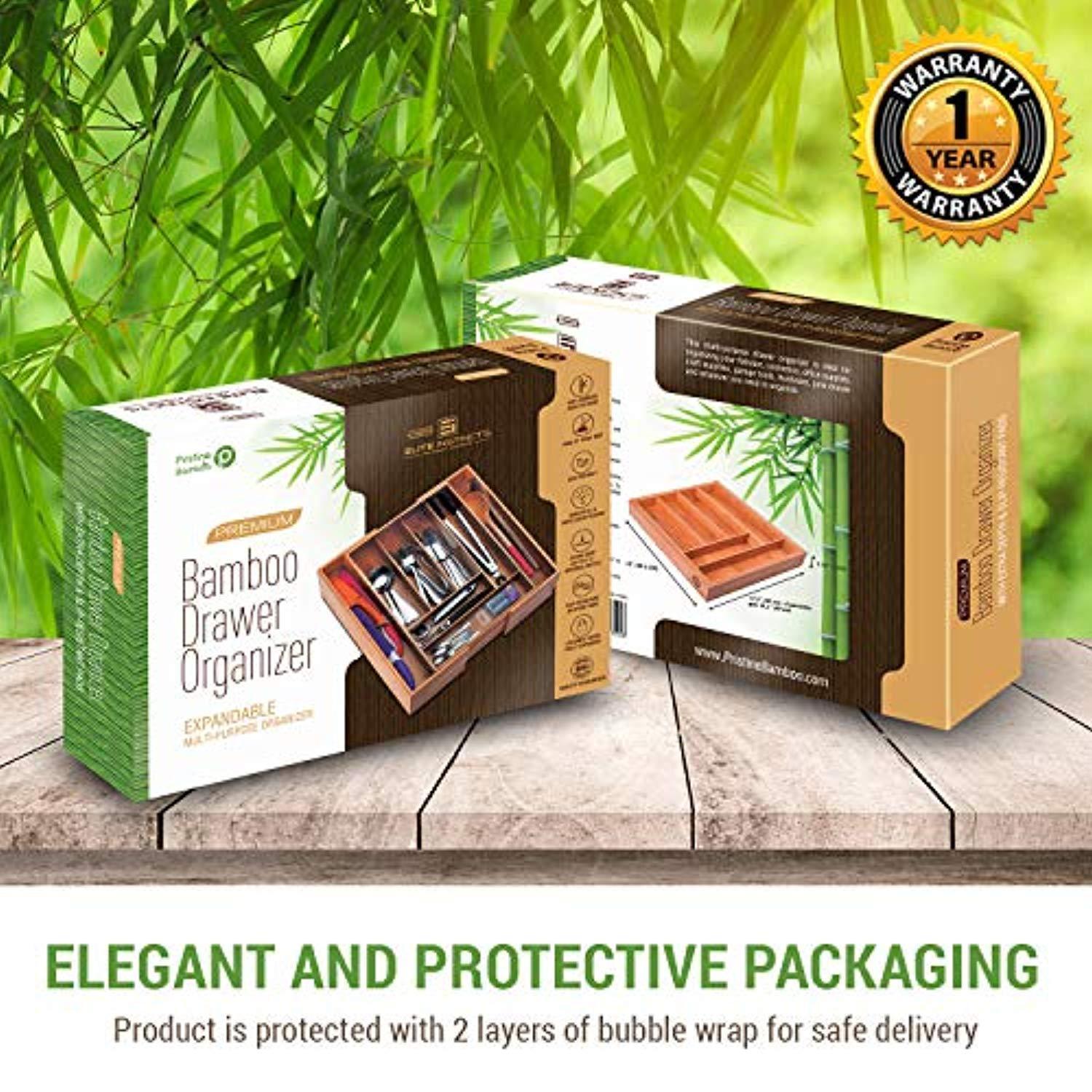 ✔ SUPERIOR DESIGN SOLUTIONS: The only drawer organizer that offers all-in-one features: 100% bamboo (even the base), No Toxic MDF, Smart Locking Mechanism, Slip-resistant, Extra Depth, Strong & Durable, Large Size, Beautiful Box, Protective Packaging & 100% satisfaction guarantee. Yes, this costs a little extra; however this is undoubtedly the best drawer organizer available and our "Verified Purchase" reviews are testament of our quality. You will never regret this investment.