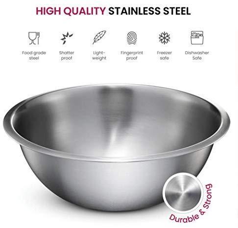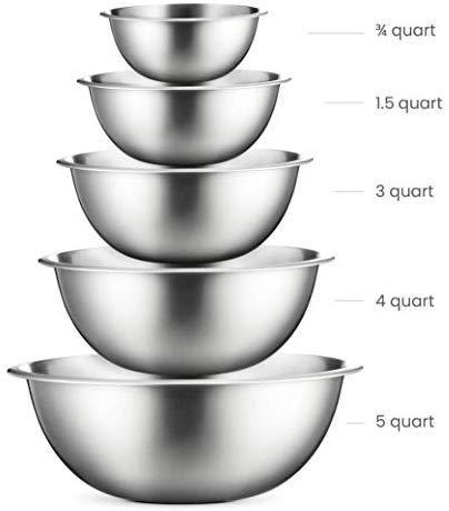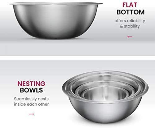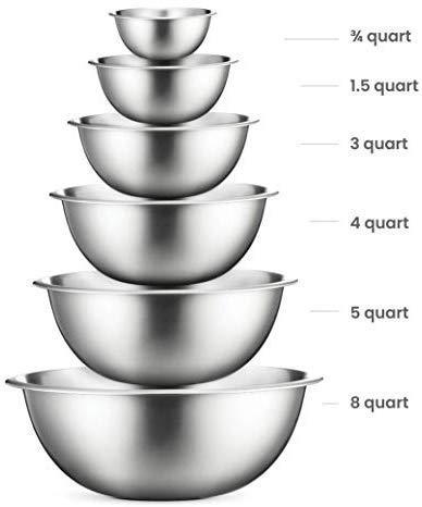 SIZED for EVERY TASKS - with range of 6-Sizes ¾, 1.5, 3, 4, 5 and 8 quart metal mixing bowls adds versatility and functionality to your kitchen, for all-purpose kitchen workhorses from prepping, mixing, stirring, to kneading dough like a pro. QUALITY STAINLESS STEEL - features an attractive mirror finish, for an elegant look enhancing your kitchen tools, these metal bowl set are easy to clean, as well as odor, stain and taste resistant. DURABLE yet LIGHTWEIGHT - Our lightweight stainless-steel bowls; ideal for everyday tasks, are made from freezer- and dishwasher-safe, durable shatterproof materials, to last a lifetime. ERGONOMICALLY DESINED - The wide rolled rims allow for drip-free pouring and a solid grip. Flat bases provide balance and stability for tossing salads, whipping creams etc. Capacity marked outside bowls for easy identification. NEST for SPACE SAVING - These salad bowl or serving bowls seamlessly nests together and offers space-efficient storage helps declutter kitchen cupboards