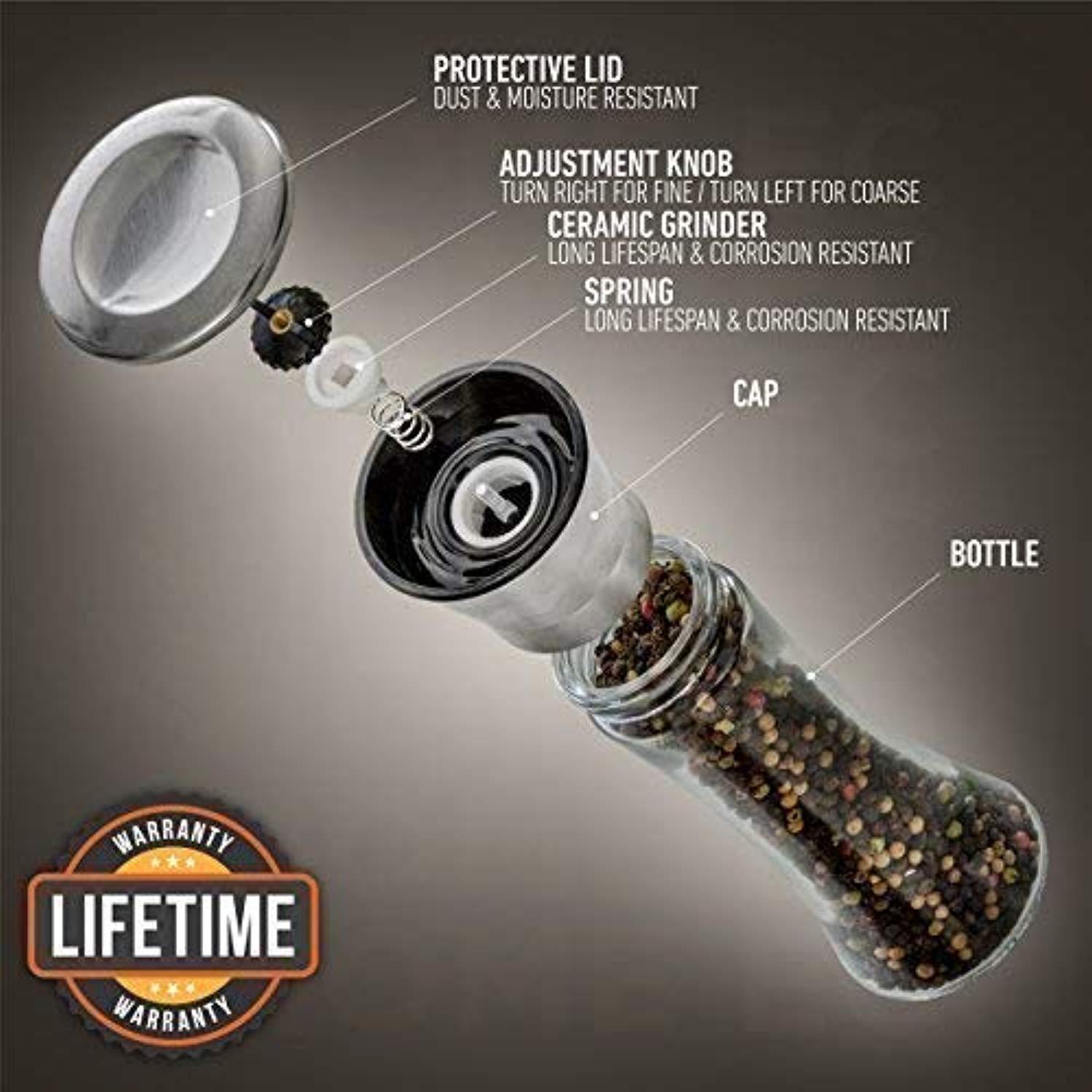 Premium Stainless Steel Salt and Pepper Grinder Set of 2 - Adjustable Ceramic Sea Salt Grinder & Pepper Grinder - Tall Glass Salt and Pepper Shakers - Pepper Mill & Salt Mill with Free Funnel & EBook by Home EC